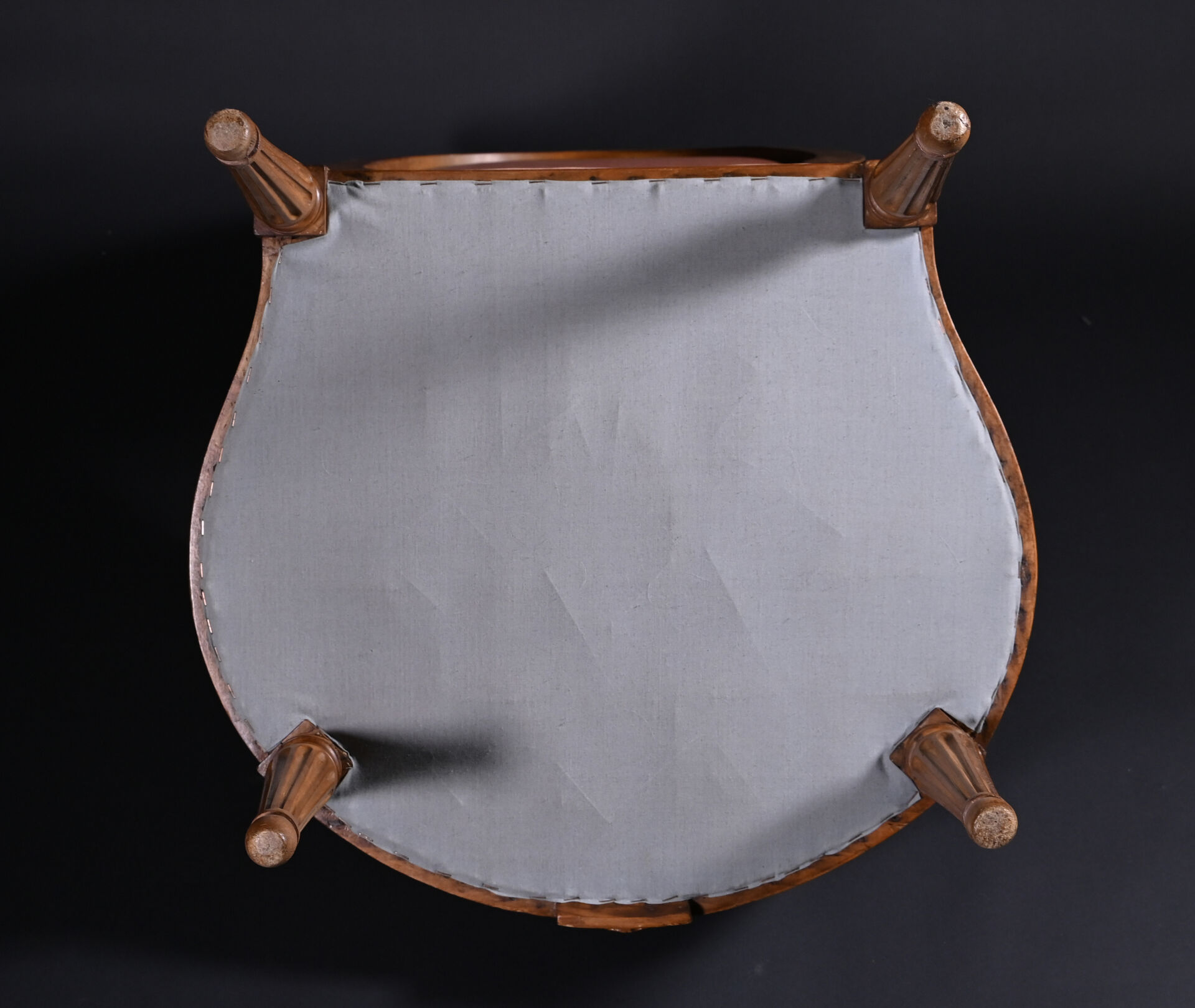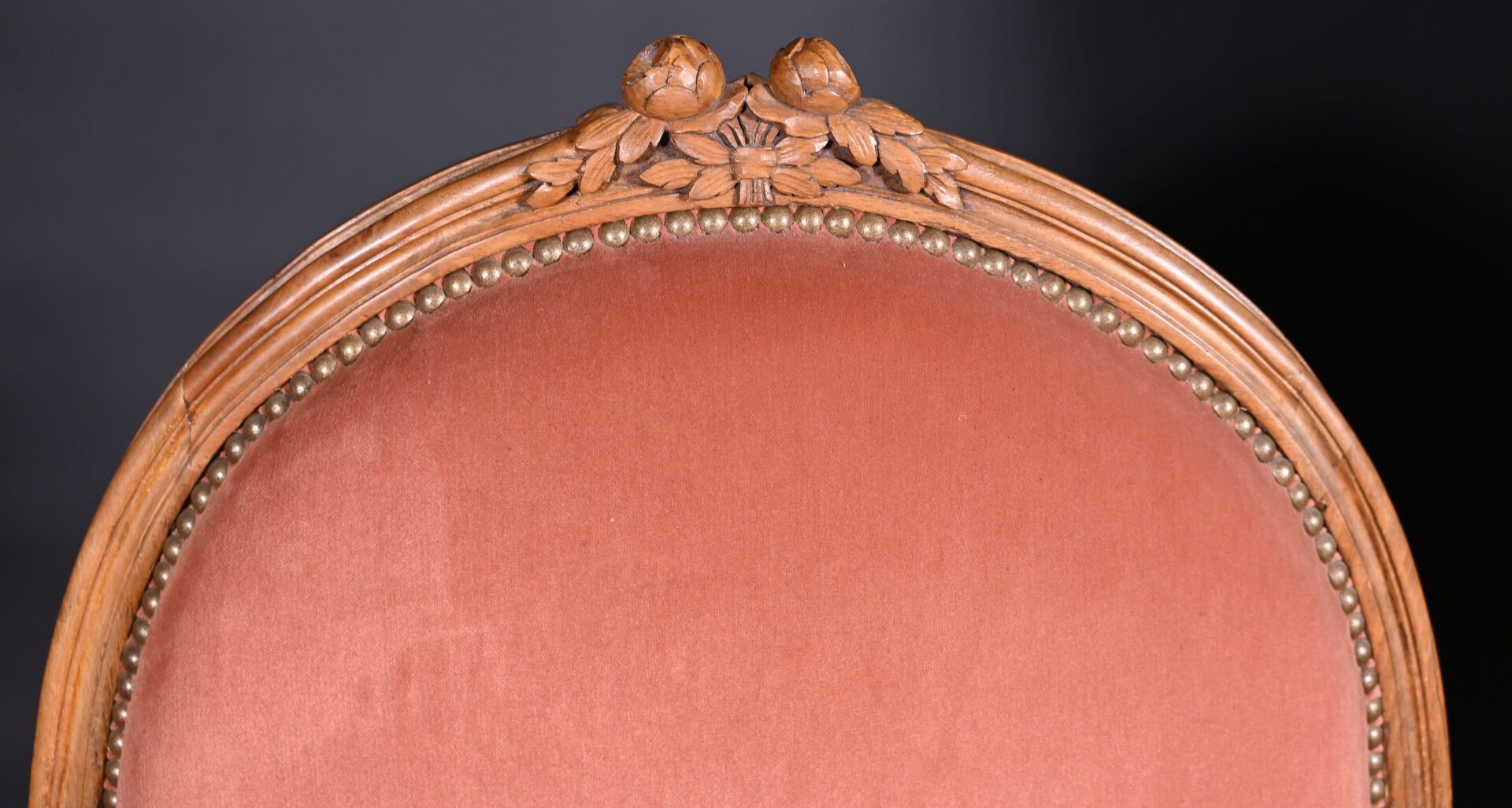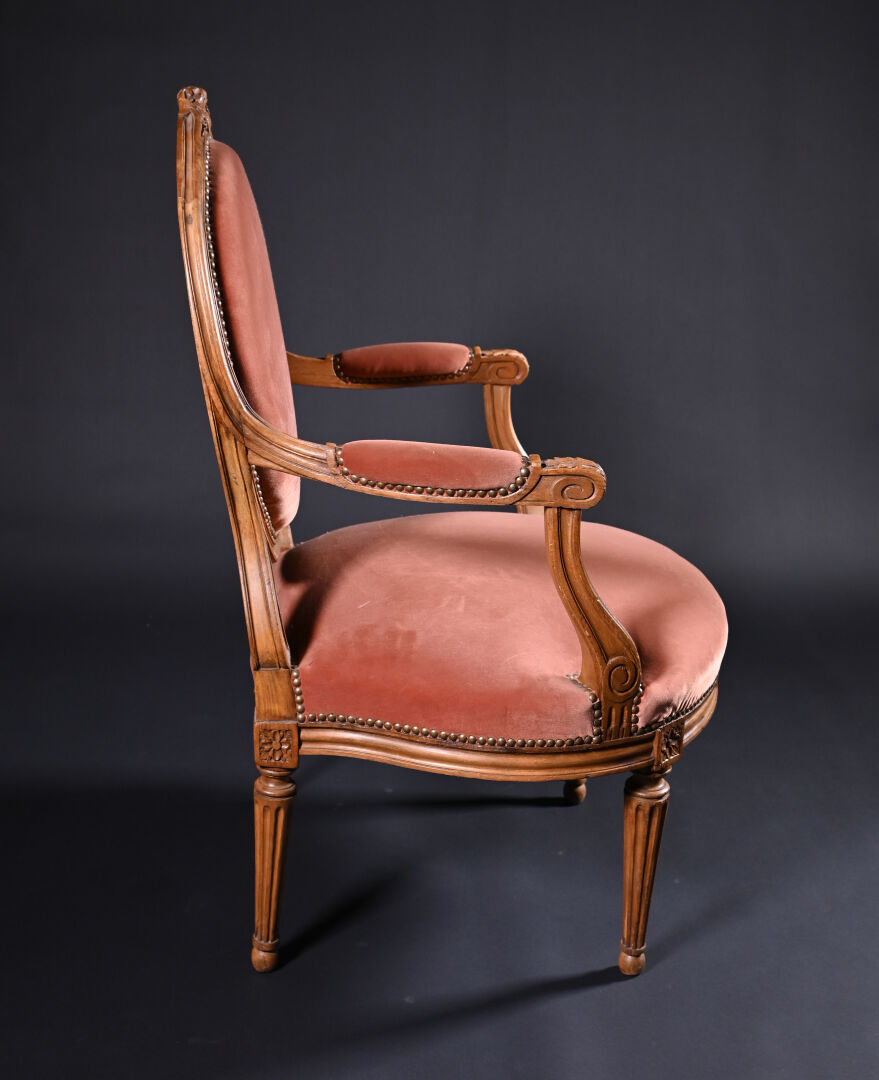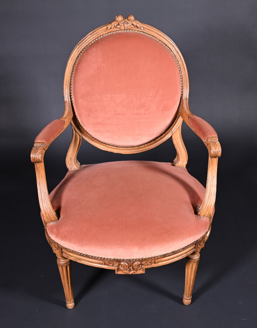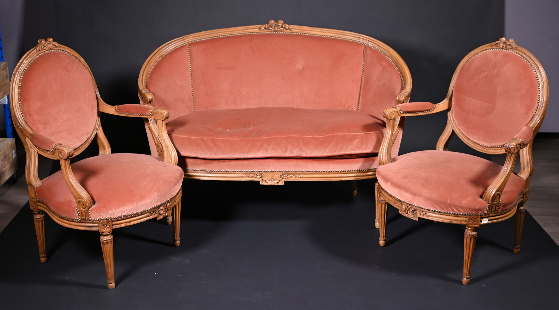 Mobilier de salon en bois mouluré sculpté à décor de roses, cannelures, les pieds fuselés cannelés comprenant un canapé corbeille et une paire de fauteuils à dossier médaillon (usures d’usage, manques). Style Louis XVI. Garniture de velours vieux rose et rose pâle. Dim. canapé : Haut. : 98 cm – Larg. : 137,5 cm – Prof. : 66 cm, Haut. fauteuils : 98 cm.