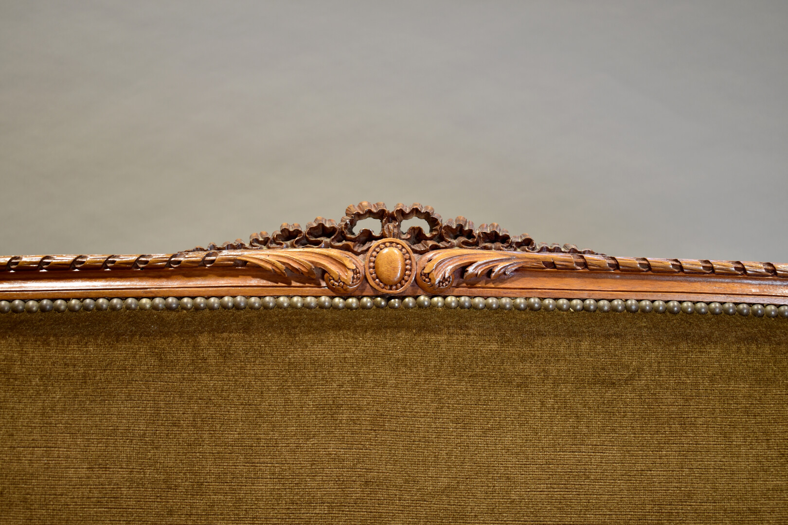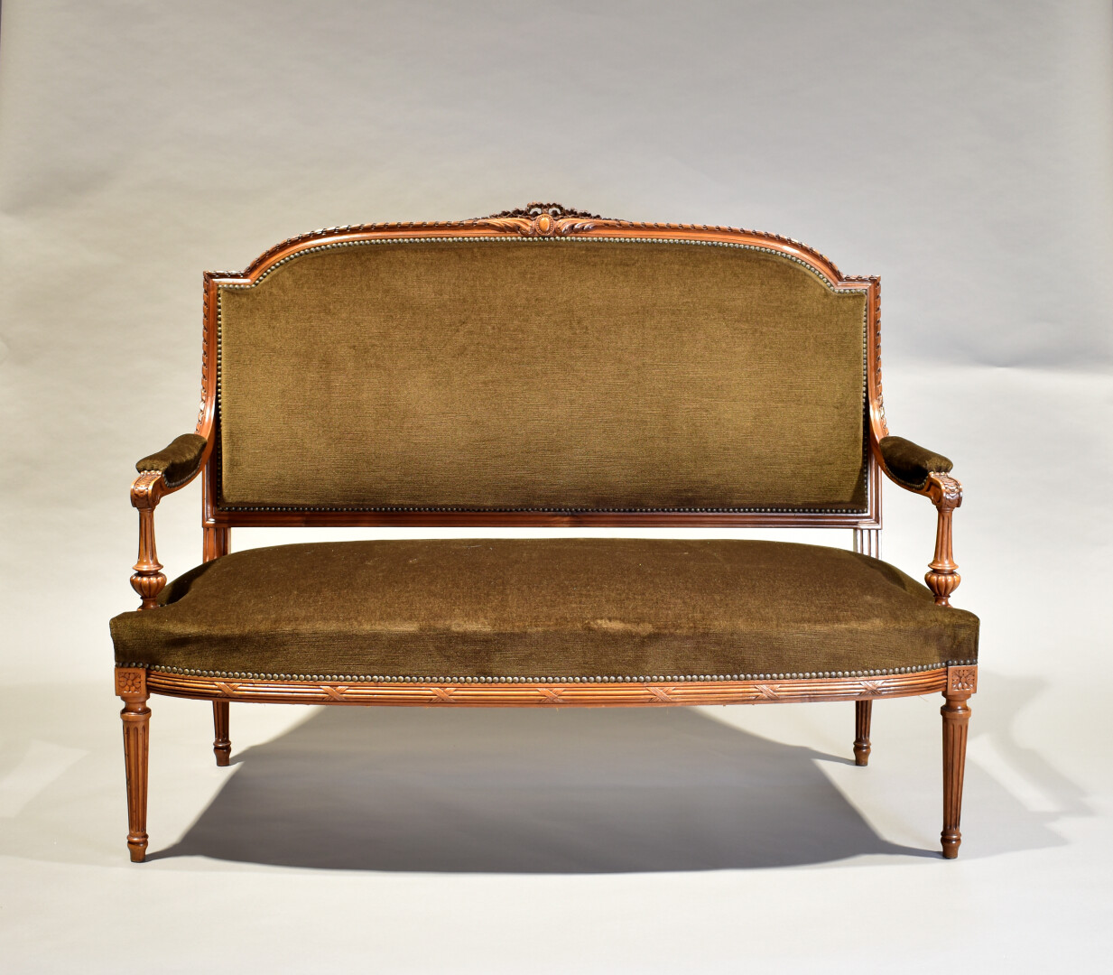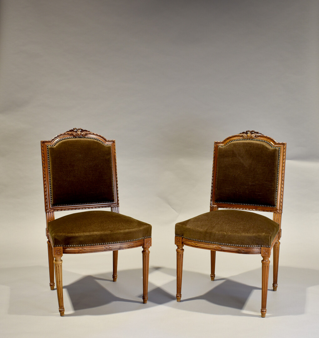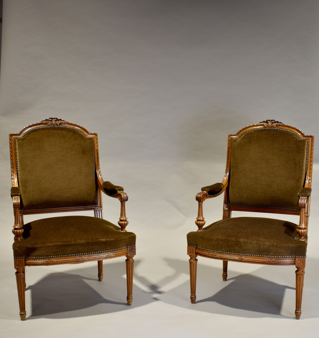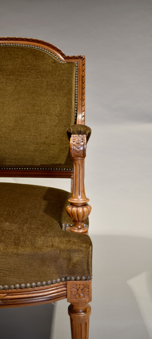 Mobilier de salon en noyer sculpté, les dossiers en anse de panier à décor d’un médaillon, pieds fuselés cannelés. Garniture de velours brun. Il comprend une banquette, une paire de fauteuils, une paire de chaises. Style Louis XVI, XXe siècle. Dim. banquette : Haut. : 107 cm – Larg. : 132 cm – Prof. : 61 cm.