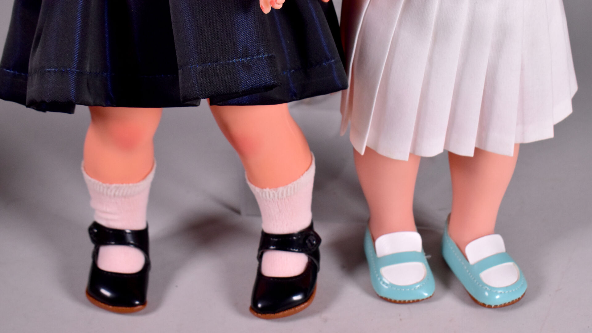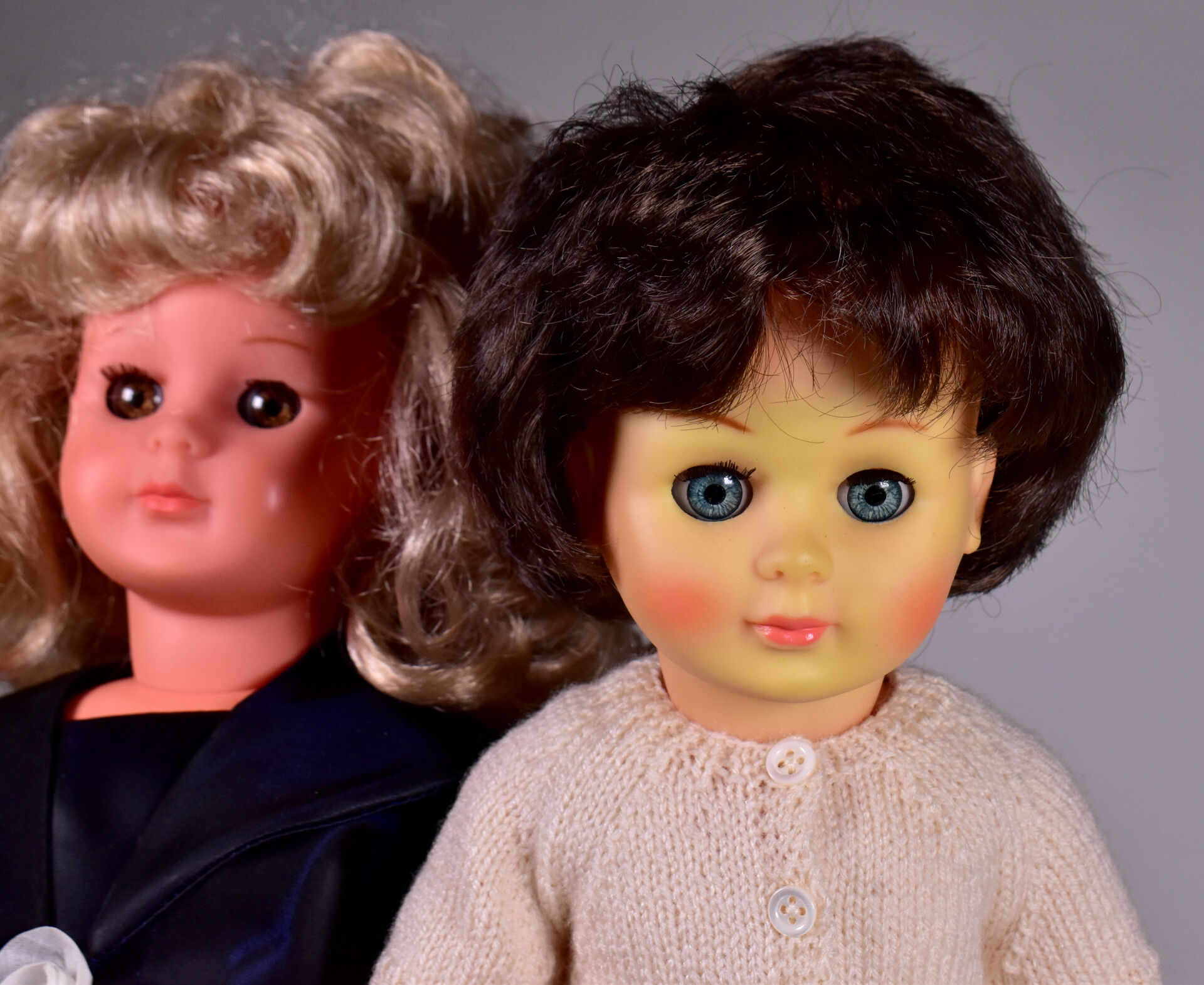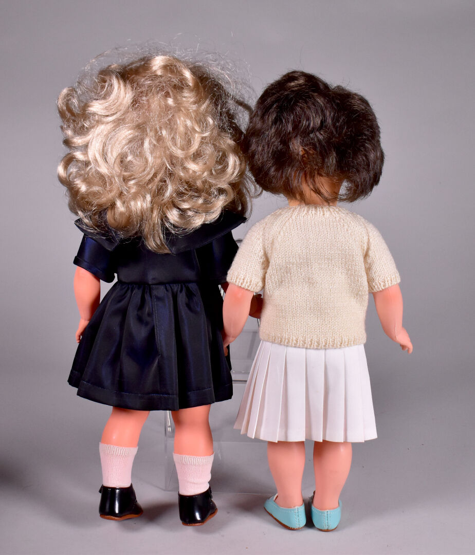 Modes et Travaux 2 poupées Marie Françoise dont une marqué Marie Françoise sur la tête dans l’implantation des cheveux yeux bruns basculants cheveux blonds souples vêtements et chaussures mode et travaux, et une autre cheveux bruns marqué made in France dans le haut du dos visage décoloration importante