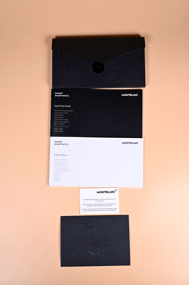 MONTBLANC. Montre connectée modèle SUMMIT S3T22, boitier en acier noirci, bracelet en caoutchouc noir. Avec Chargeur, boite et documents. Démarre.