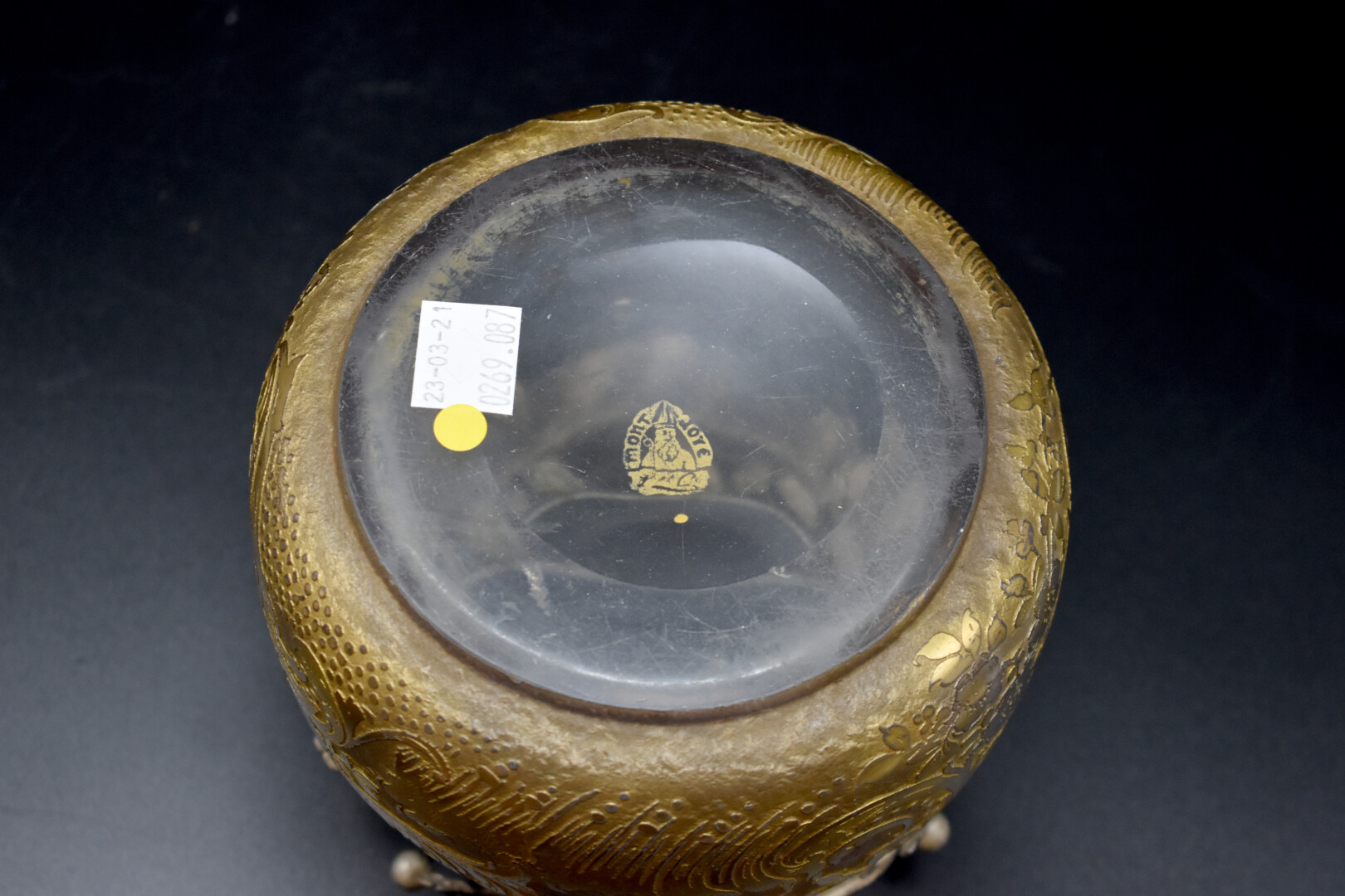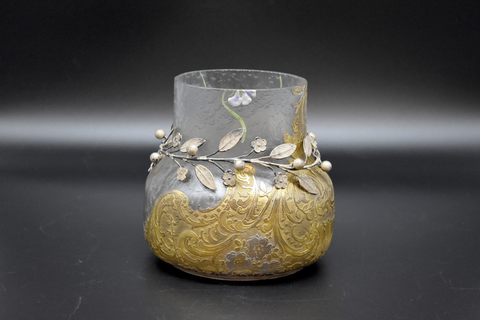 MONTJOIE. Vase en verre à décor émaillé en polychromie de fleurs et dorrure sur fond givré (coupé). Vers 1900. Marqué sous la base. Haut. : 14 cm.
