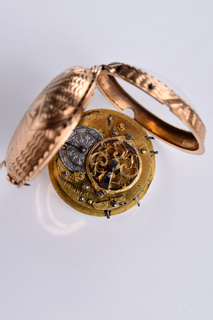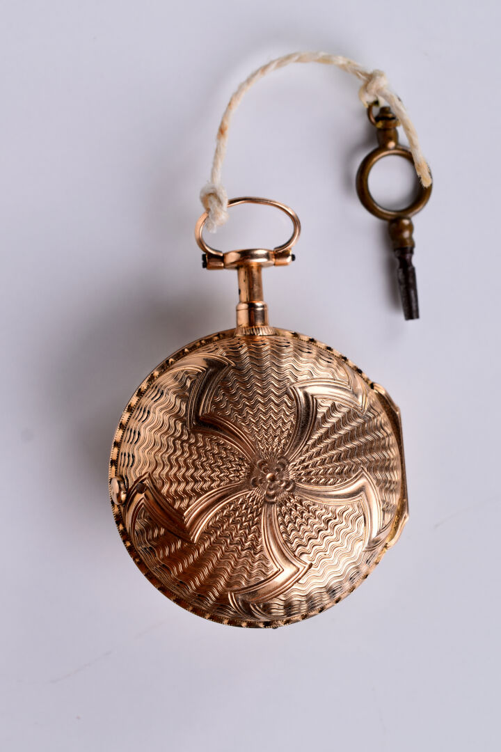 Montre à coque en or légèrement rosé 18K 750/1000e. Décor en ciselure et traces d’émail noir. Mouvement signé GIROD à Paris. Cadran émaillé légèrement abîmé. Un jeu au fermoir (chaîne du mécanisme accidentée). XIXe siècle. Poids brut. : 88,8 g. Avec sa clé en métal.