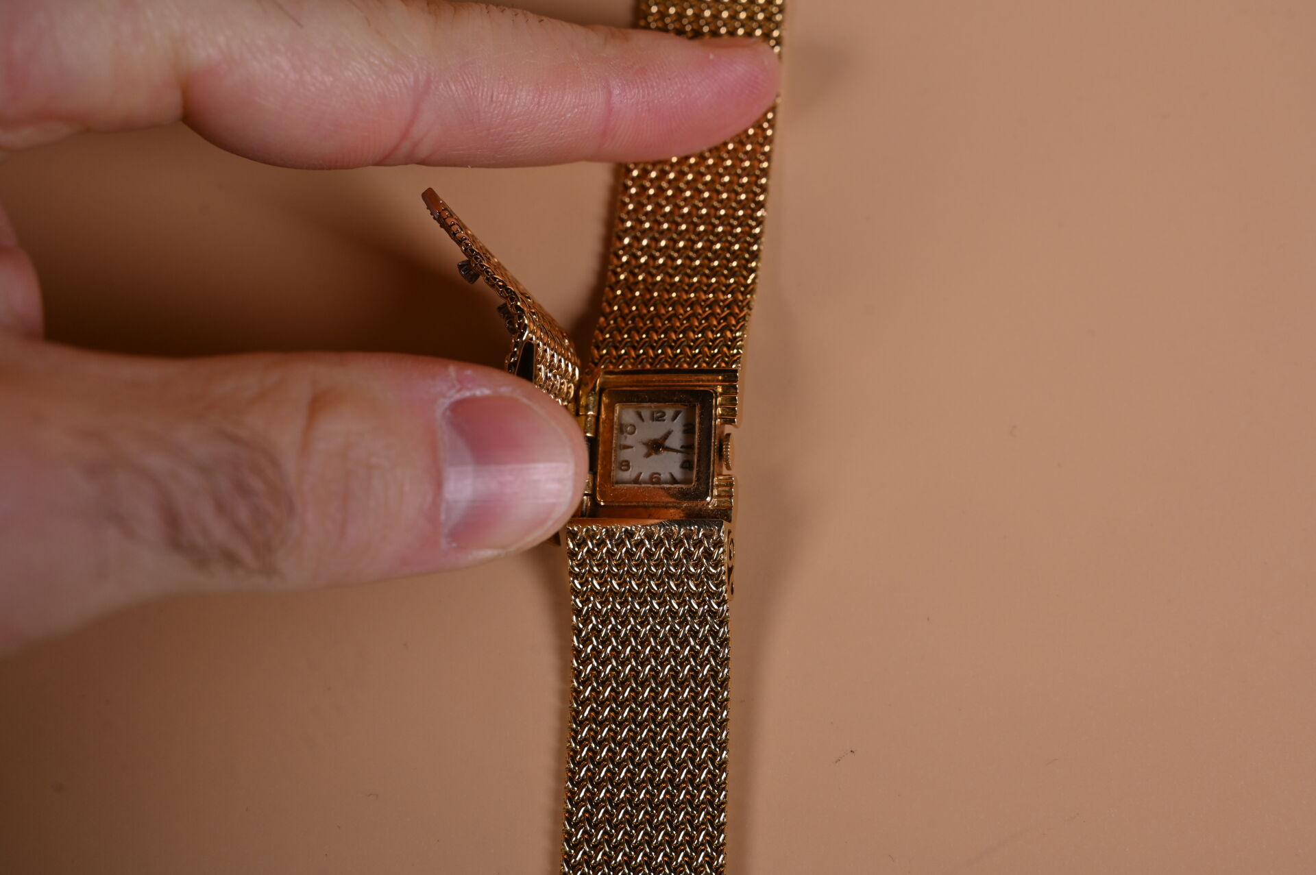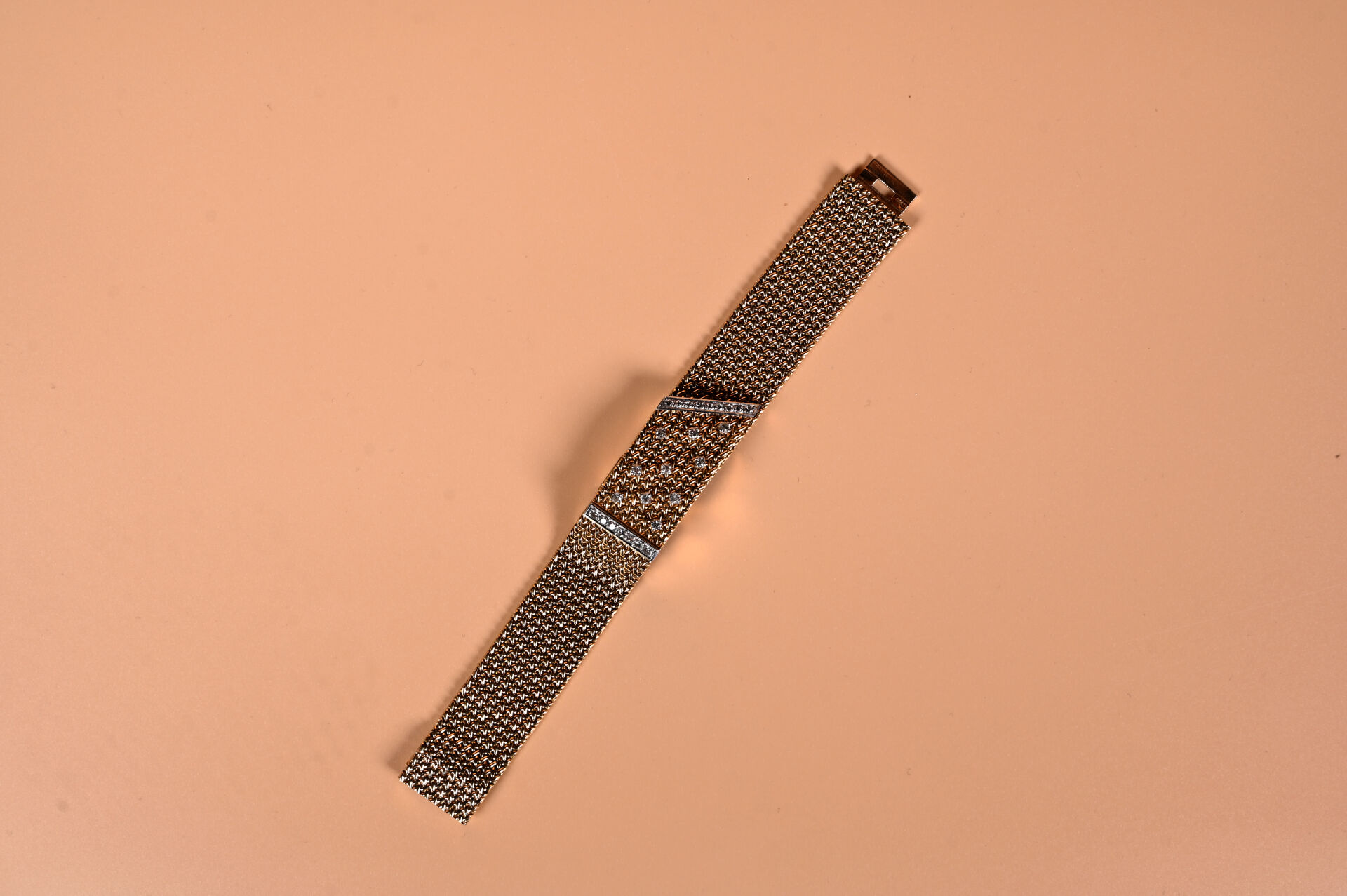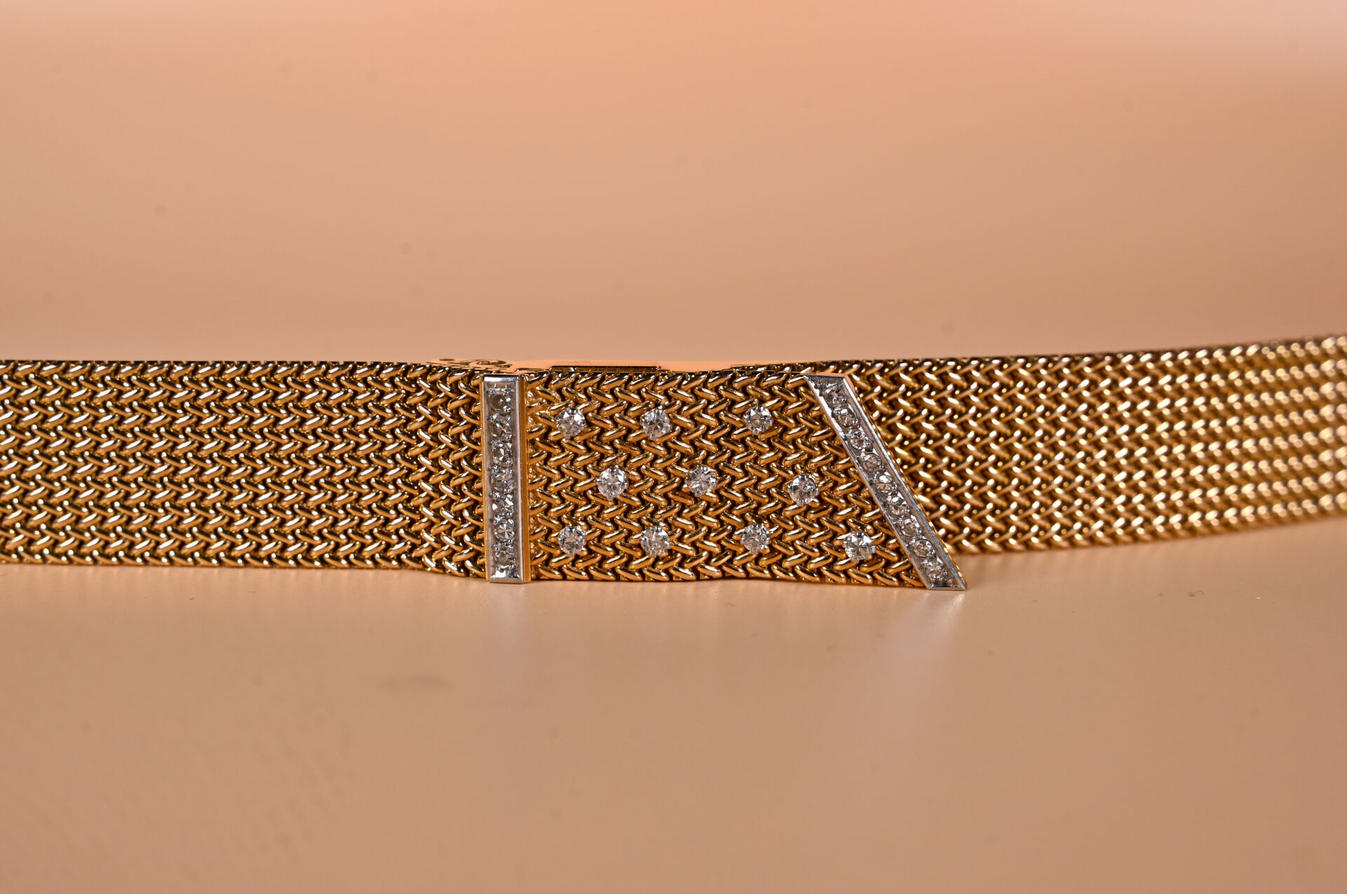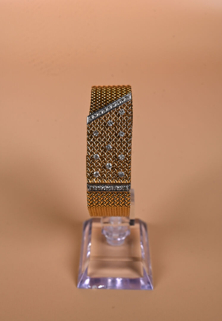 Montre bijoux de dame en or jaune 750 millièmes (18k). Boîtier carré caché par une large maille ruban sertie de vingt-six diamants taille 8/8. Mouvement mécanique à remontage manuel. Bracelet en maille ruban tressée. Longueur : 17,5 cm. Largeur : 2 cm. Vers 1960. Poids brut : 72,1 g. Fonctionne