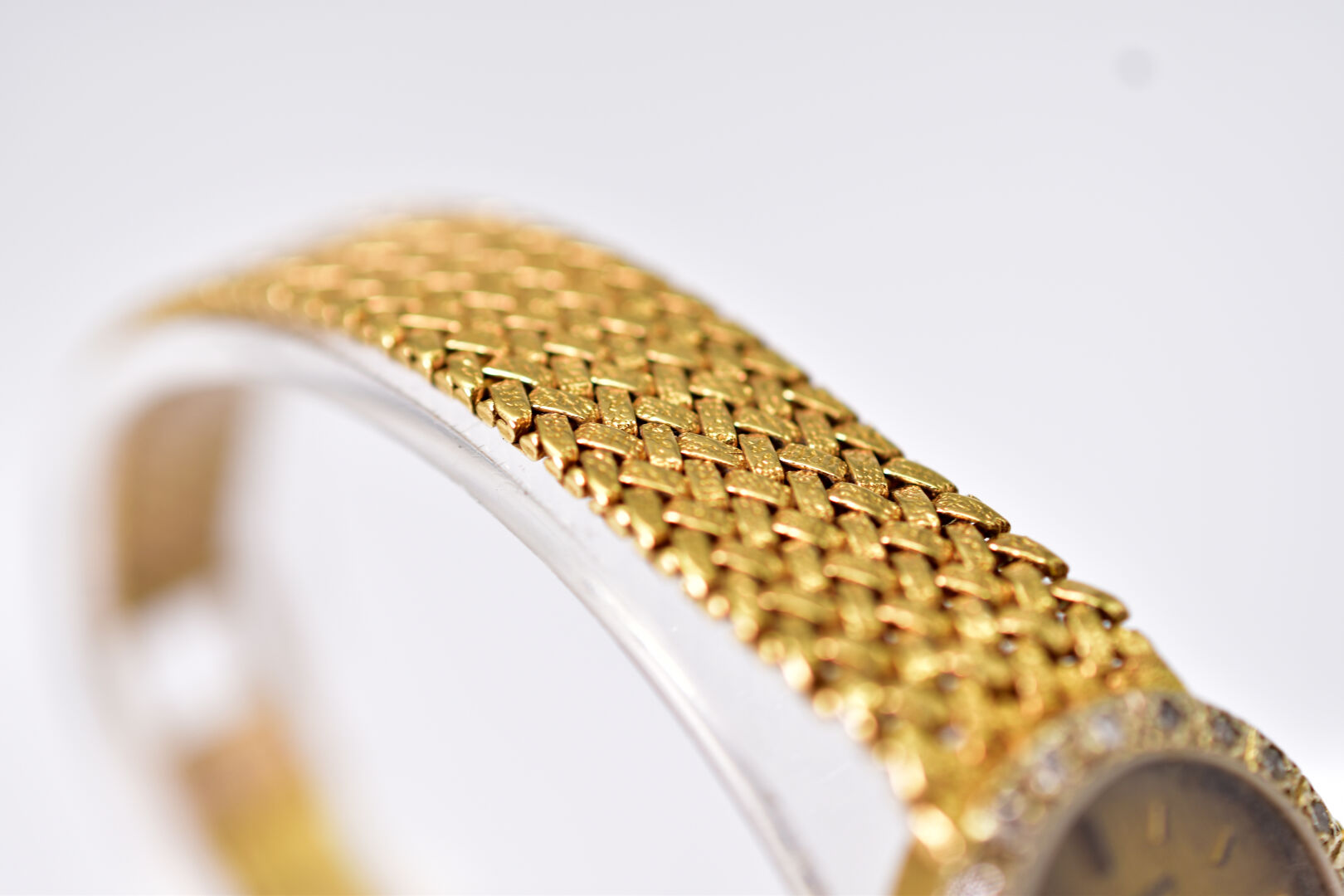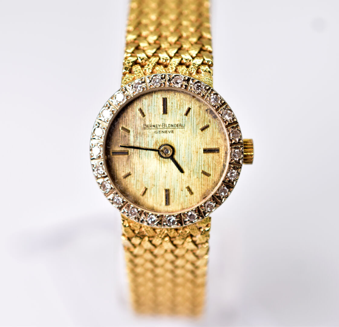 Montre bracelet de dame en or jaune 18K 750/1000e. Le boitier serti de petits diamants de taille brillant. Cadran signé . Poids brut. : 34 g