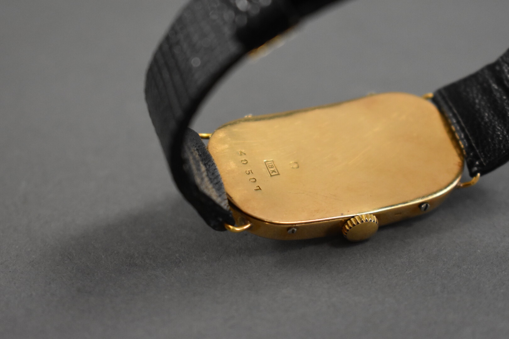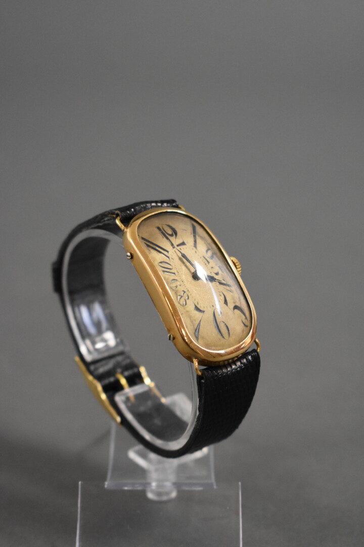 Montre bracelet d’homme à boitier ovale en or 18K 750/1000e. Le cadran à chiffres romains en noir. Mouvement mécanique. Vers 1930. Bracelet de cuir noir rapporté. Poids brut : 26,80 g.