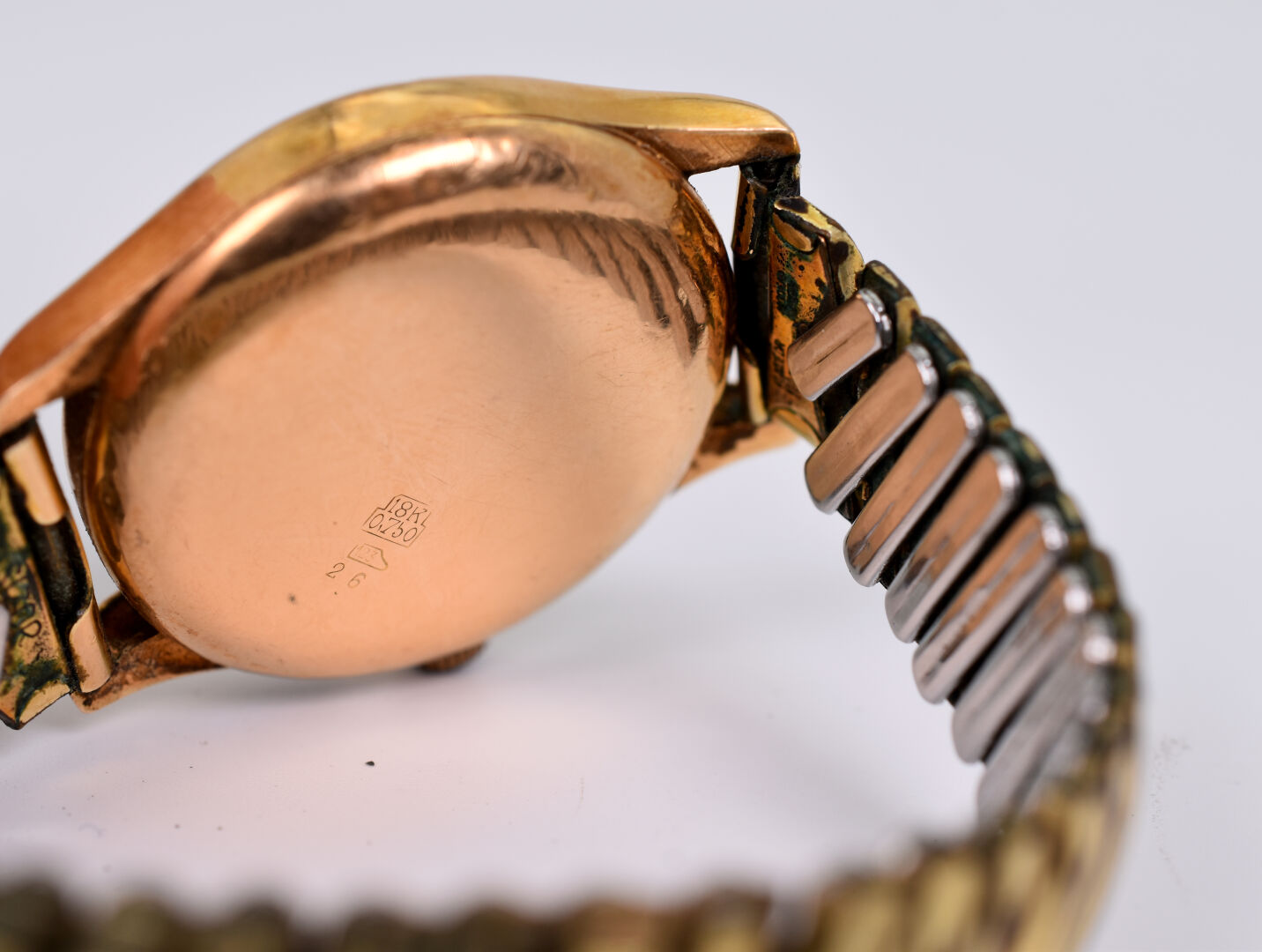 Montre chronographe à boitier en or jaune 18K 750/1000e (chronographe coincé, rayures, usures). Mouvement mécanique (ne fonctionne pas). Bracelet élastique en métal argenté et doré (très usé). Poids brut. : 59,6 g.