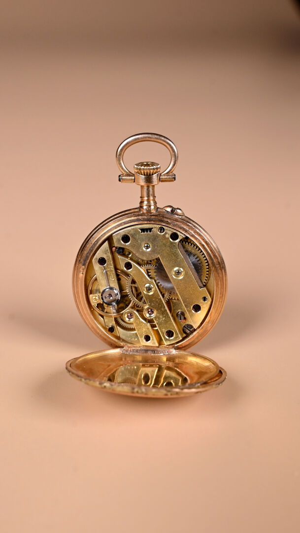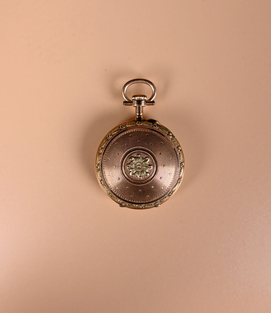 Montre de col en 2 ors 18K 750/1000e à décor feuillagé en ciselure. Travail de la fin du XIXe siècle. Cache poussière en or. Poids brut. : 20 g.