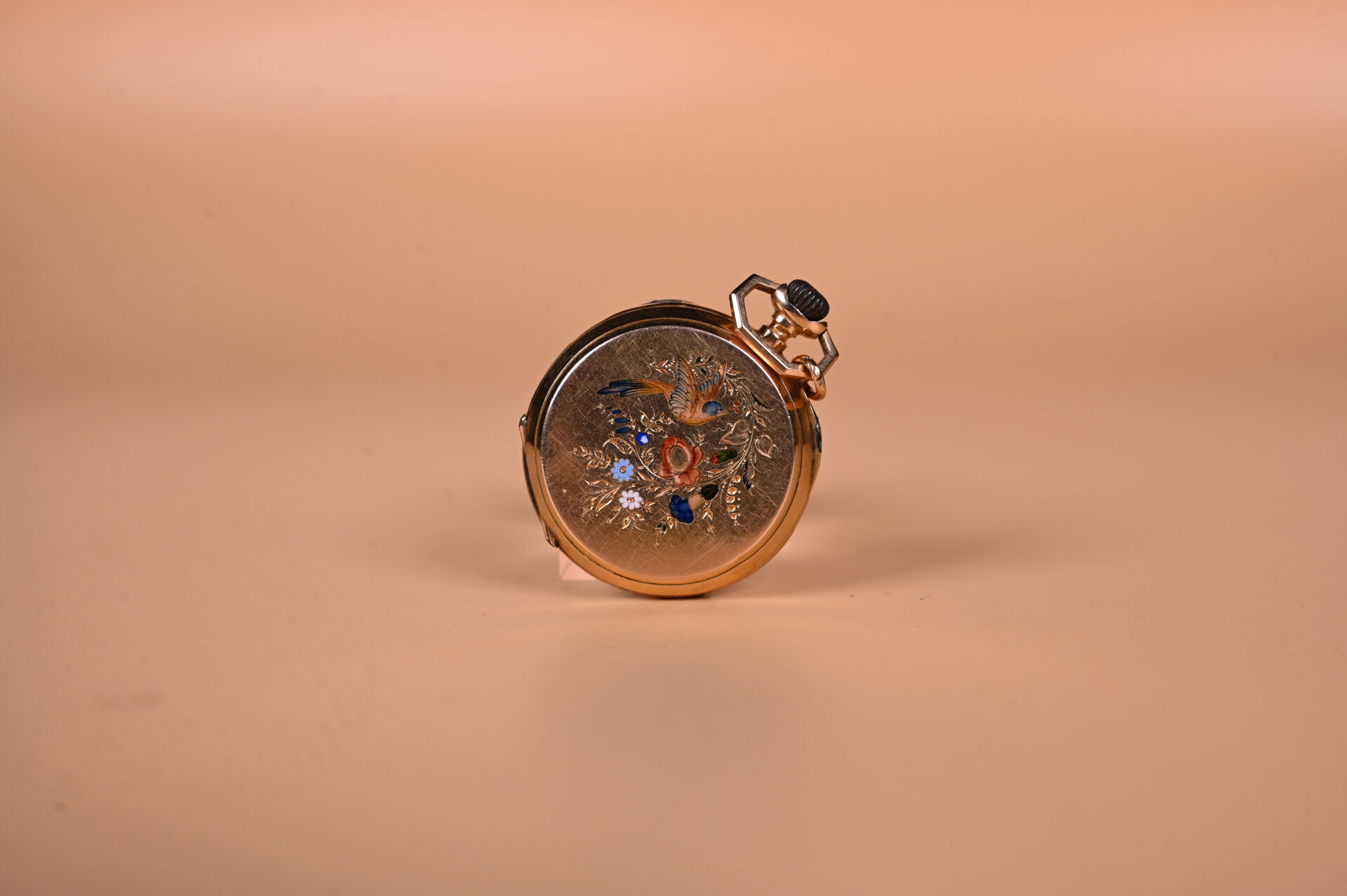 Montre de gousset en or jaune 18K 750/1.000 (2 soudures dont 1 au niveau du dos). Bouton remontoir en métal. Dos ciselé émaillé d’un oiseau et de fleurs. Poids brut : 22g.