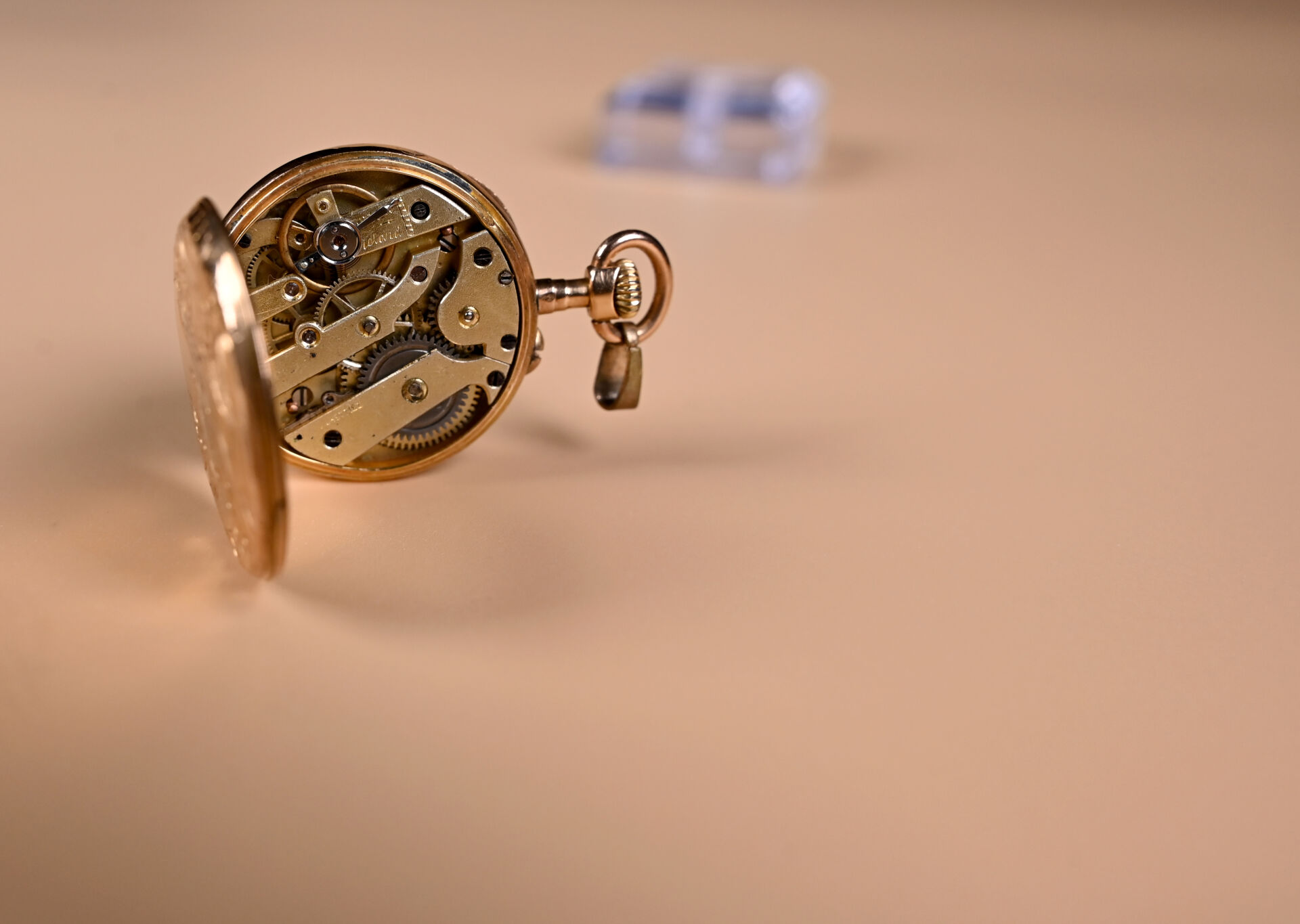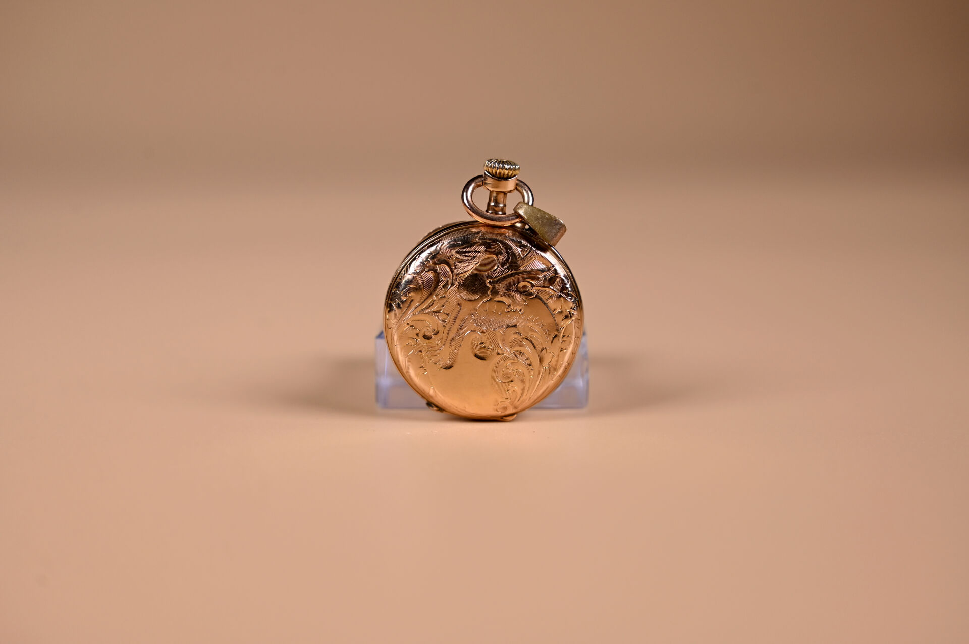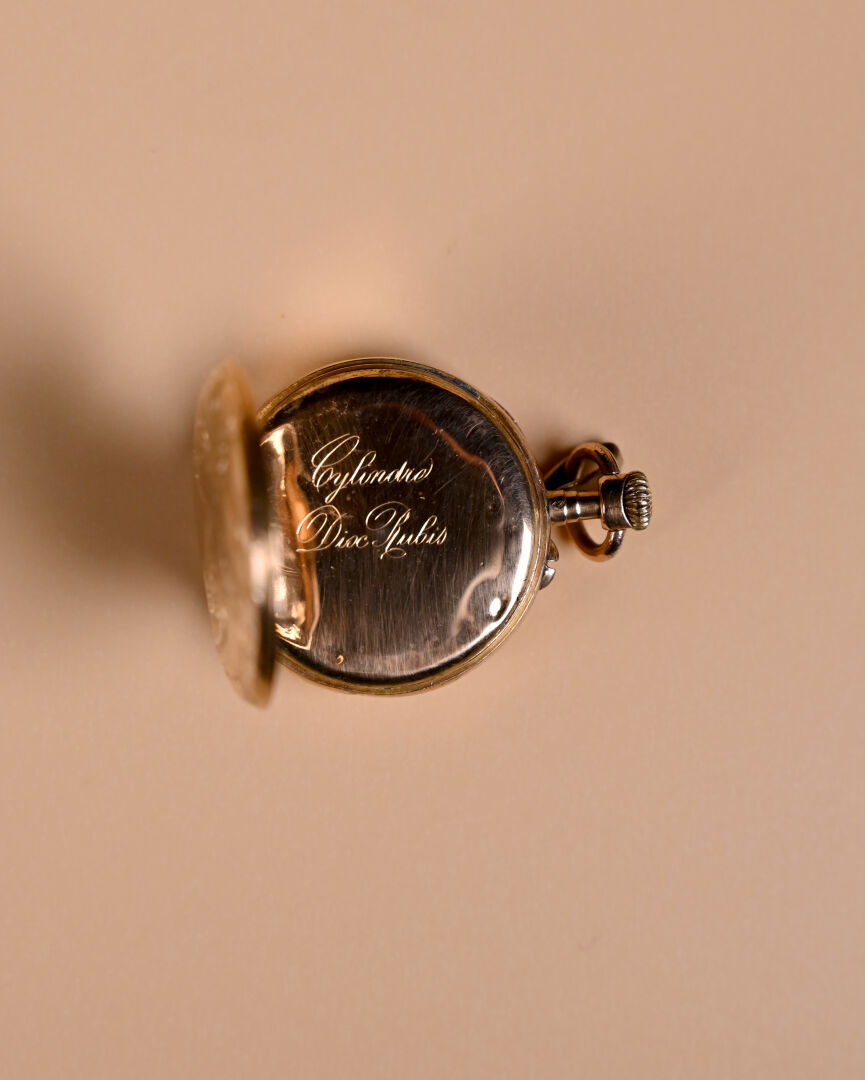 Montre de gousset en or jaune 18K 750/1000e, le cache poussière en or jaune. Cadran à chiffres romains en noir. Poinçon tête de cheval. Poids brut. : 16,58 g.
