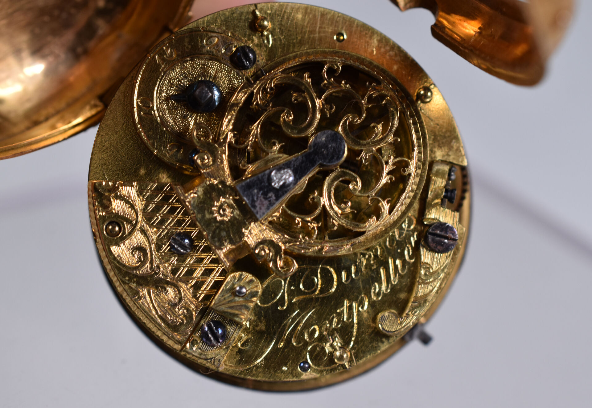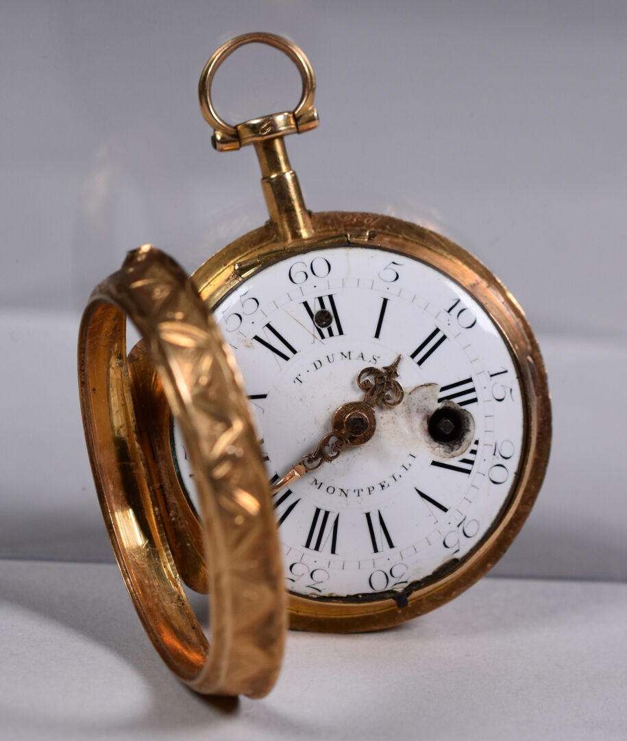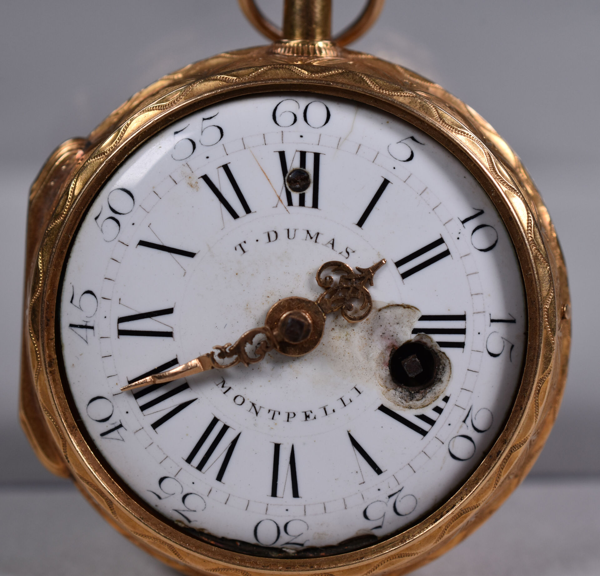 Montre de gousset en or jaune 18K 750/1000e, le dos à décor d’un vase fleuri et carquois, le cadran signé T. DUMAS à Montpellier (éclat, manquent la trotteuse et le verre). Probablement du XVIIIe siècle. Poids brut. : 60,3 g.