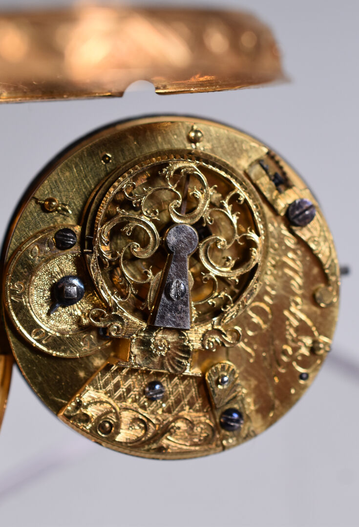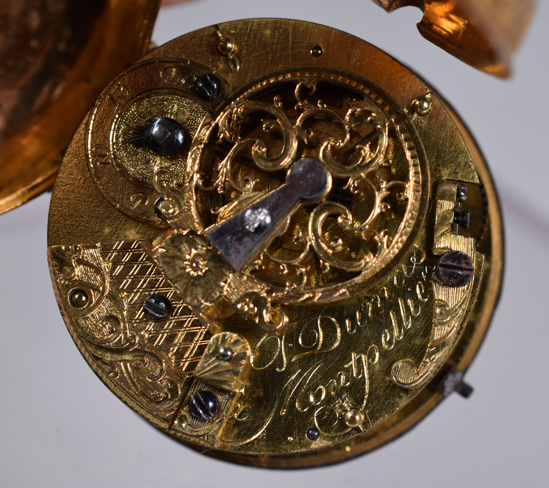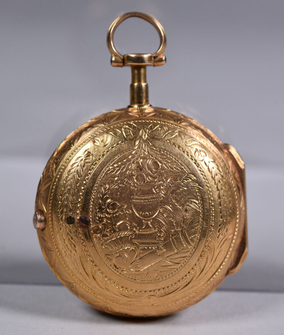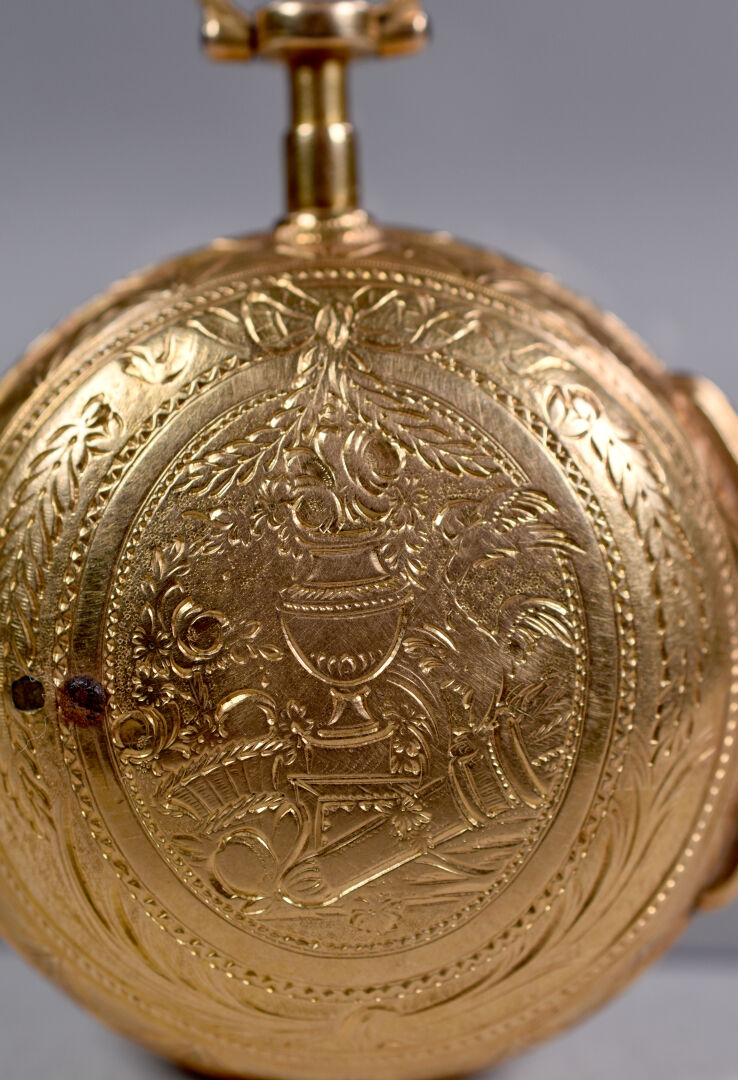 Montre de gousset en or jaune 18K 750/1000e, le dos à décor d’un vase fleuri et carquois, le cadran signé T. DUMAS à Montpellier (éclat, manquent la trotteuse et le verre). Probablement du XVIIIe siècle. Poids brut. : 60,3 g.