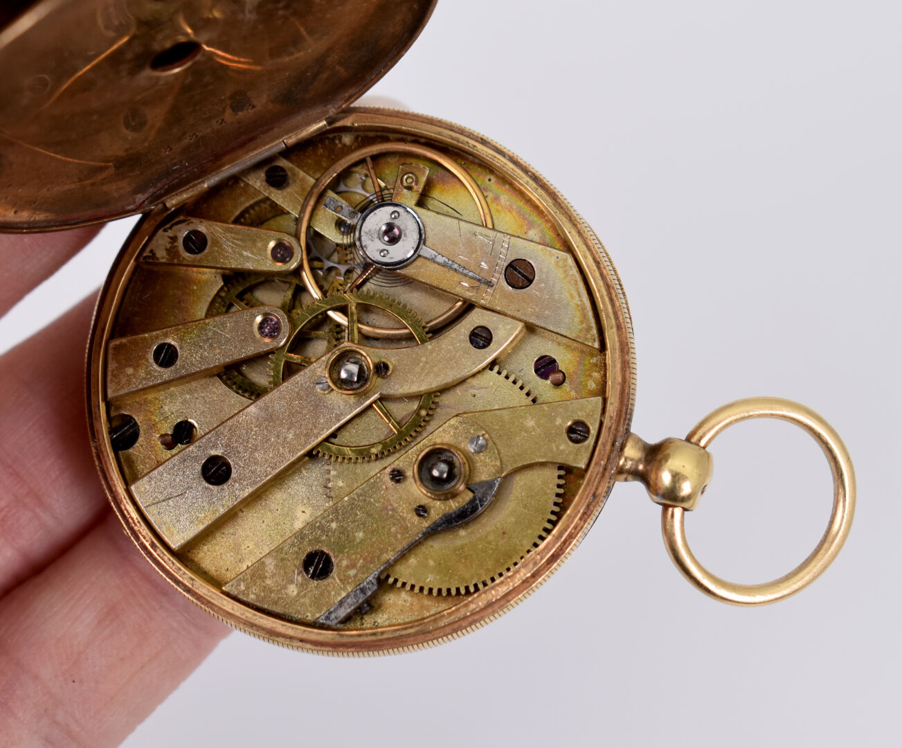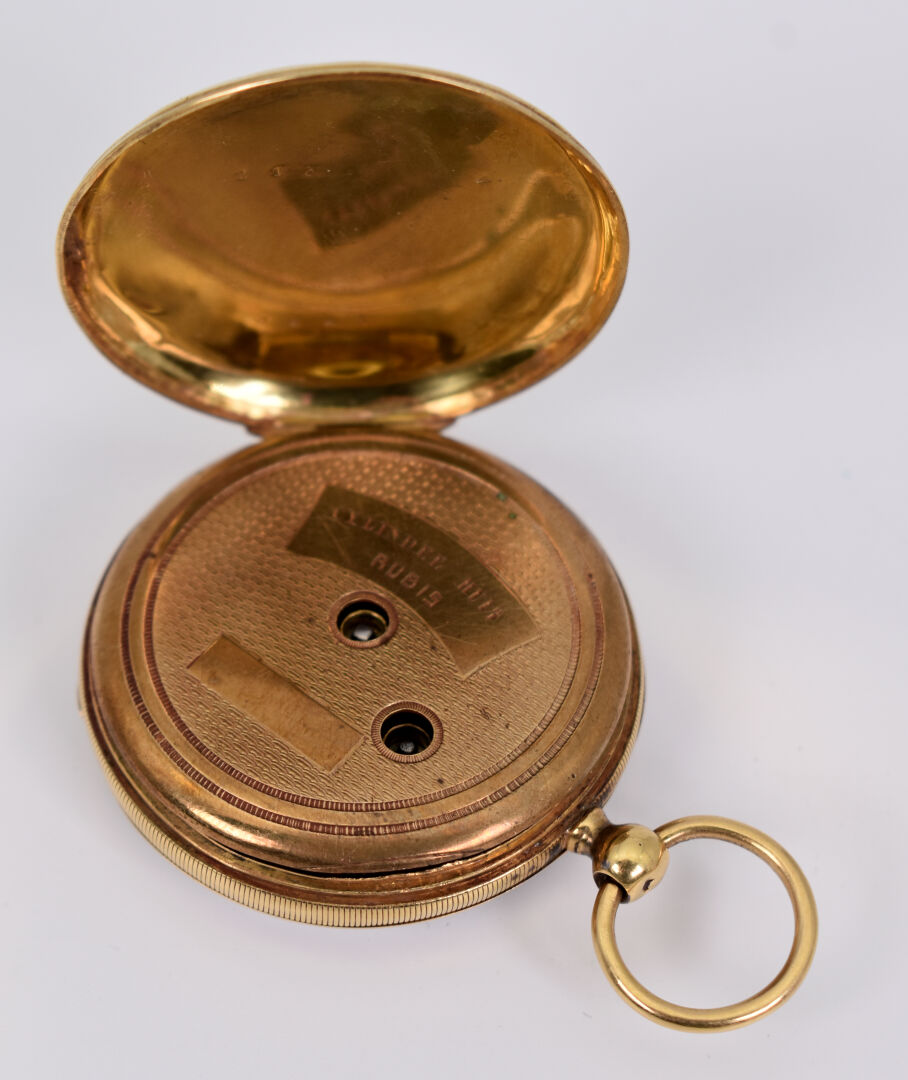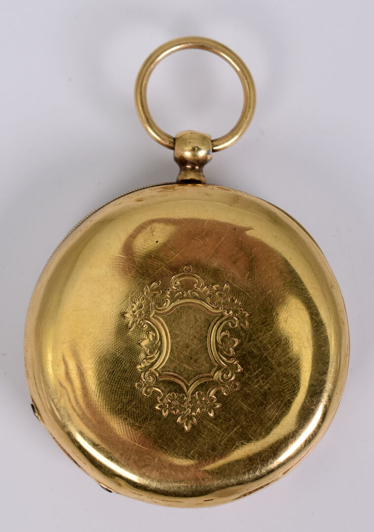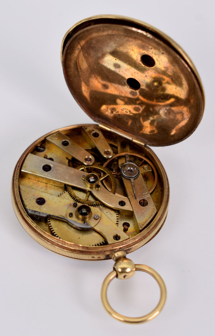 Montre de gousset en or jaune 18K 750/1000e (poinçon tête de cheval), le cache poussière en métal. Poids brut : 57,50 g.