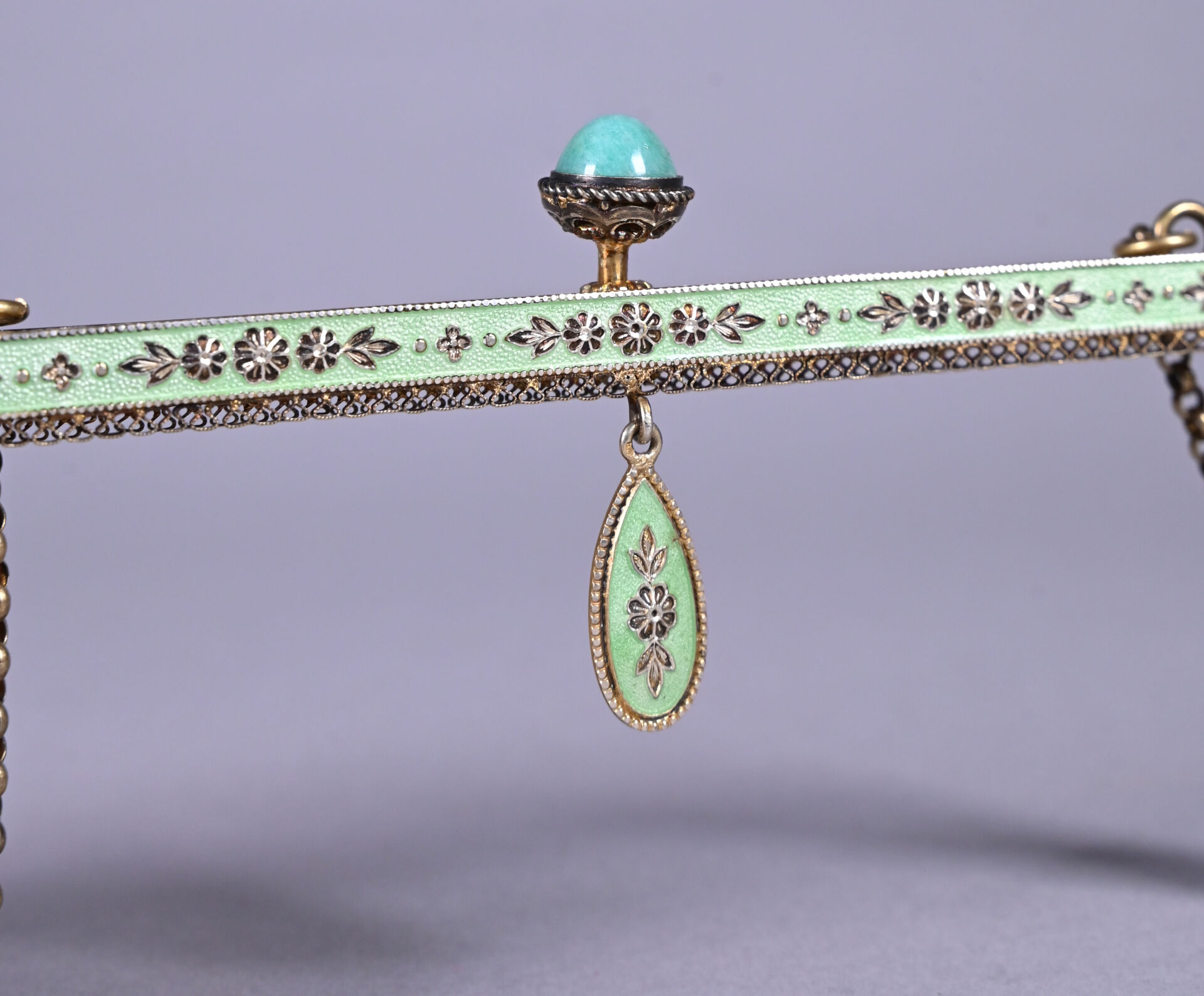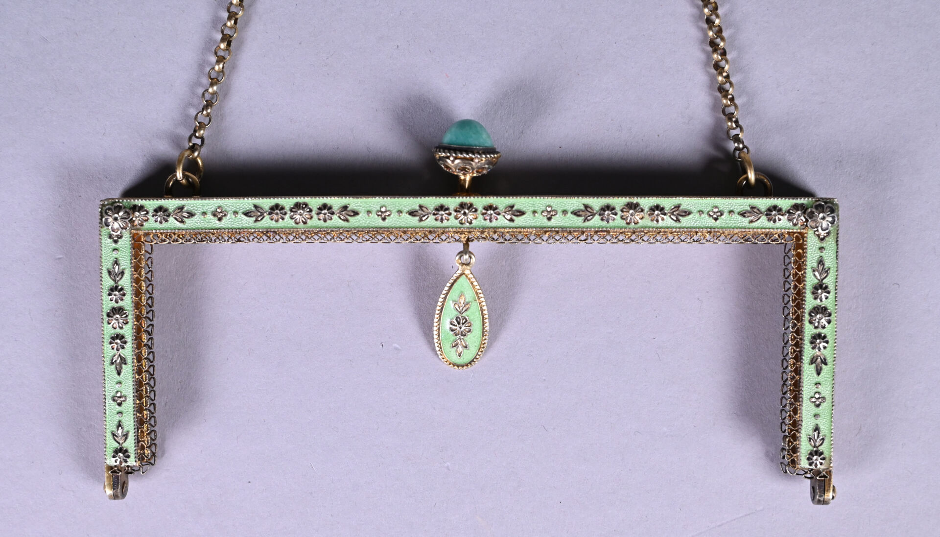 Monture de sac du soir en argent 800/1000e doré, argent ciselé et émaillé à décor de fleurs. Le bouton formé d’un cabochon de pierre verte. Poids brut. : 104 g.