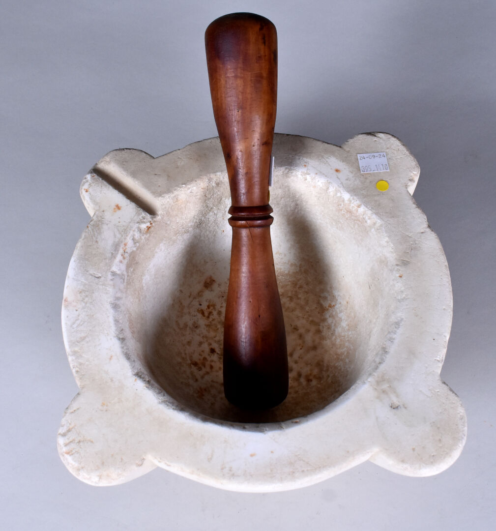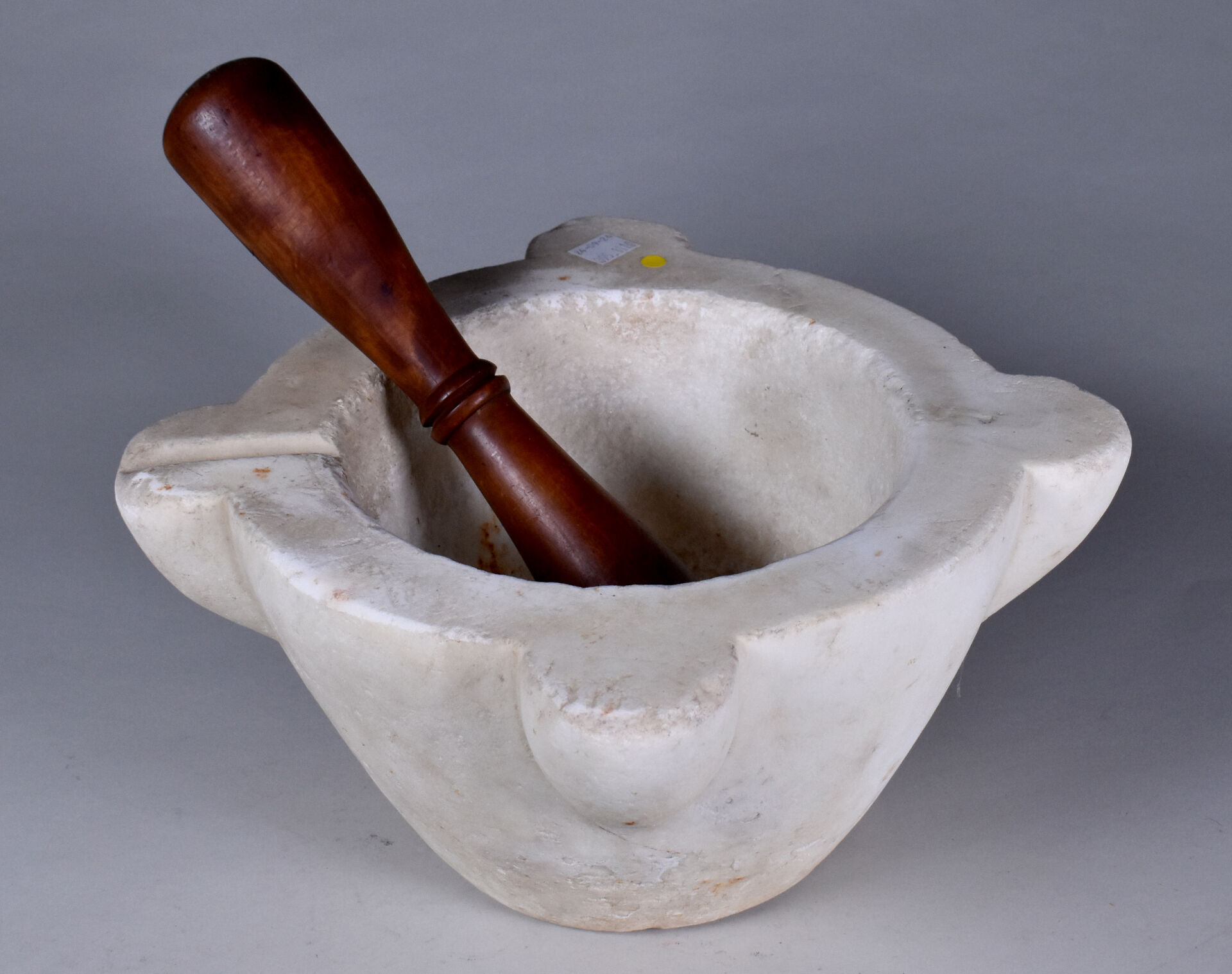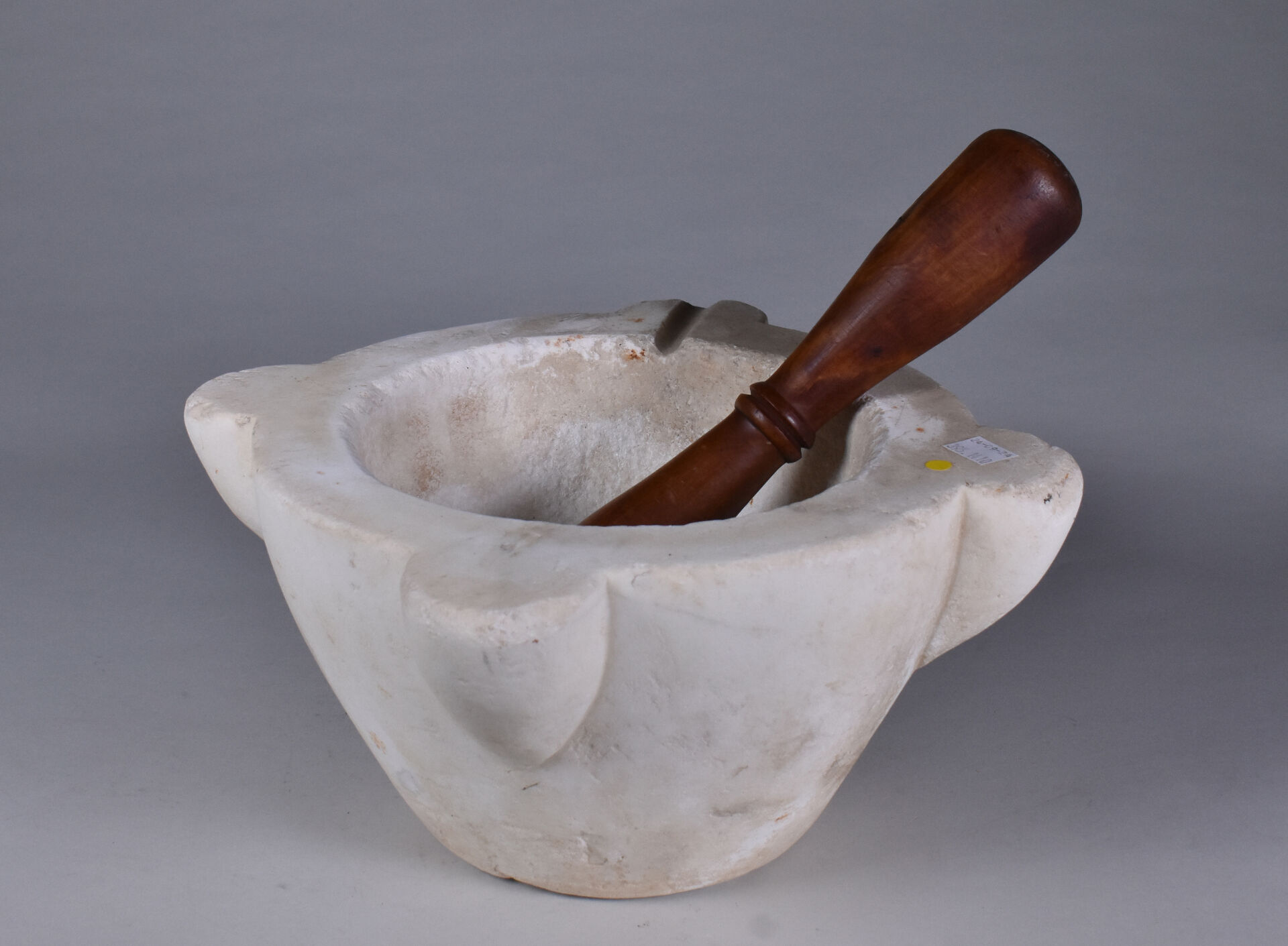 Mortier en marbre blanc (égrenures). Haut. : 14 cm – Diam. : 31 cm. On joint un pilon en bois.