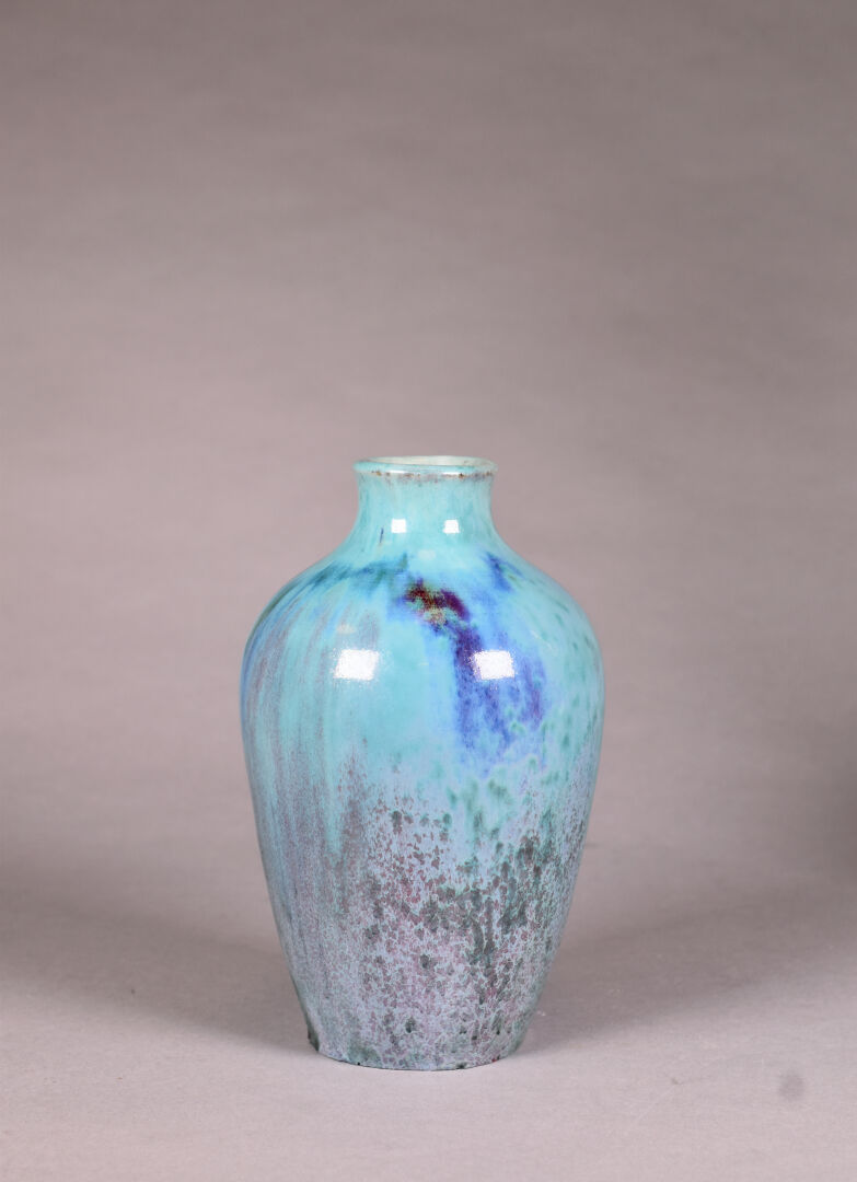 MOUGIN à Nancy. Vase balustre en céramique émaillée turquoise. Signé à la pointe sous la base. Haut. : 20 cm. On joint un vase à haut col en céramique émaillé à bandes noir et vert. Haut. : 42 cm.