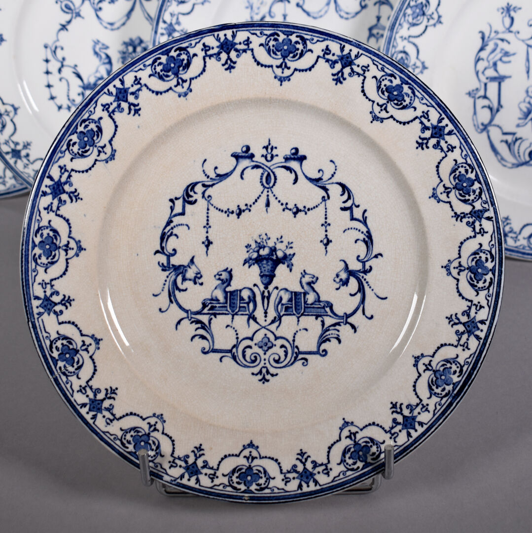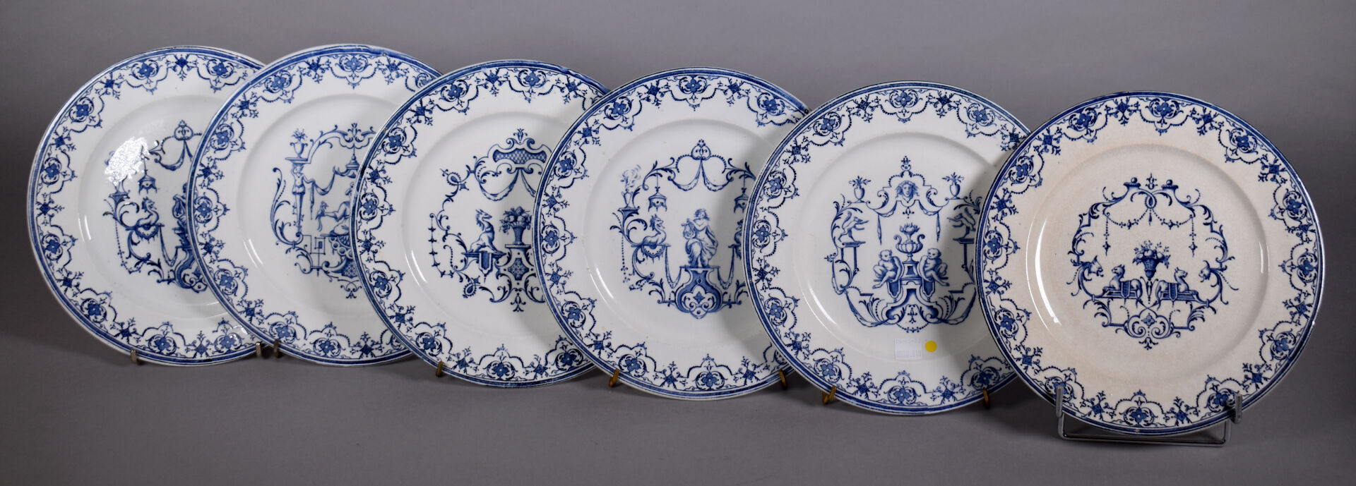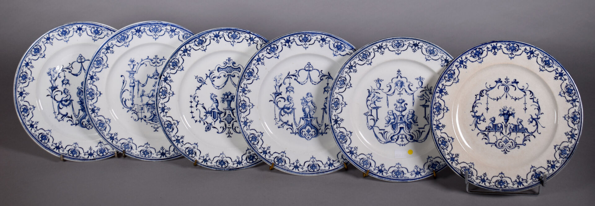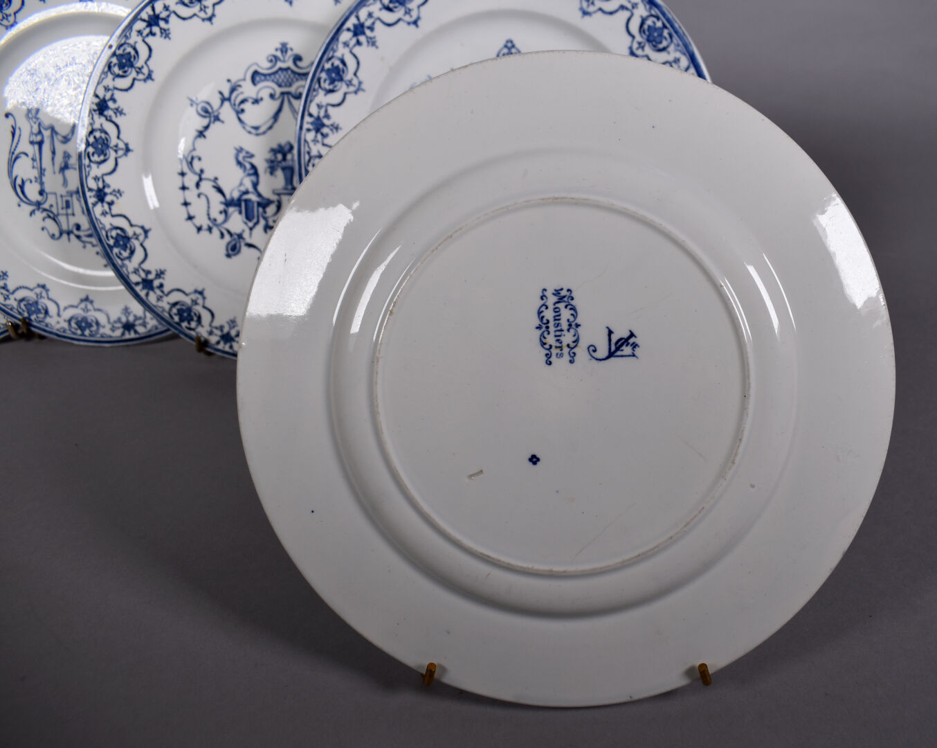 MOUSTIERS- Vieillard. Suite de 6 assiettes en faïence à décor en camaïeu de bleu à la Berain. XIXe siècle. Diam. : 25 cm.
