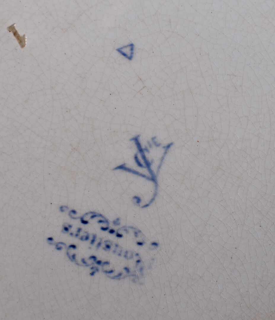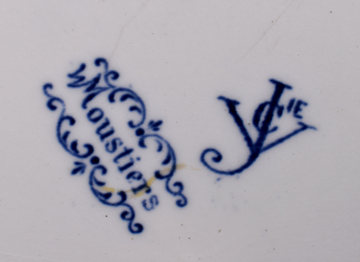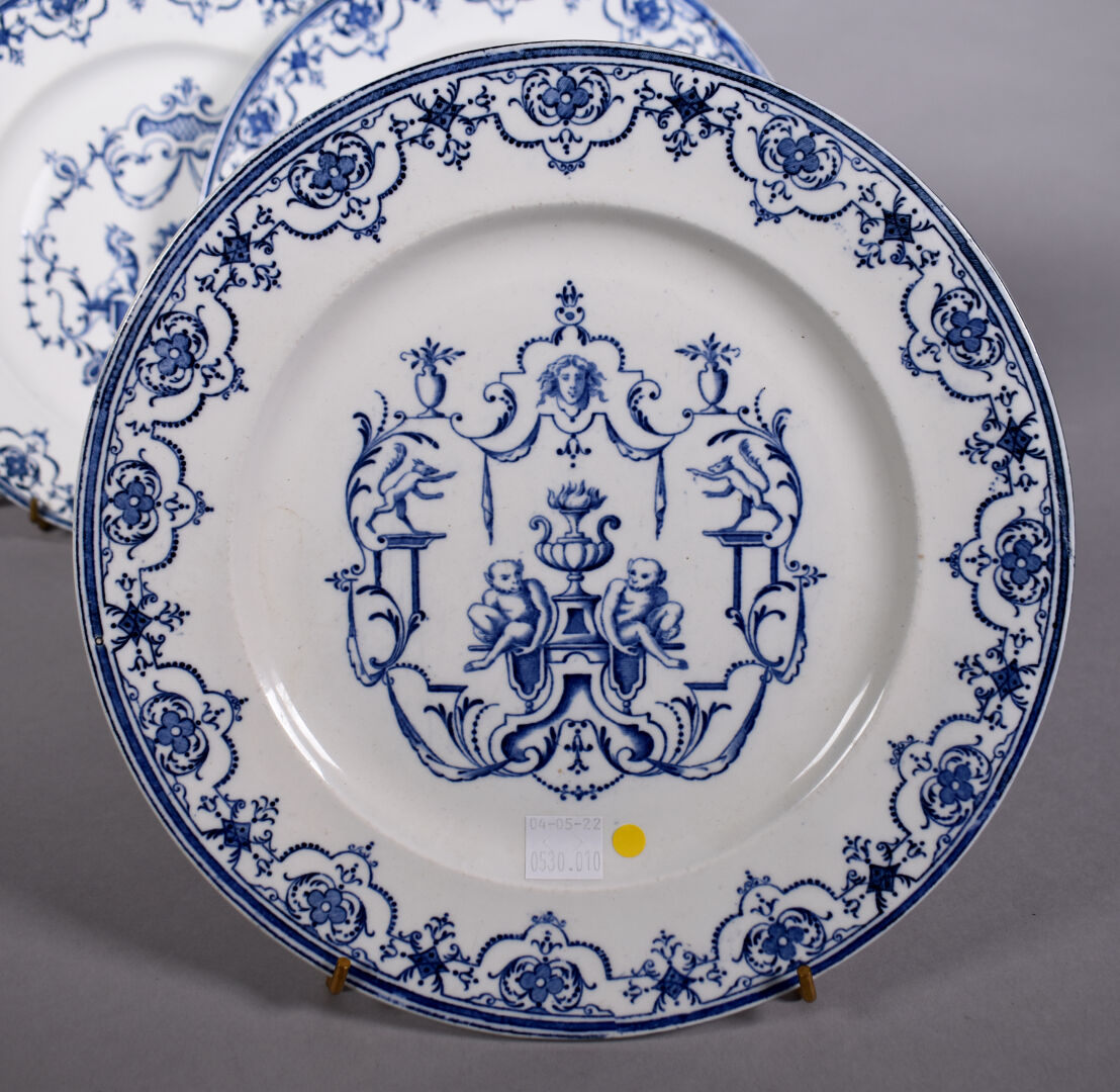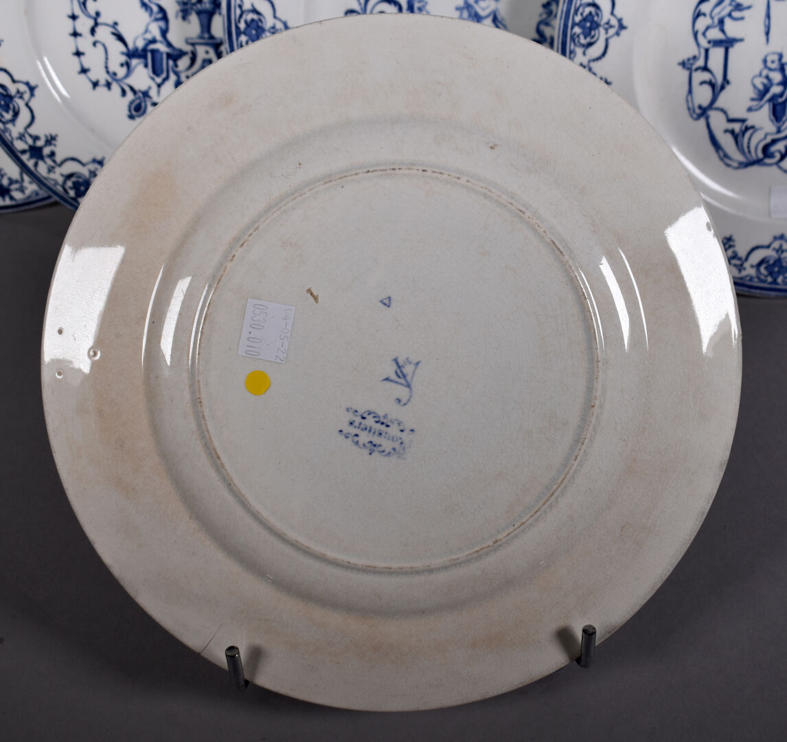 MOUSTIERS- Vieillard. Suite de 6 assiettes en faïence à décor en camaïeu de bleu à la Berain. XIXe siècle. Diam. : 25 cm.