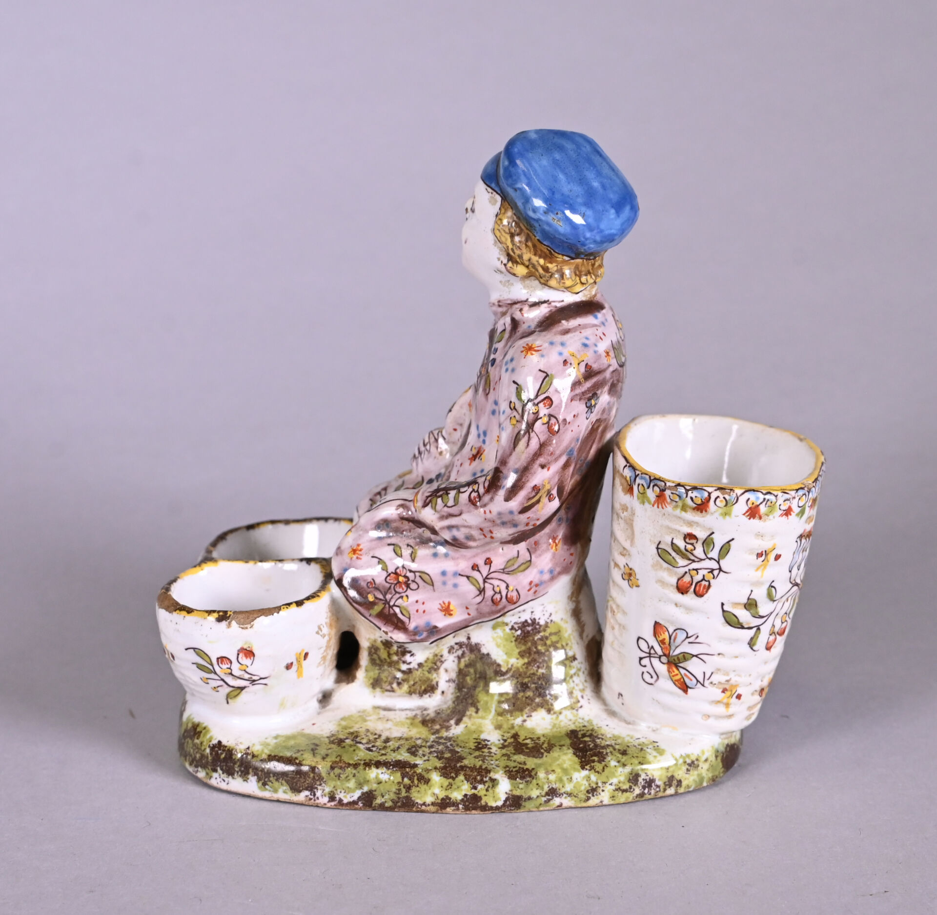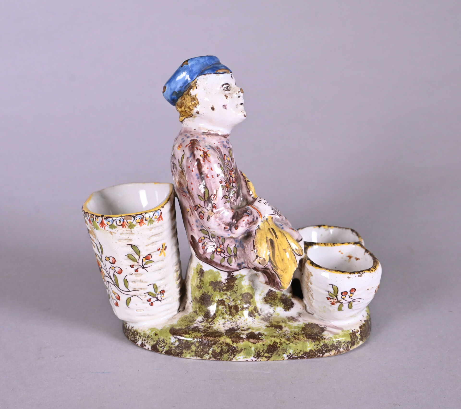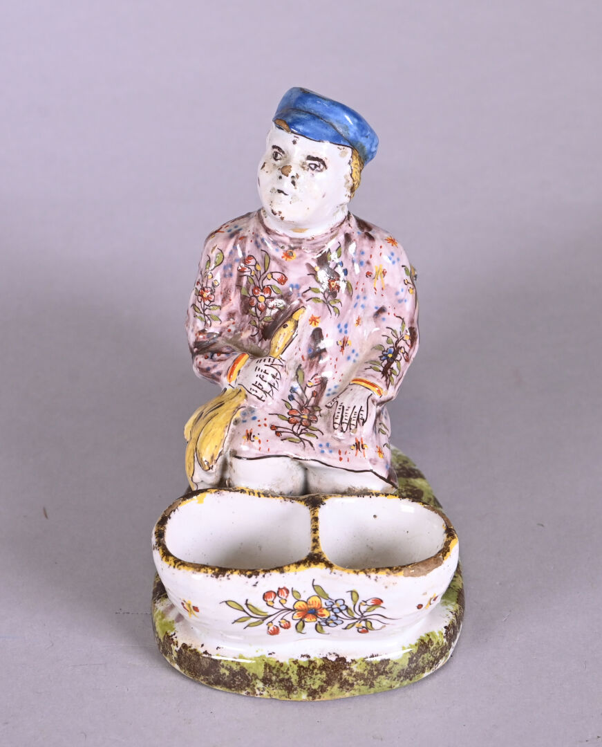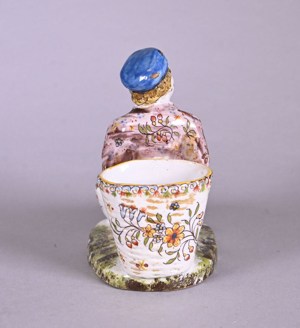 Moutardier en faïence de Desvres à décor d’un personnage plumant une oie (égrenures). Fabrique Fourmaintraux Frères. Marqué au dessous. Fin XIXe siècle. Haut. : 14 cm.