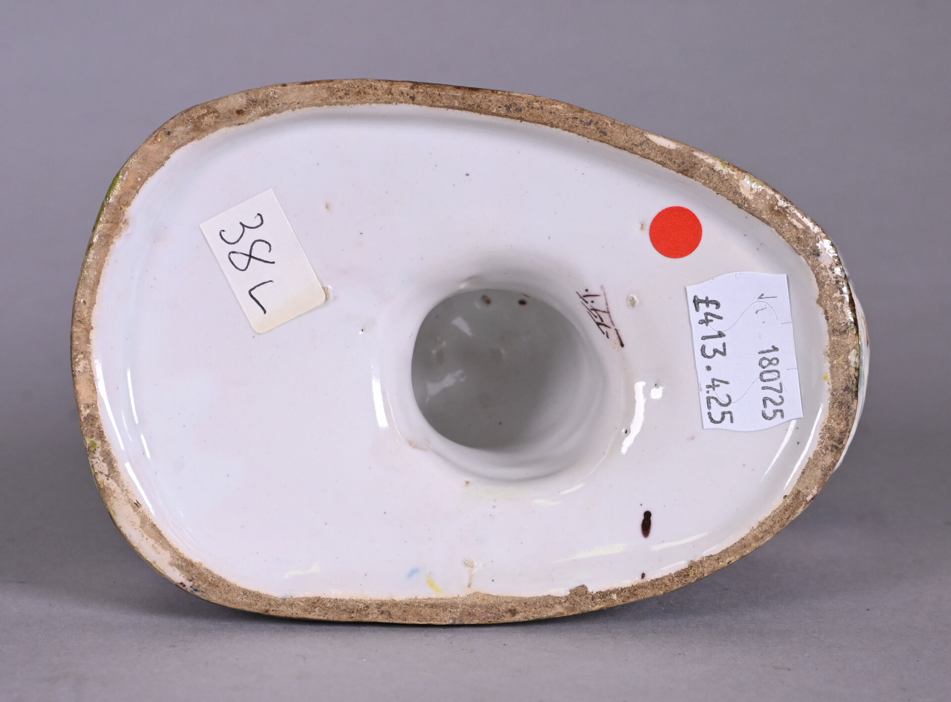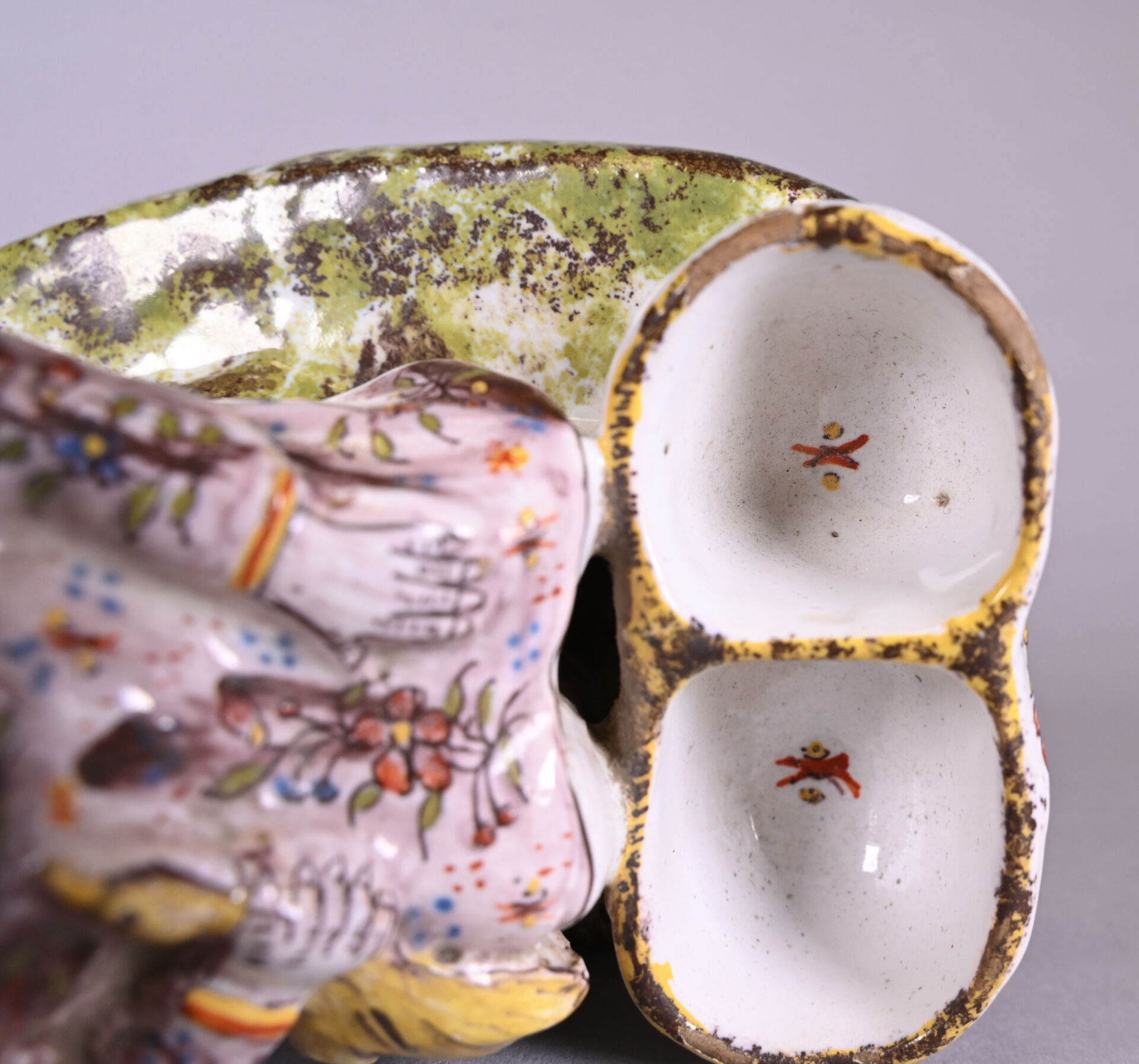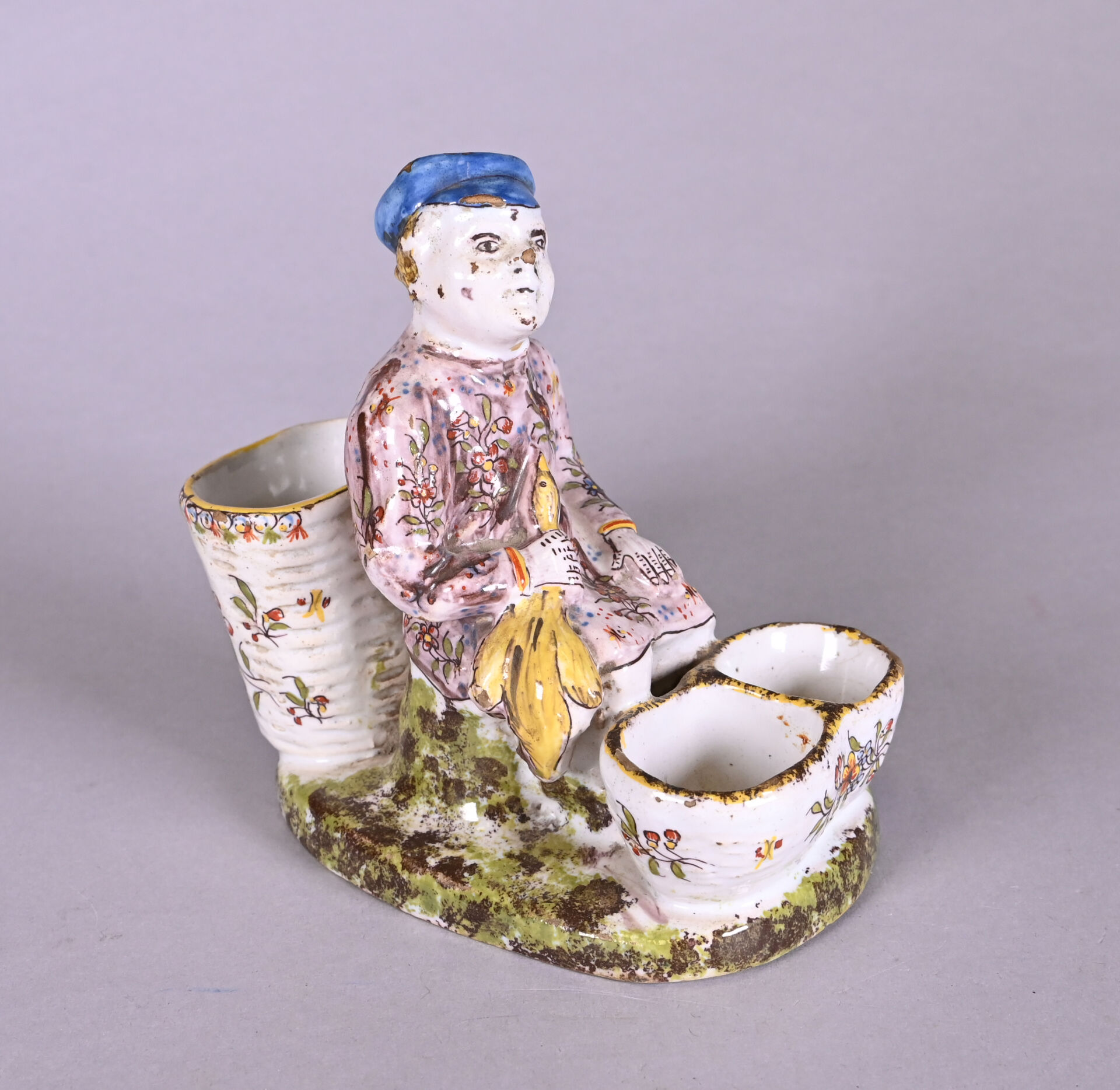 Moutardier en faïence de Desvres à décor d’un personnage plumant une oie (égrenures). Fabrique Fourmaintraux Frères. Marqué au dessous. Fin XIXe siècle. Haut. : 14 cm.