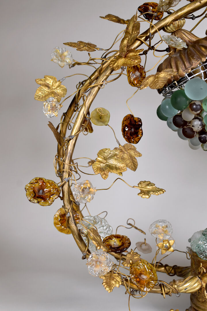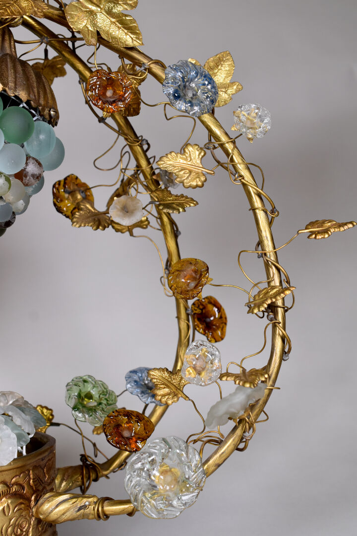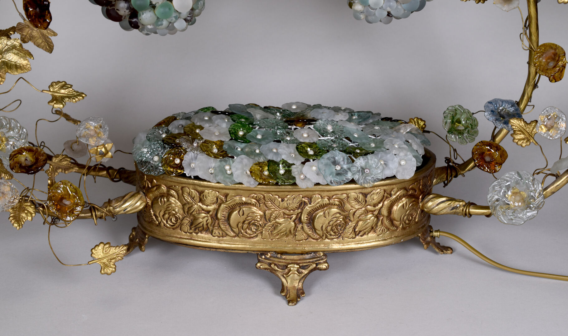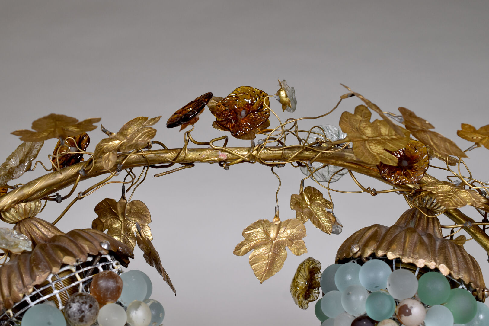 MURANO. Centre de table en métal à trois lumières à décor de fleurs et grappes de raisin en verre vert et ambré, pampres de vignes en métal (quelques usures d’usage). Électricité refaite. Haut. : 48 cm – Larg. : 69 cm – Prof. : 23 cm.