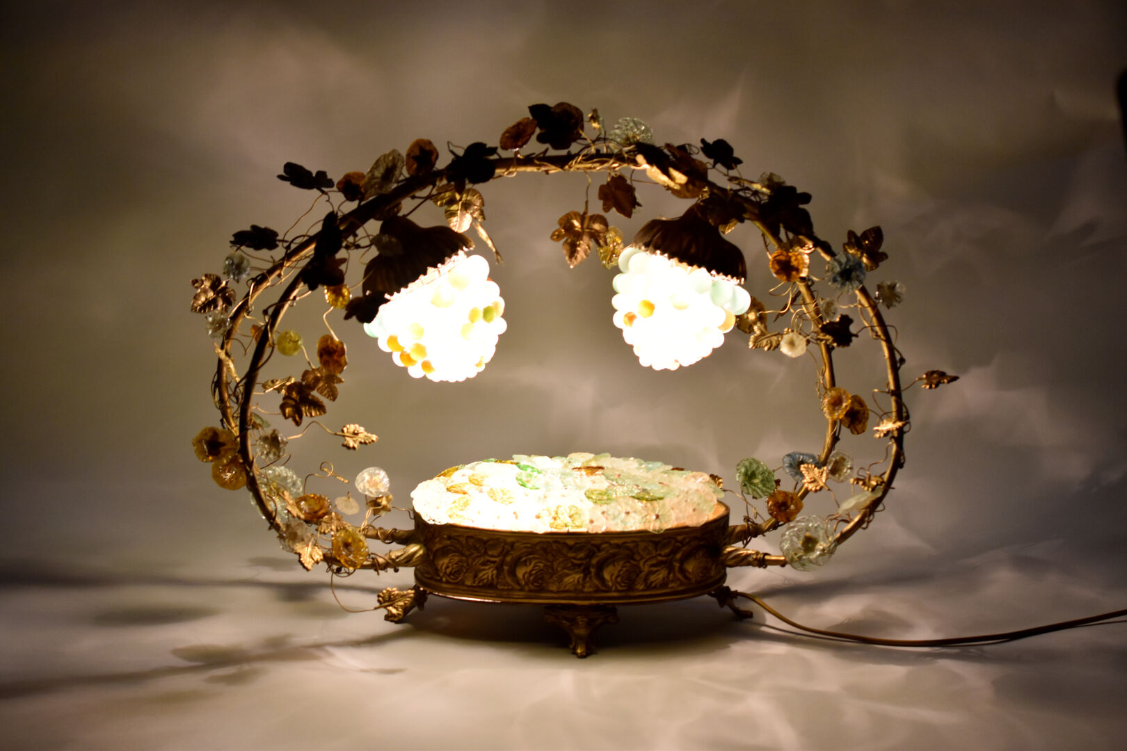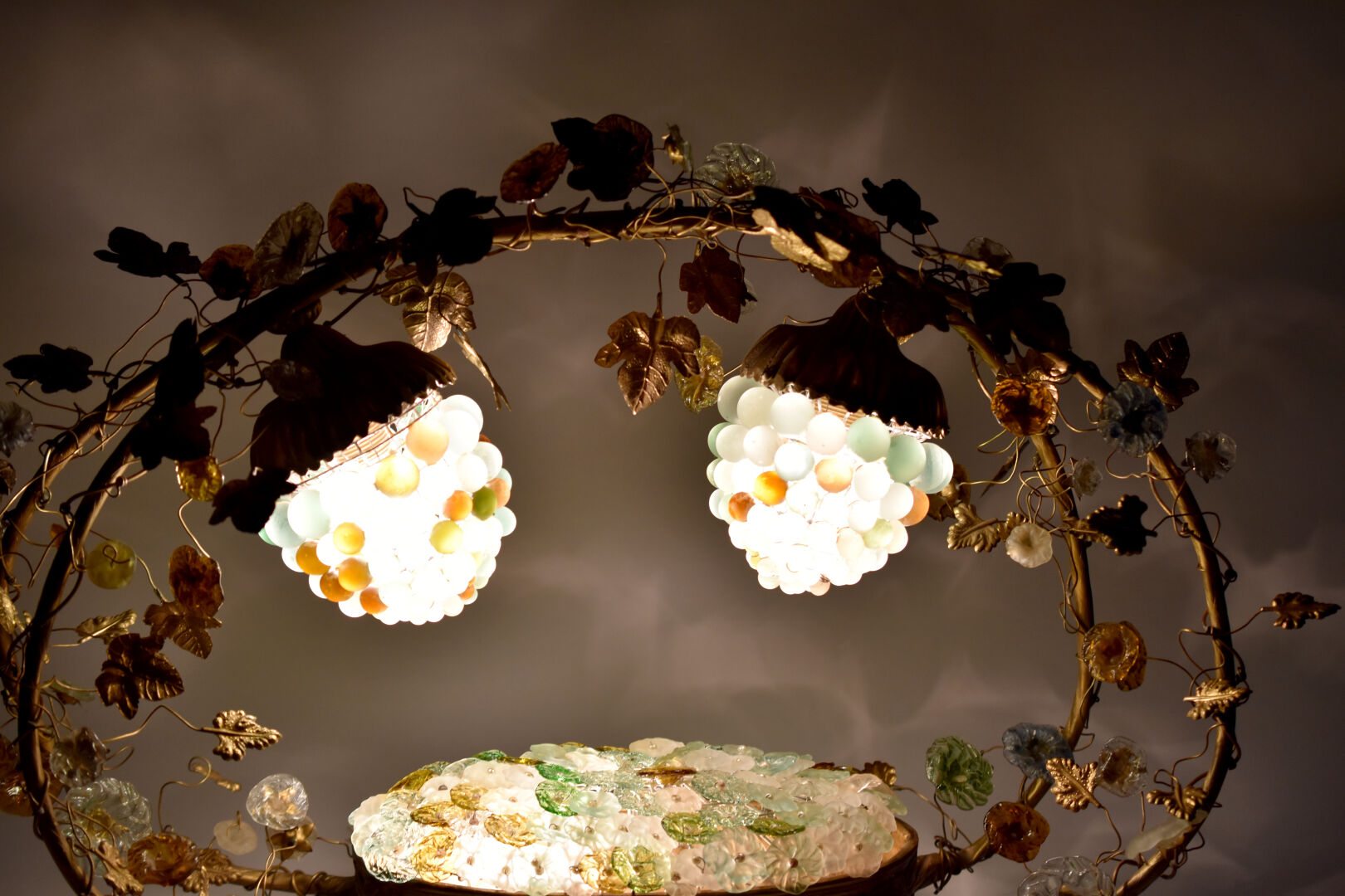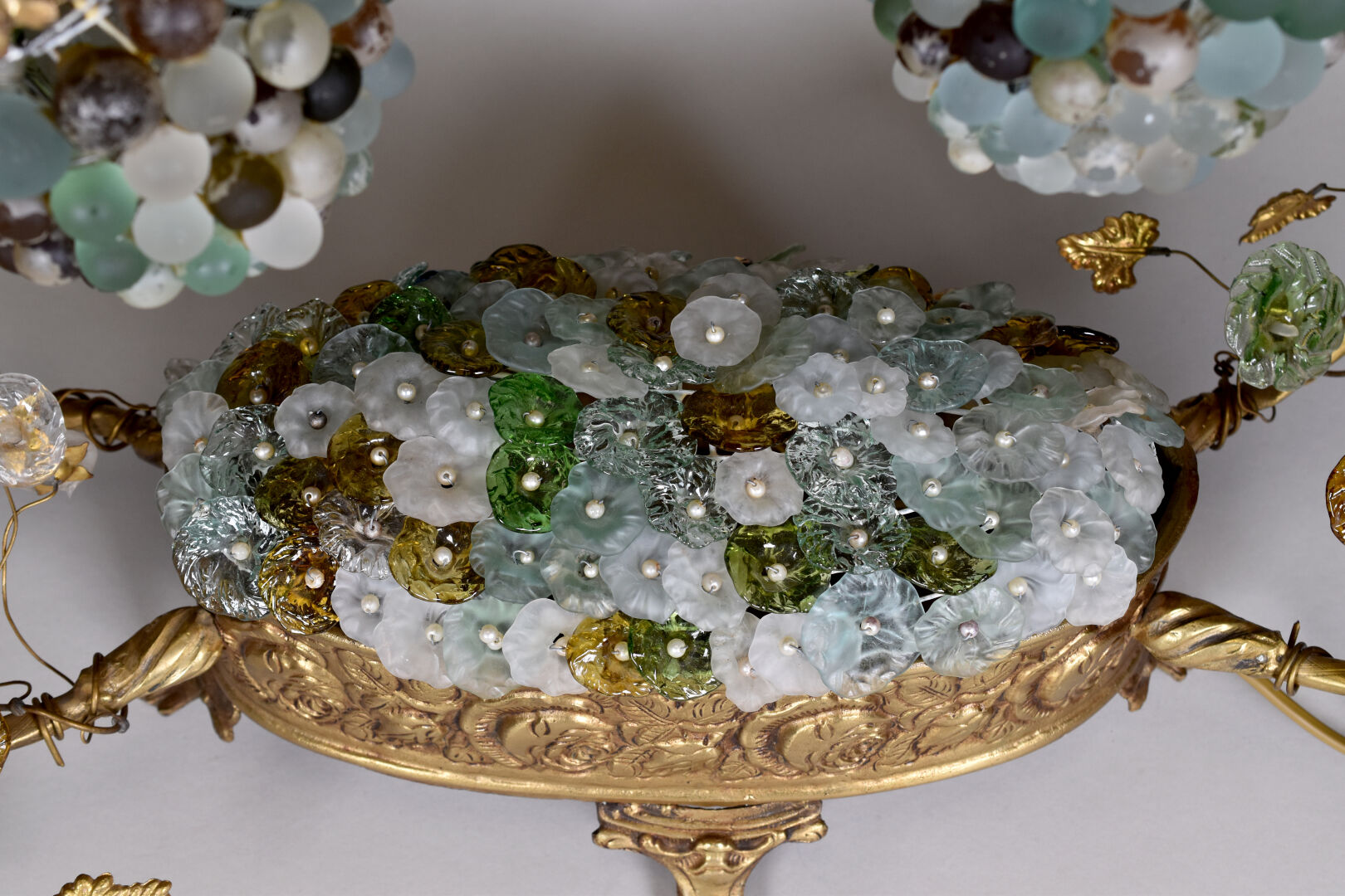 MURANO. Centre de table en métal à trois lumières à décor de fleurs et grappes de raisin en verre vert et ambré, pampres de vignes en métal (quelques usures d’usage). Électricité refaite. Haut. : 48 cm – Larg. : 69 cm – Prof. : 23 cm.