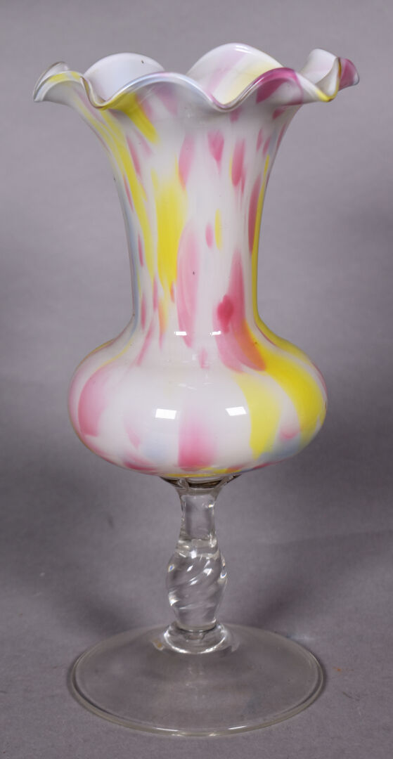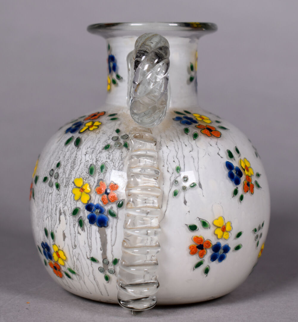 MURANO. Ensemble en verre soit une coupe en panier, une coupe sur pied, un petit vase boule et une aiguière. XXe siècle. On joint une paire de petits vases balustre à décor en émaux cloisonnés. Haut. de l’aiguière. : 33 cm.