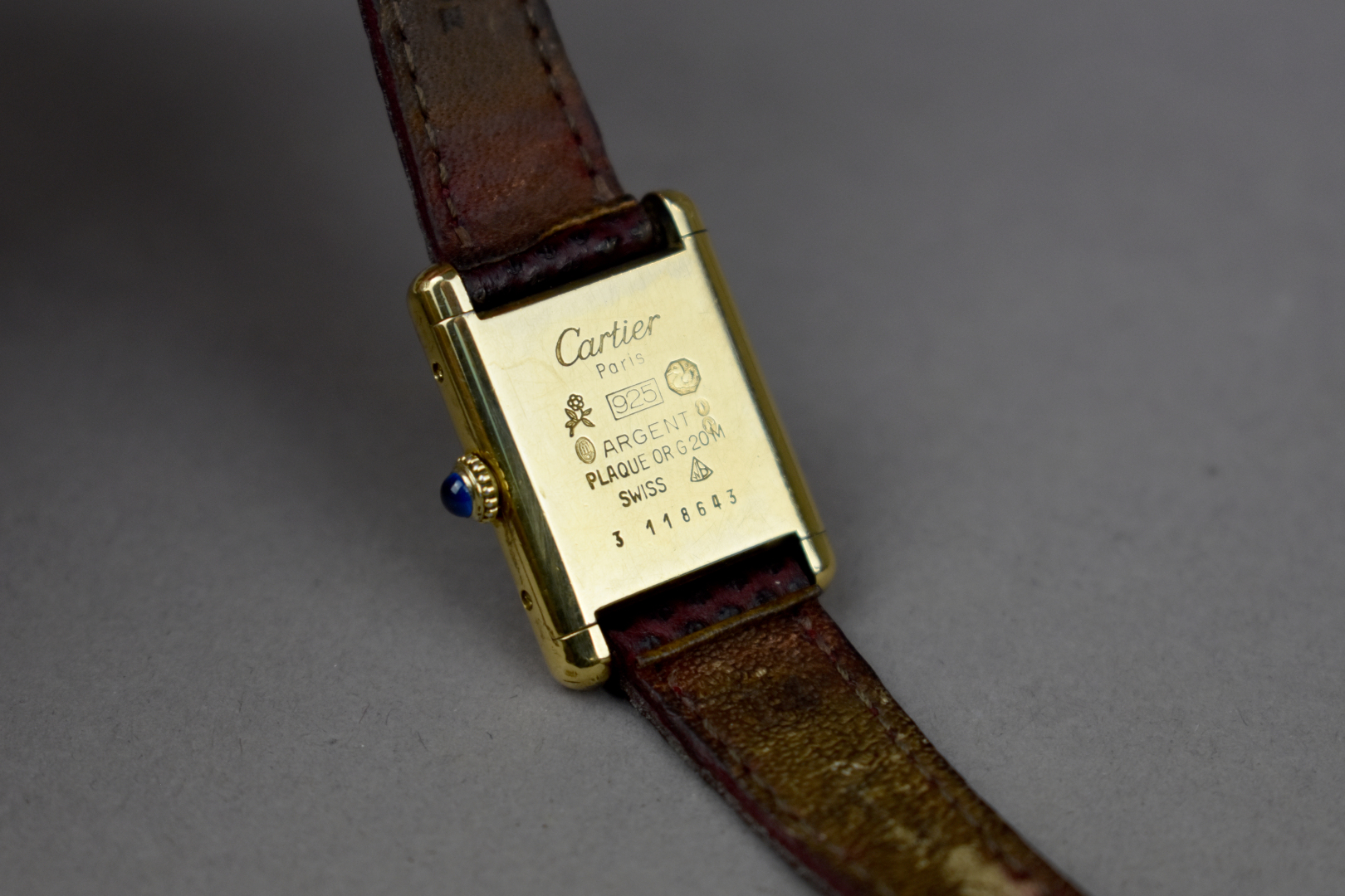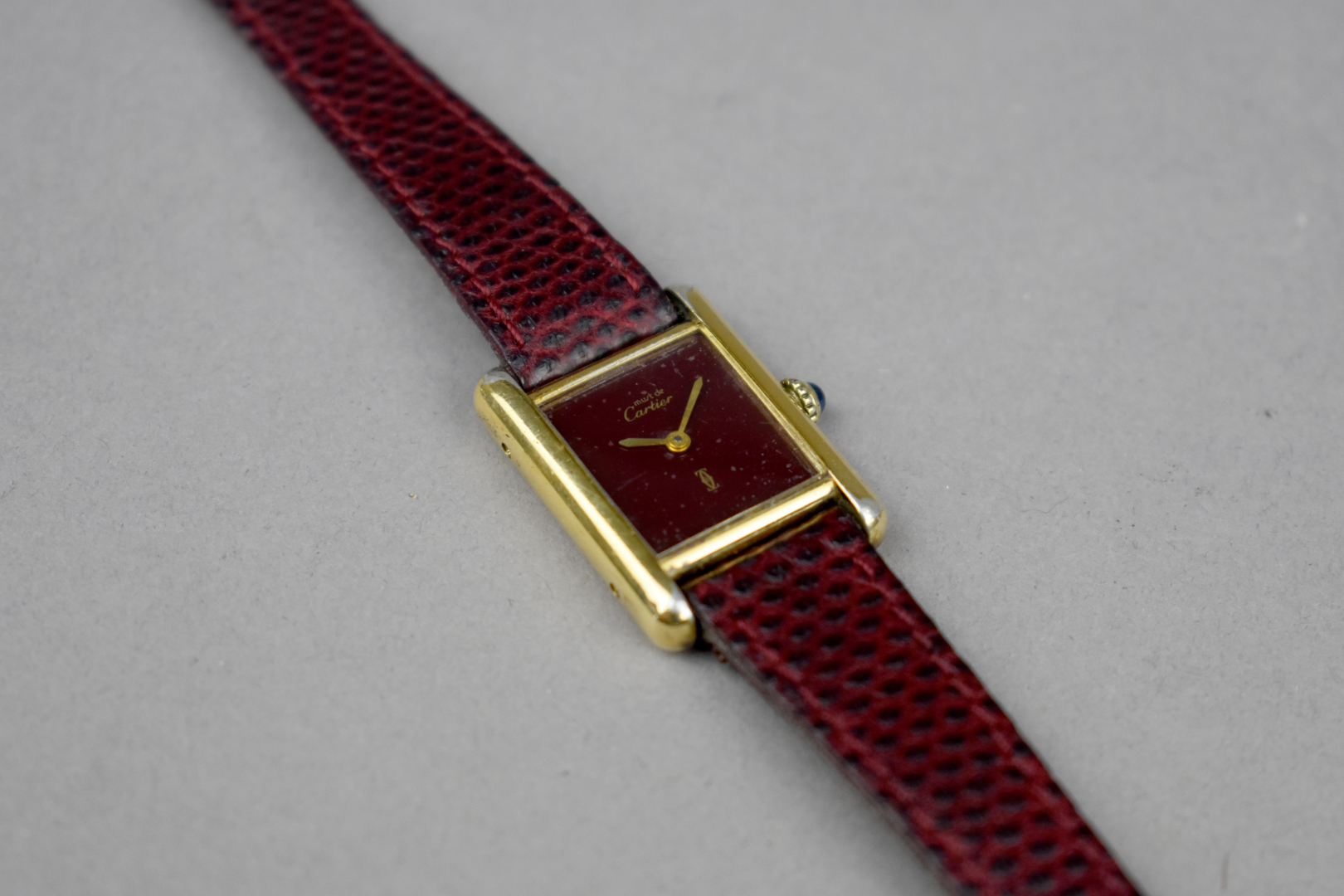 MUST DE CARTIER. Montre bracelet de dame modèle Tank en argent 925/1000e plaqué or. Boîtier rectangulaire, cadran muet à fond bordeaux signé, mouvement mécanique. Bracelet en cuir bordeau (usures). Poids brut : 19,39 g.