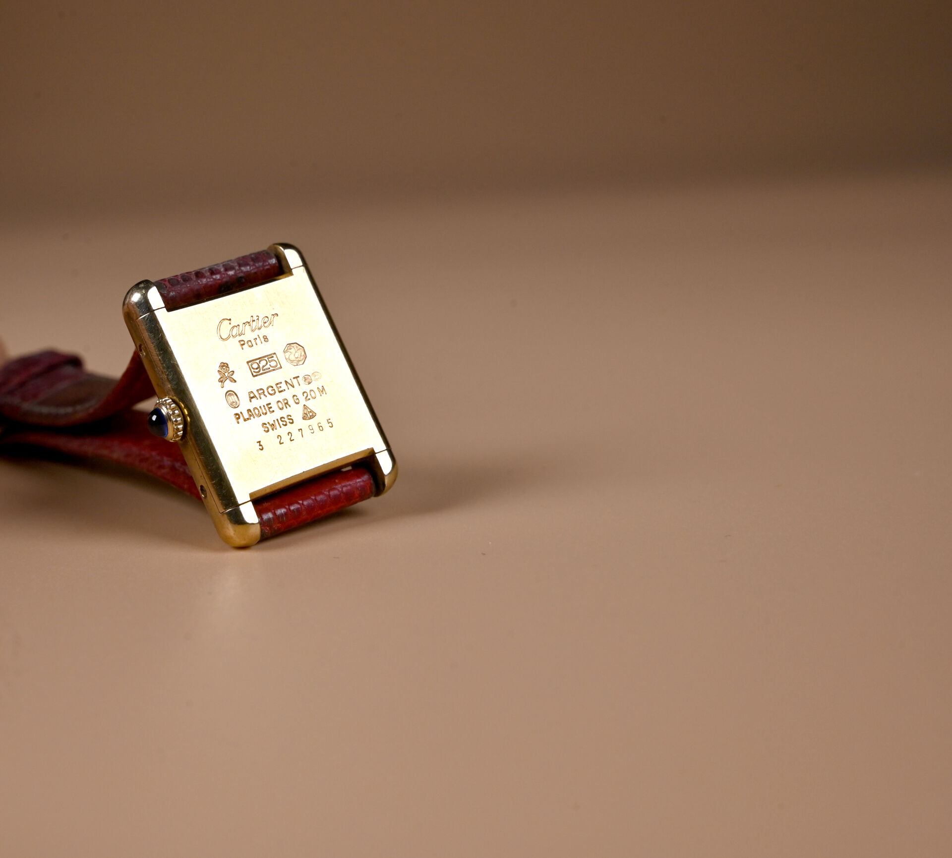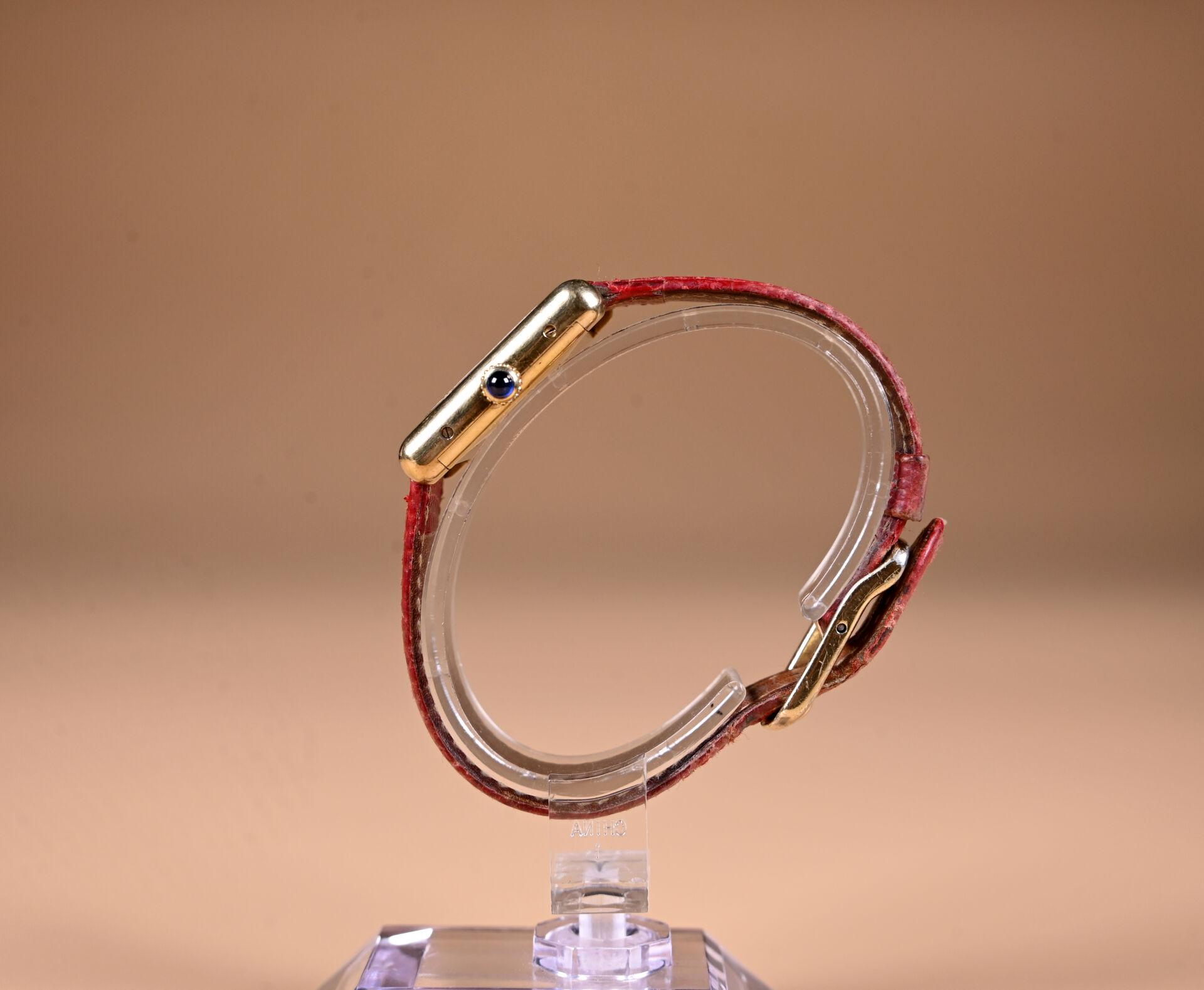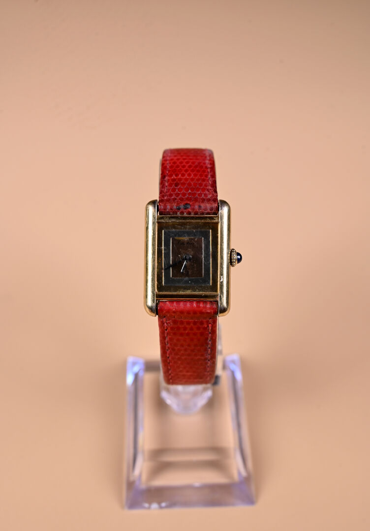 MUST DE CARTIER. Montre de dame modèle Tank, boitier rectangle en vermeil. Cadran signé fonds trinité. Mouvement mécanique à remontage manuel. Bracelet en lézard rouge sur boucle ardillon métal doré. Mouvement bloqué à réviser, bracelet rapporté, verre rayé.