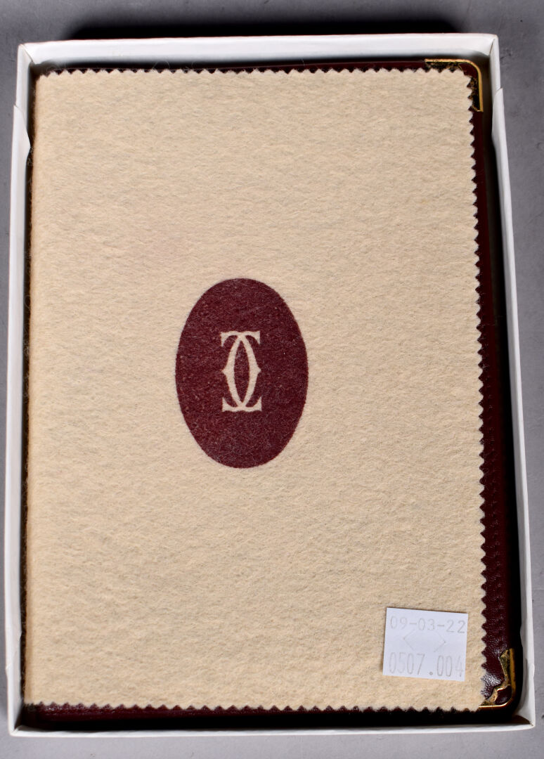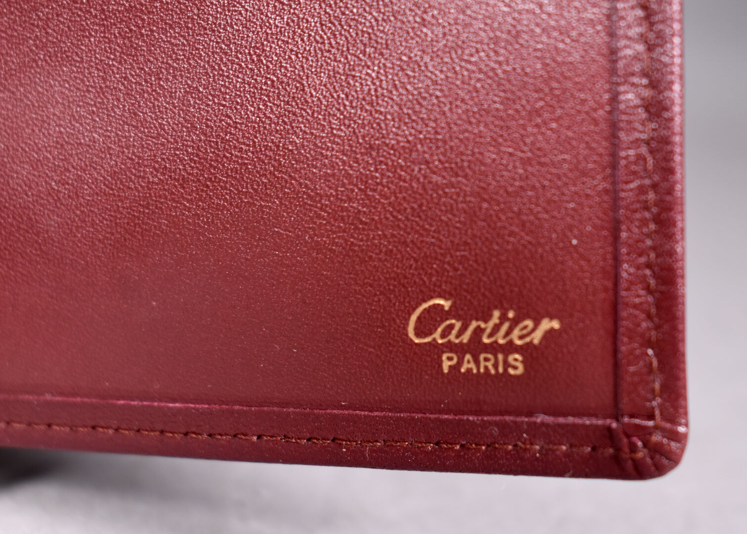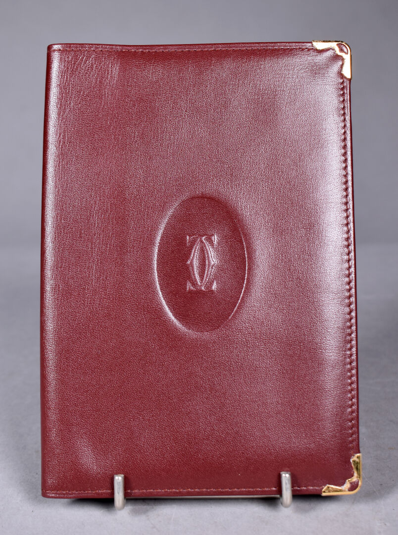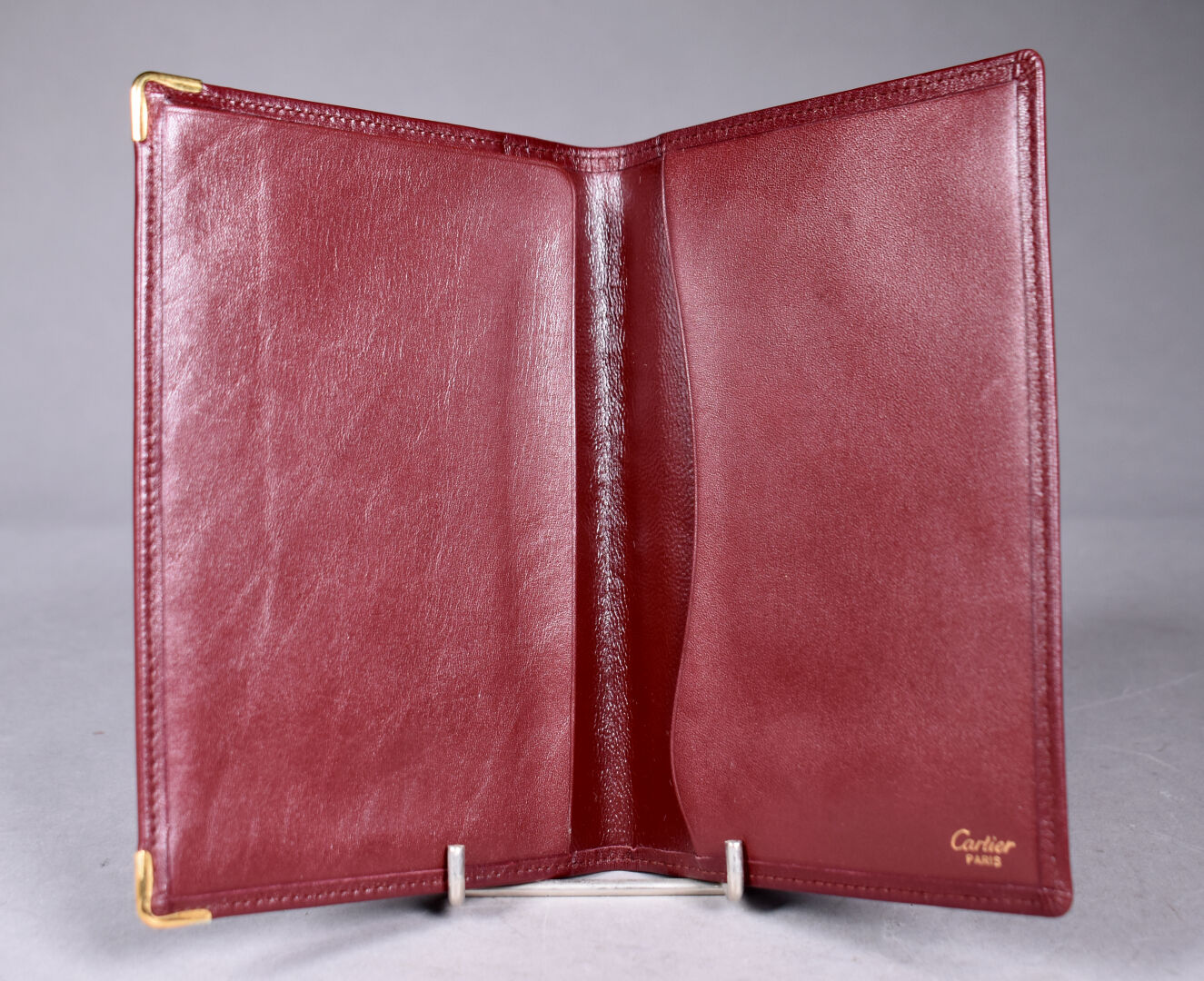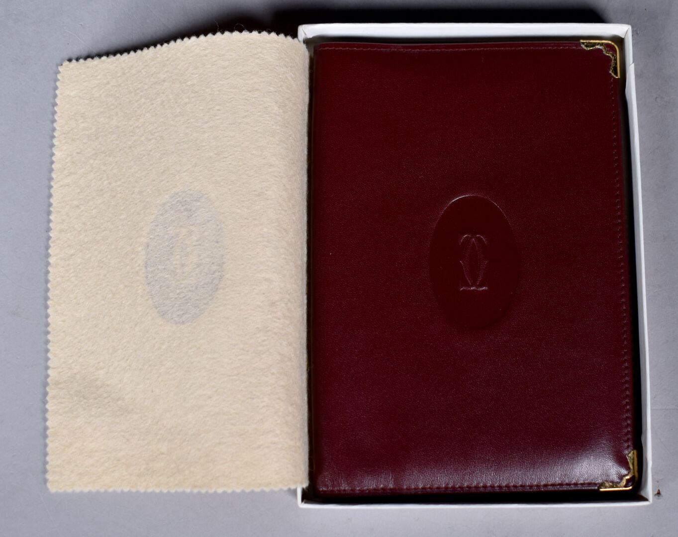 MUST DE CARTIER, porte-feuille en cuir bordeaux. Dans son étui. 17 x 12 cm.