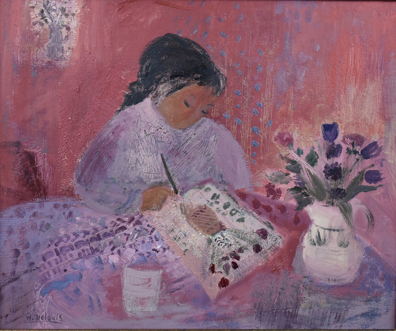Nancy DELOUIS (Née en 1941). « Petite fille dessinant ». Huile sur toile signée en bas à gauche et titrée au dos. 38 x 46 cm.