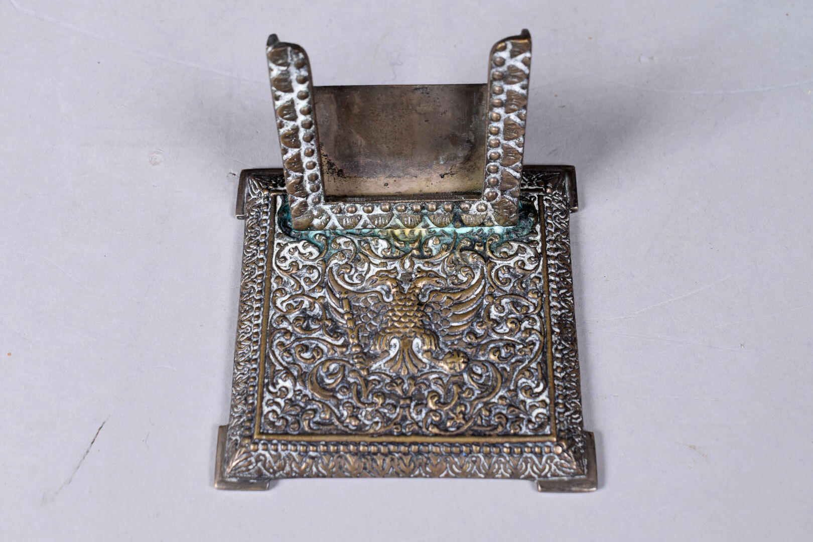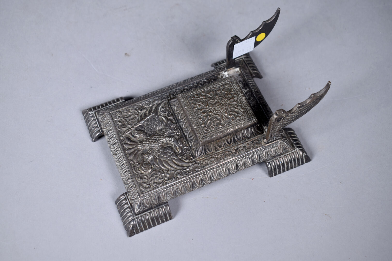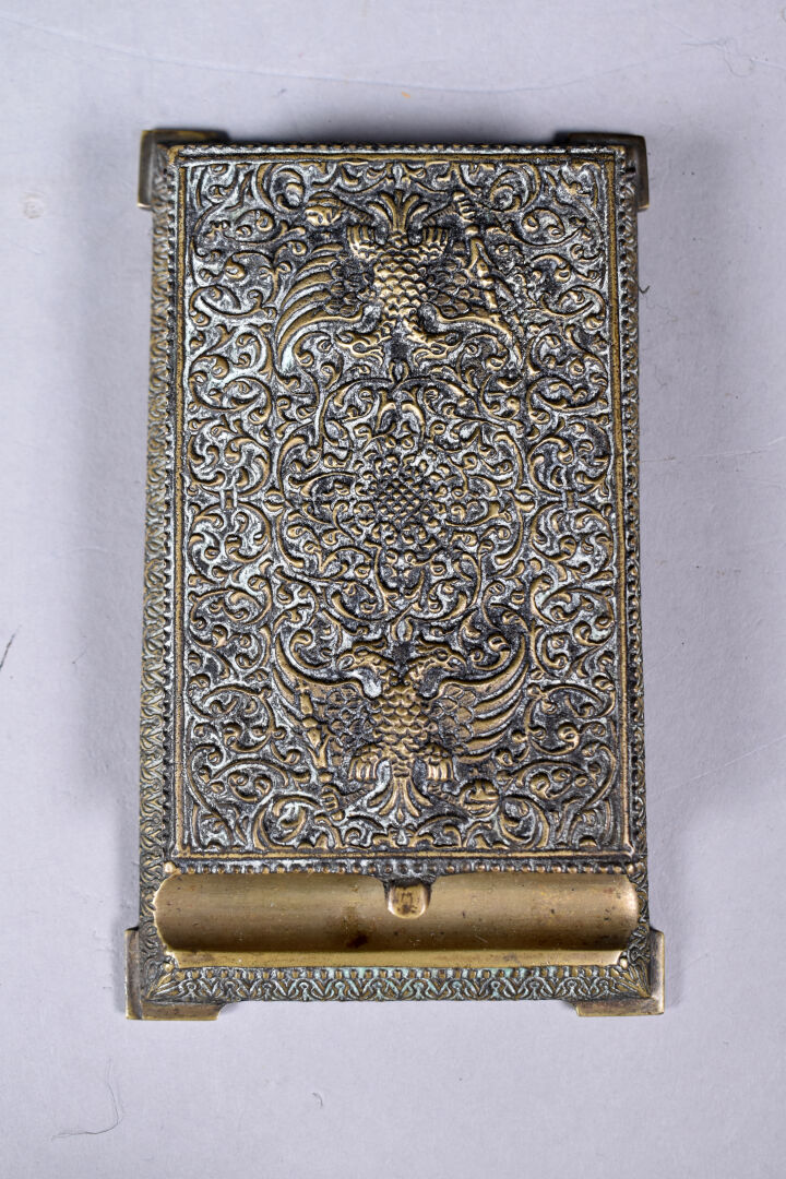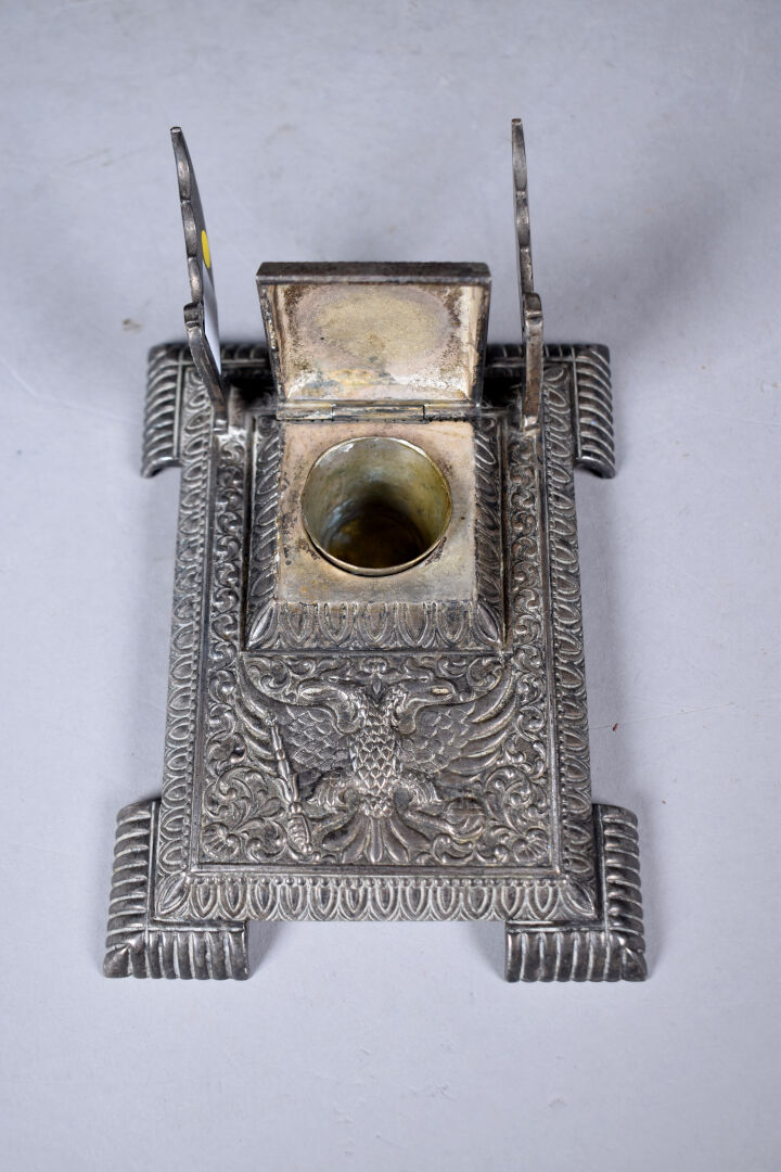 Necessaire de bureau en bronze argenté à décor ciselé d’un aigle bicéphale sur fond d’entrelacs végétaux (quelques usures). Il comprend un encrier, un porte note, un porte carnet, un buvard. Début du XXe siècle.