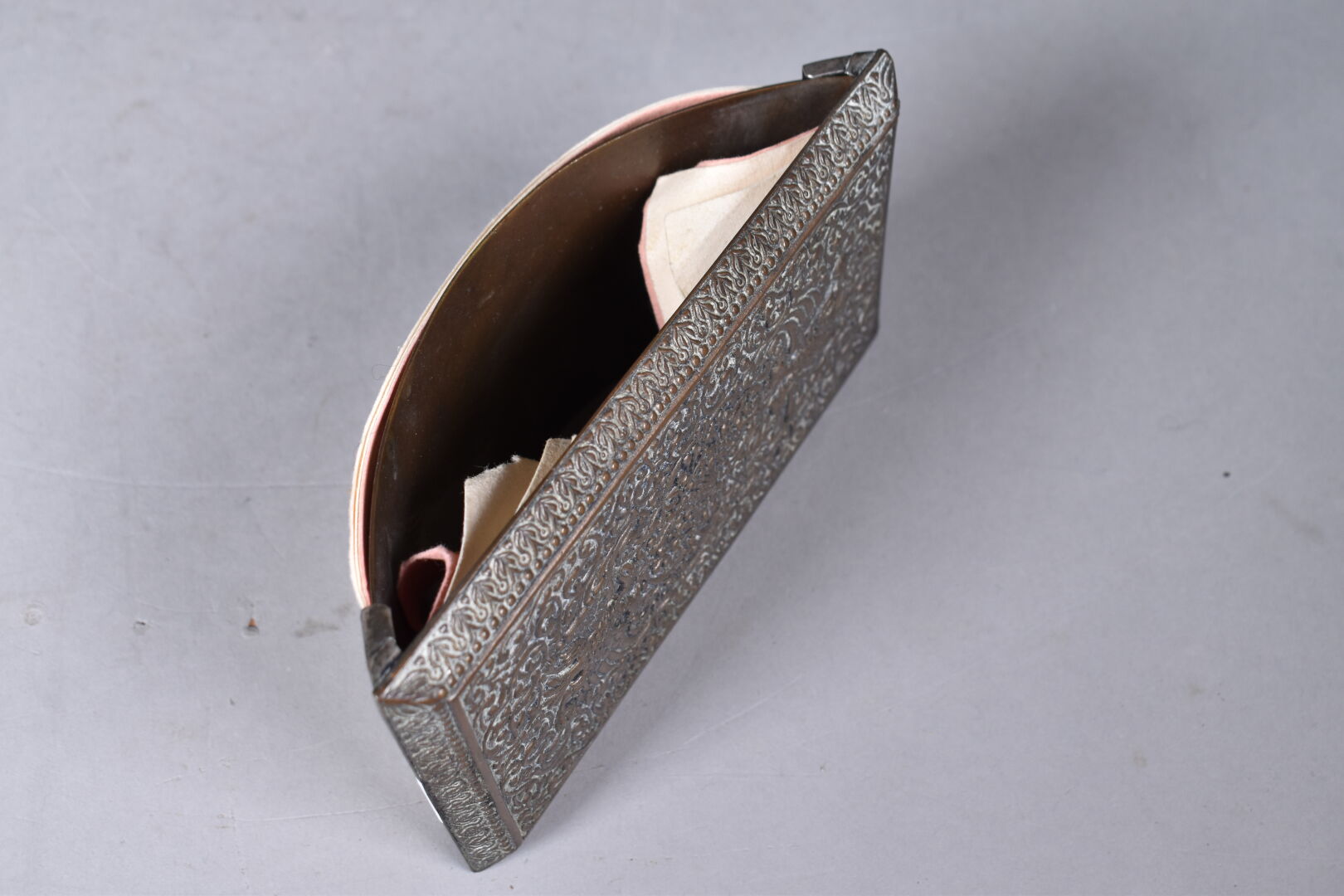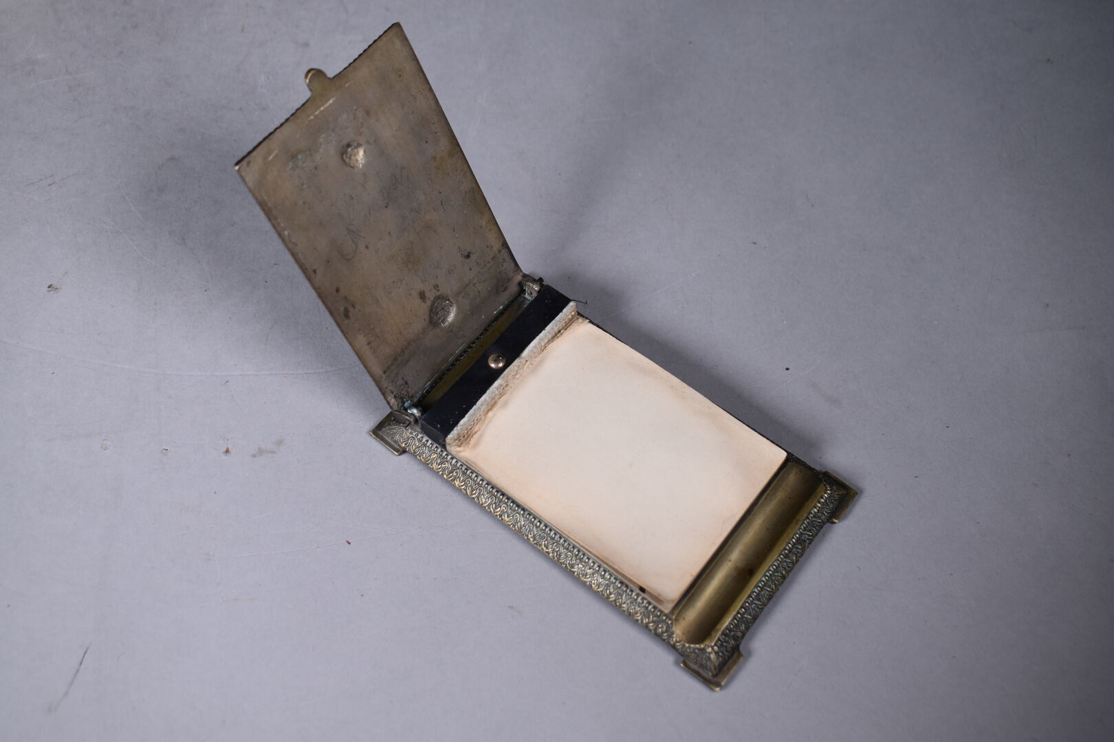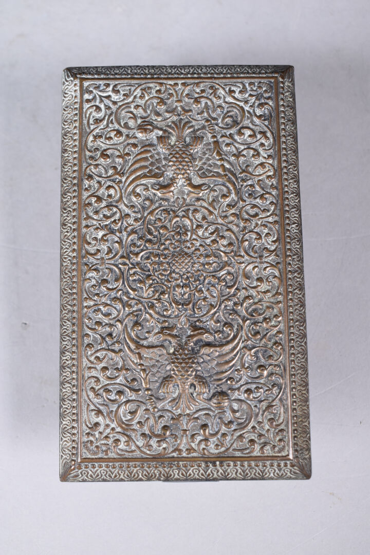 Necessaire de bureau en bronze argenté à décor ciselé d’un aigle bicéphale sur fond d’entrelacs végétaux (quelques usures). Il comprend un encrier, un porte note, un porte carnet, un buvard. Début du XXe siècle.