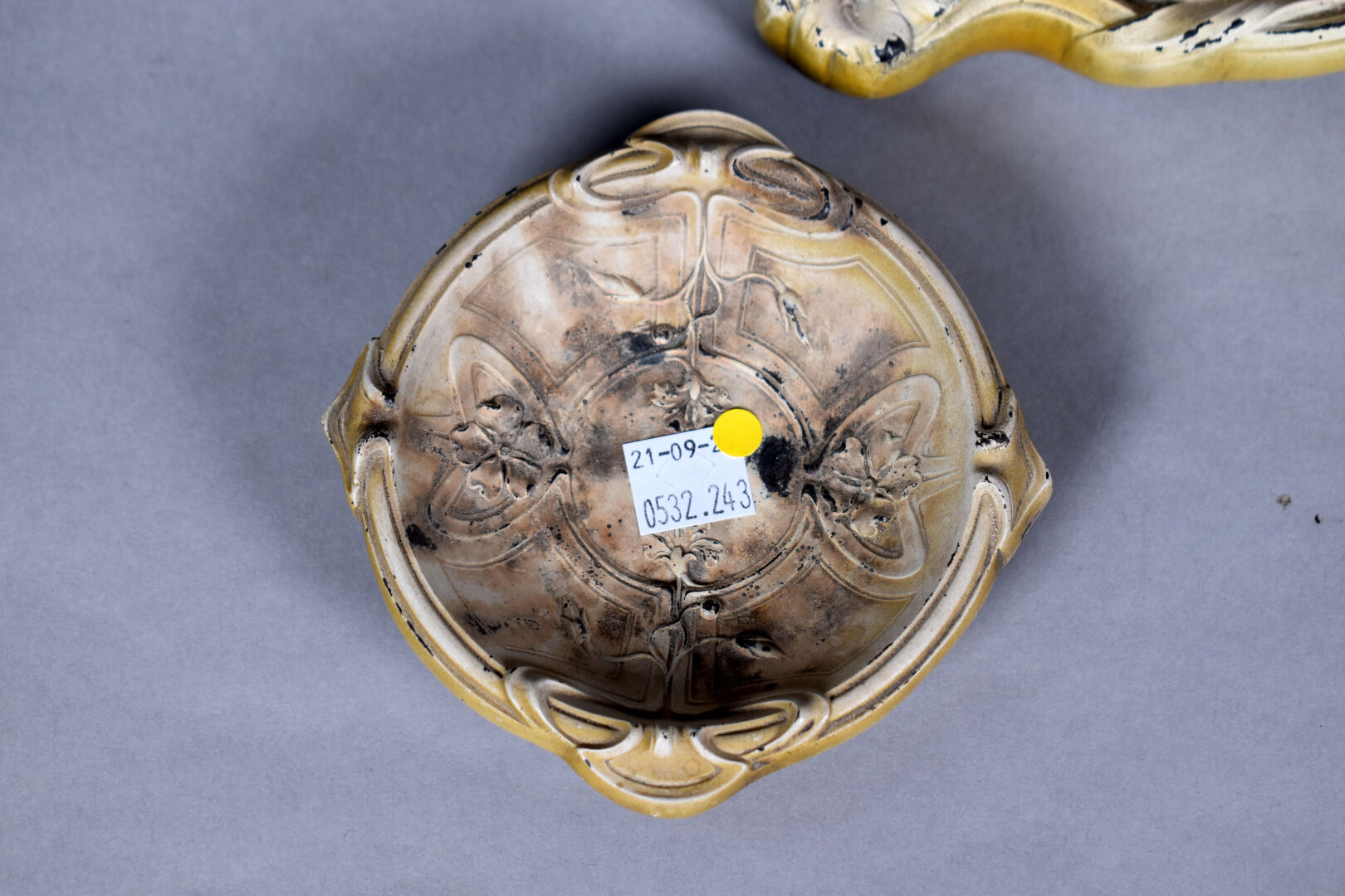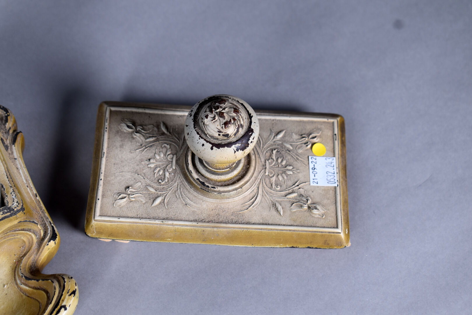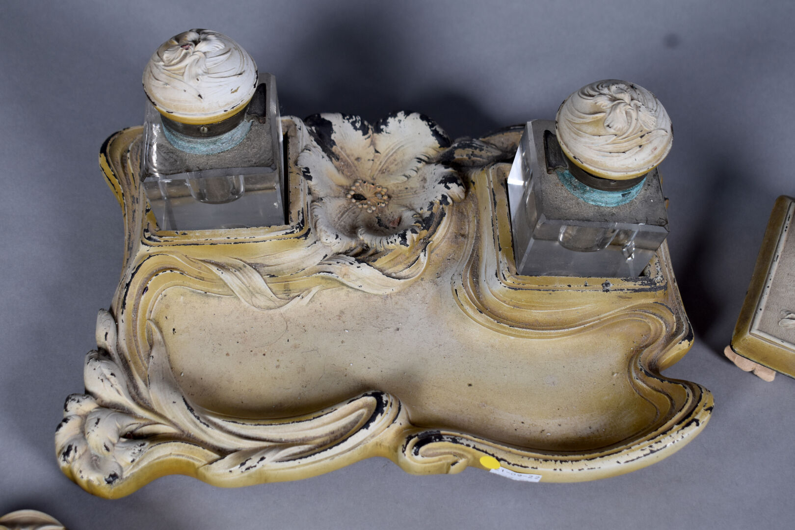 Necessaire de bureau en carton bouilli et bois laqué crème à décor sculpté d’iris comprenant un buvard, un cendrier et un encrier double (usures et manques à la couleur). Epoque Art Nouveau. Dim. de l’encrier : Haut. : 13,5 cm – Larg. : 27 cm – Prof. : 18 cm.