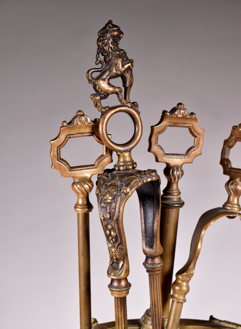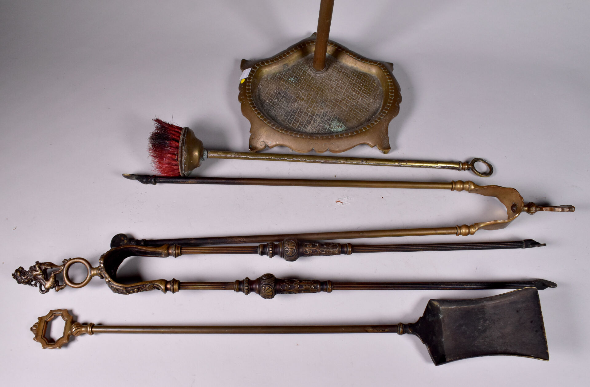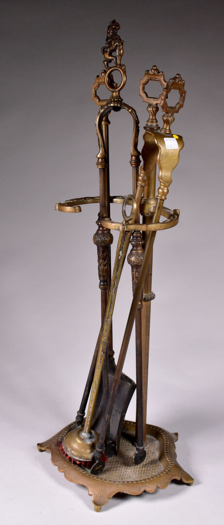Nécessaire de cheminée dépareillé en bronze laiton comprenant un support, une pelle, une brosse et deux pinces.