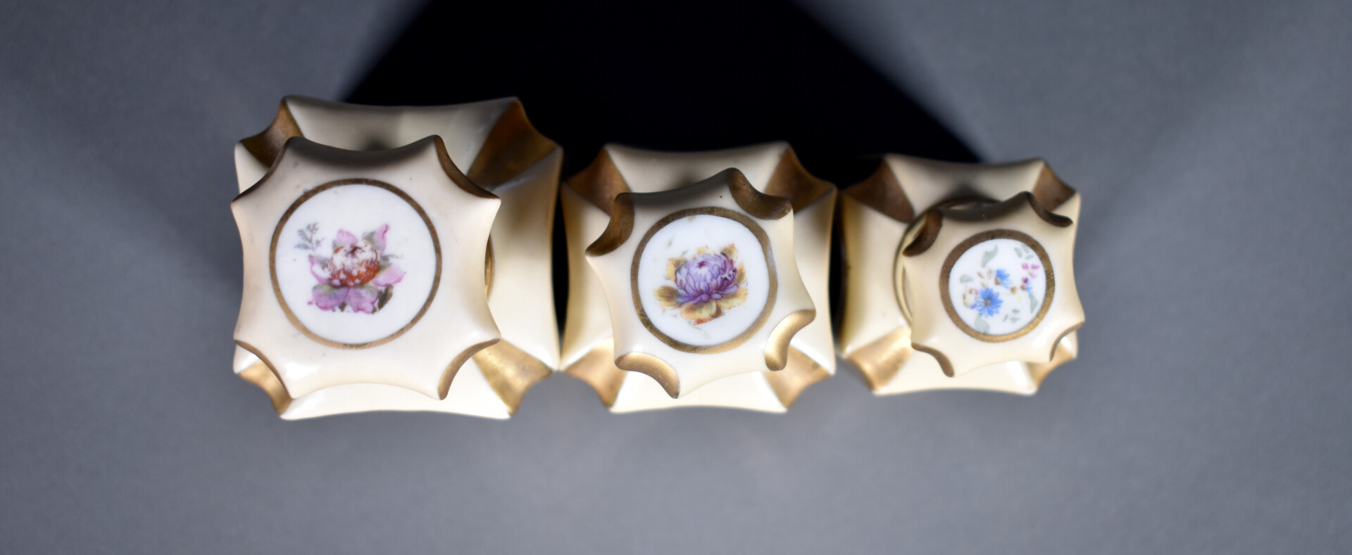 Necessaire de toilette à trois flacons et leurx bouchons en porcelaine à décor émaillé de bouquets de fleurs en polychomie dans des réserves sur fond crème et or. Vers 1900. Haut. du plus grand : 14,5 cm.
