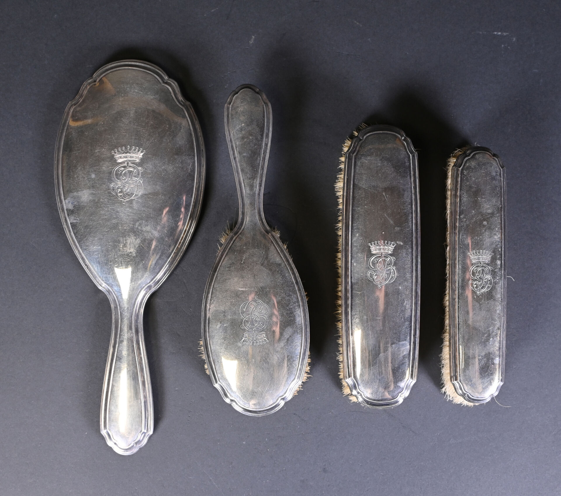 Nécessaire de toilette en argent 925/1000e à décor ciselé d’un chiffre sous une couronne de Comte soit trois brosses et un miroir face à main. Poids brut total : 870 g.
