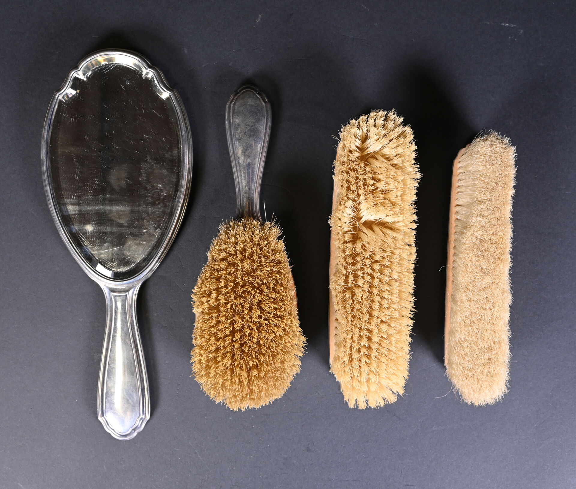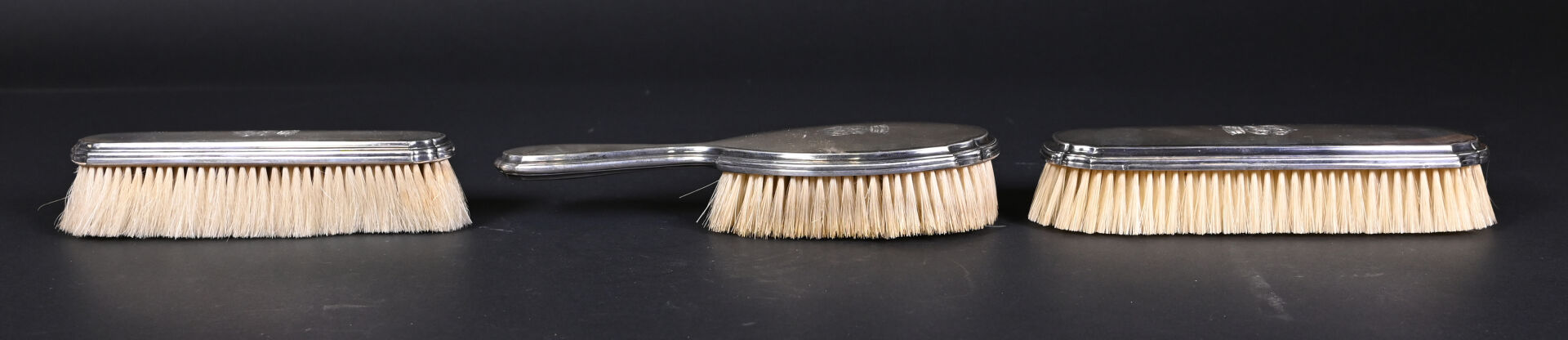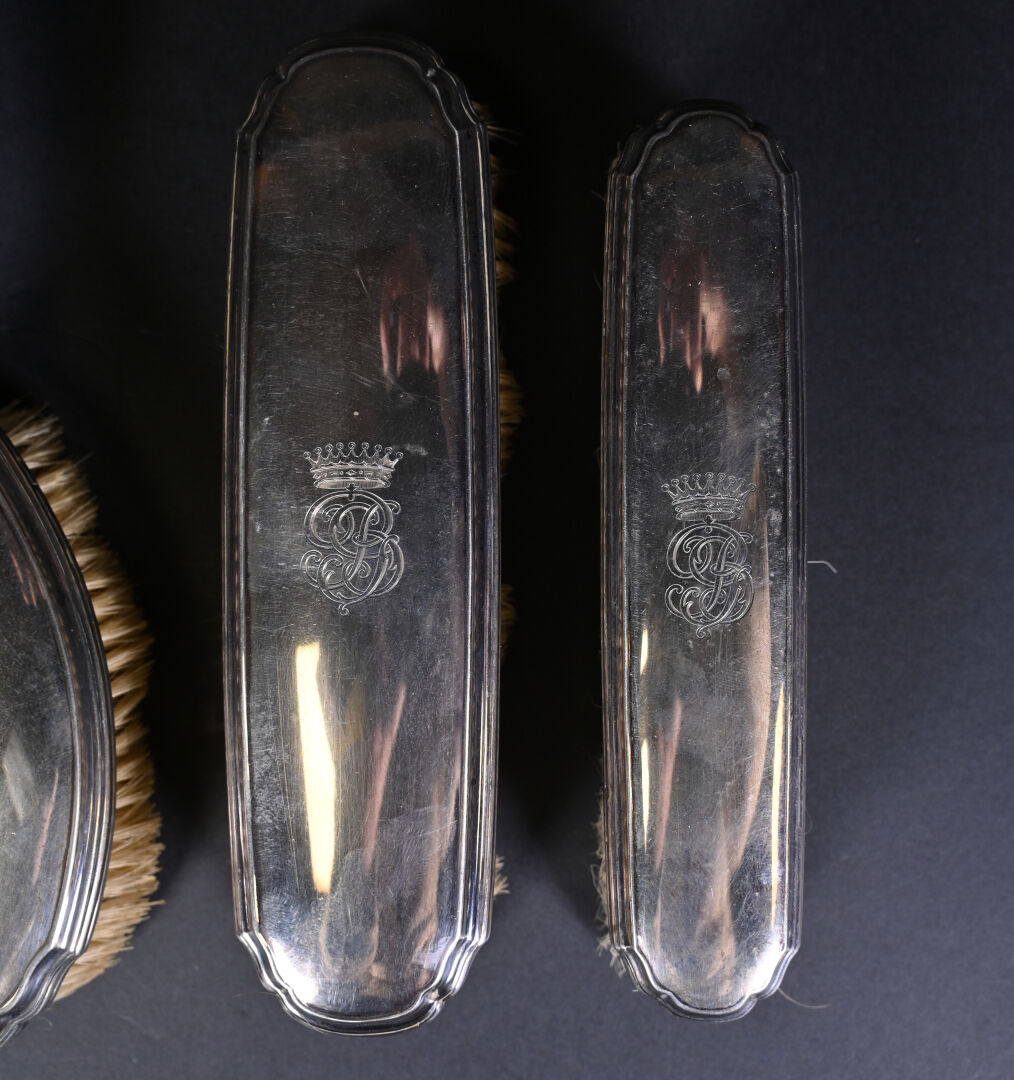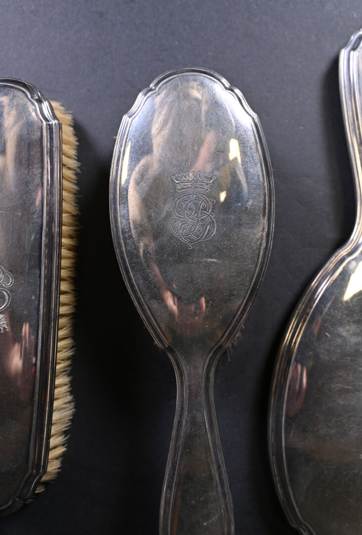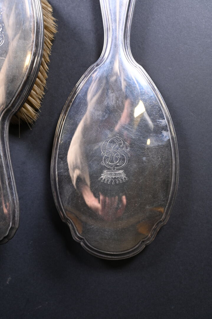 Nécessaire de toilette en argent 925/1000e à décor ciselé d’un chiffre sous une couronne de Comte soit trois brosses et un miroir face à main. Poids brut total : 870 g.