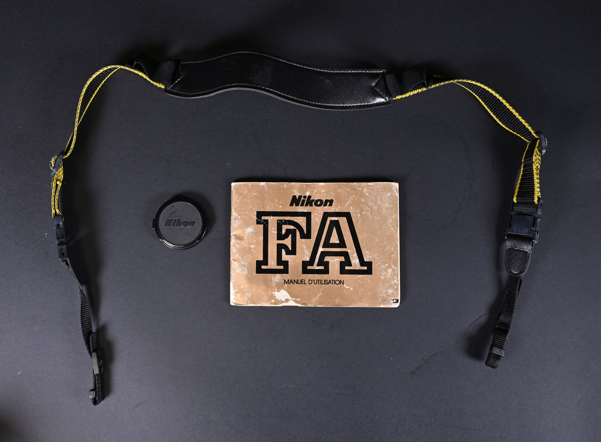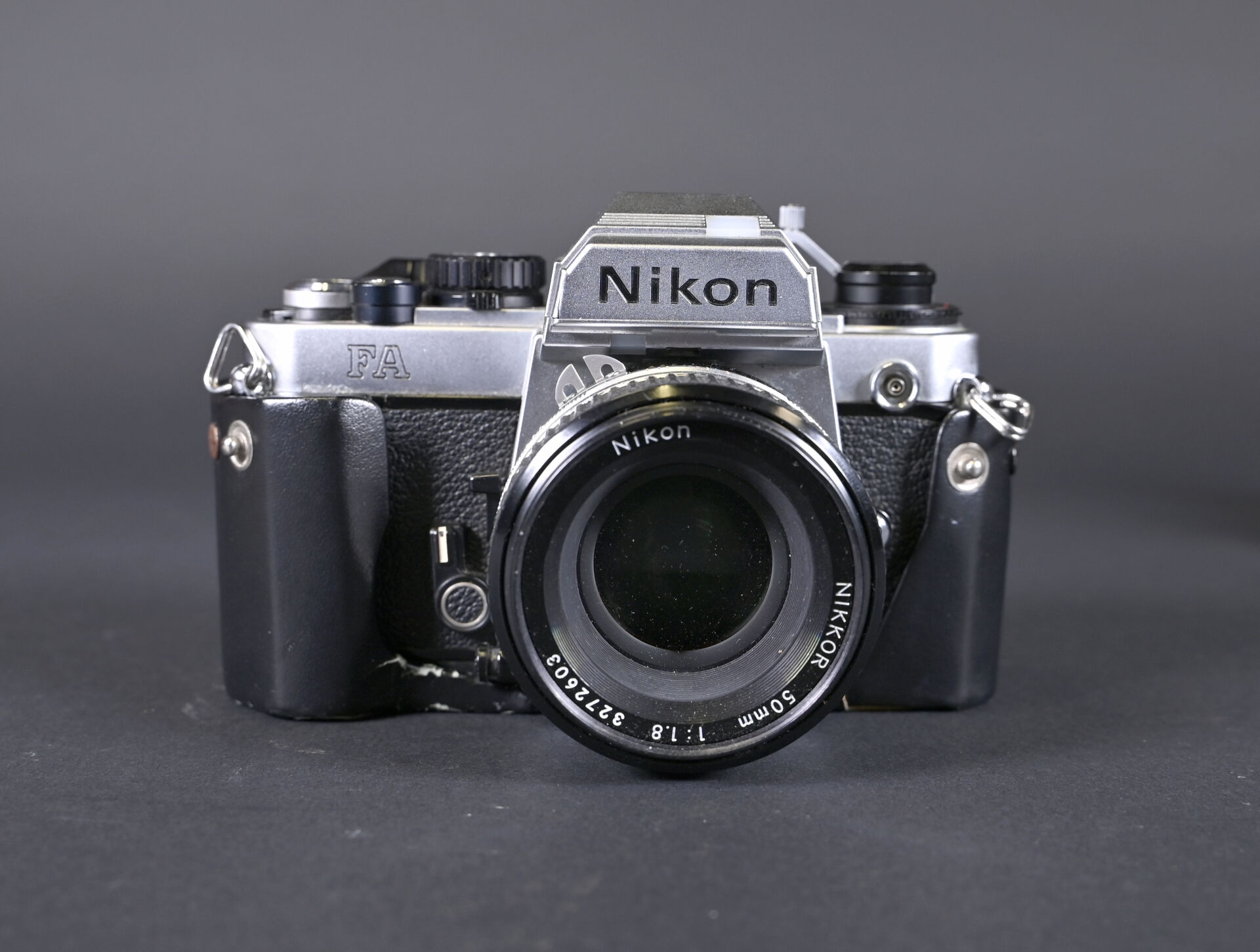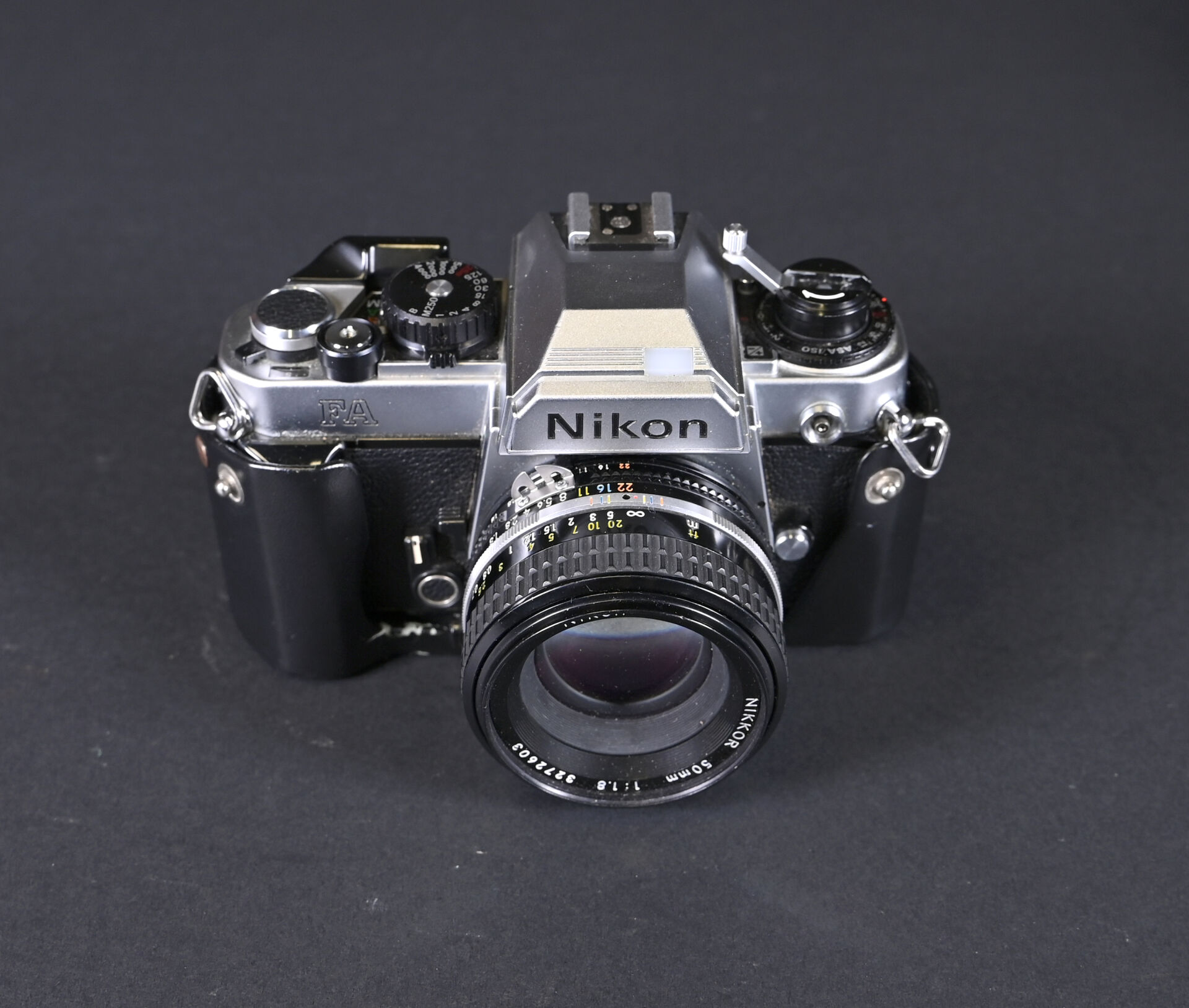 NIKON. Appareil photo argentique FA avec objectif NIKKOR 50mm 1:1.8. Avec étui, bandoulière et notice.