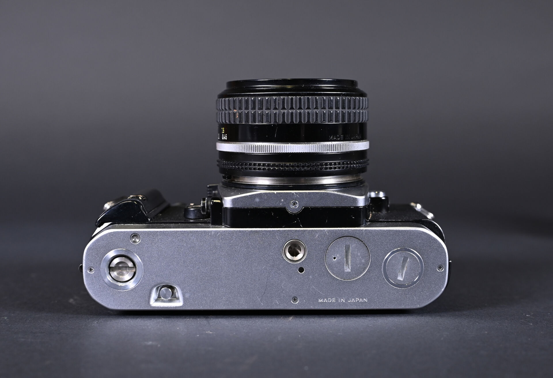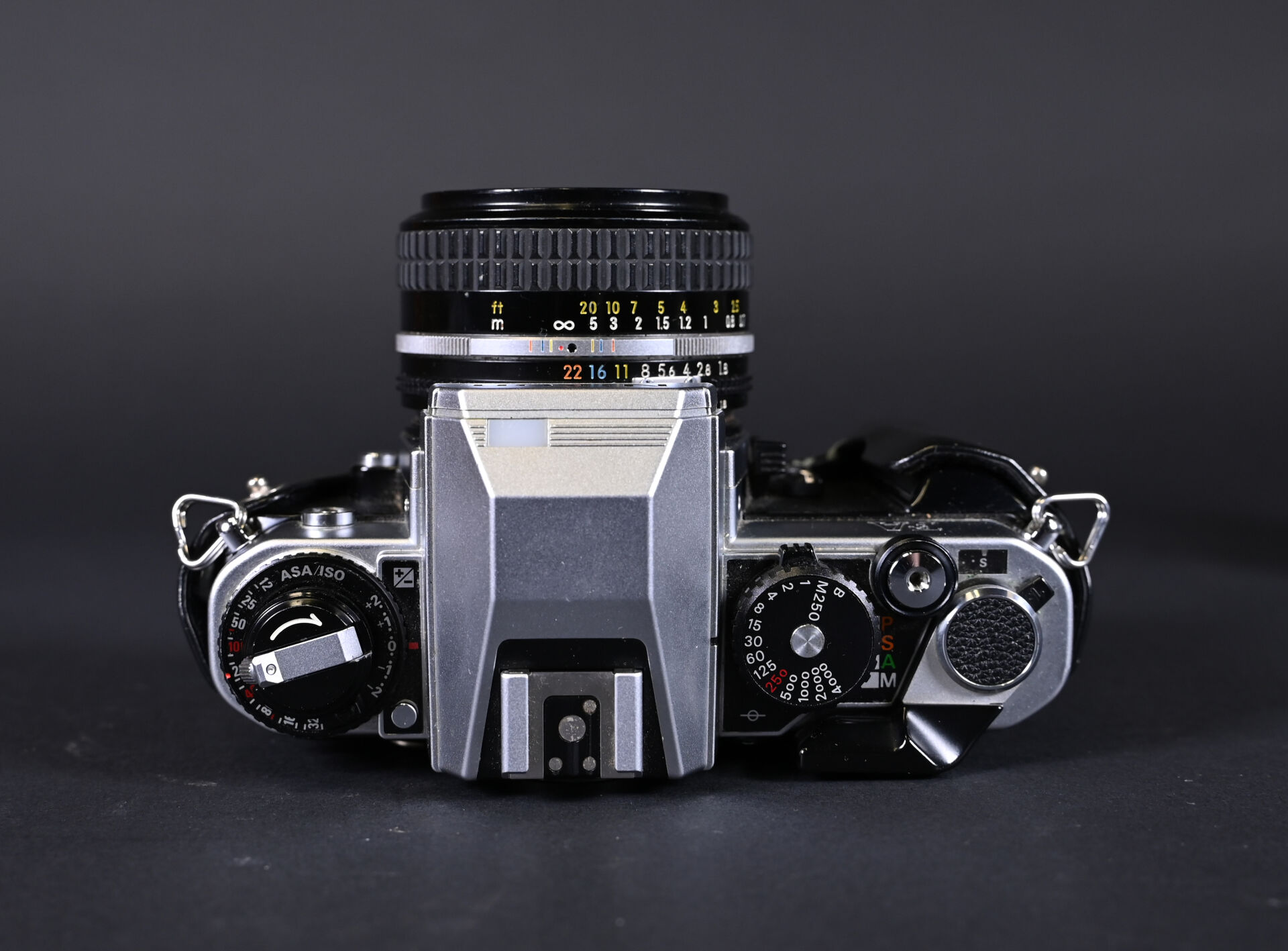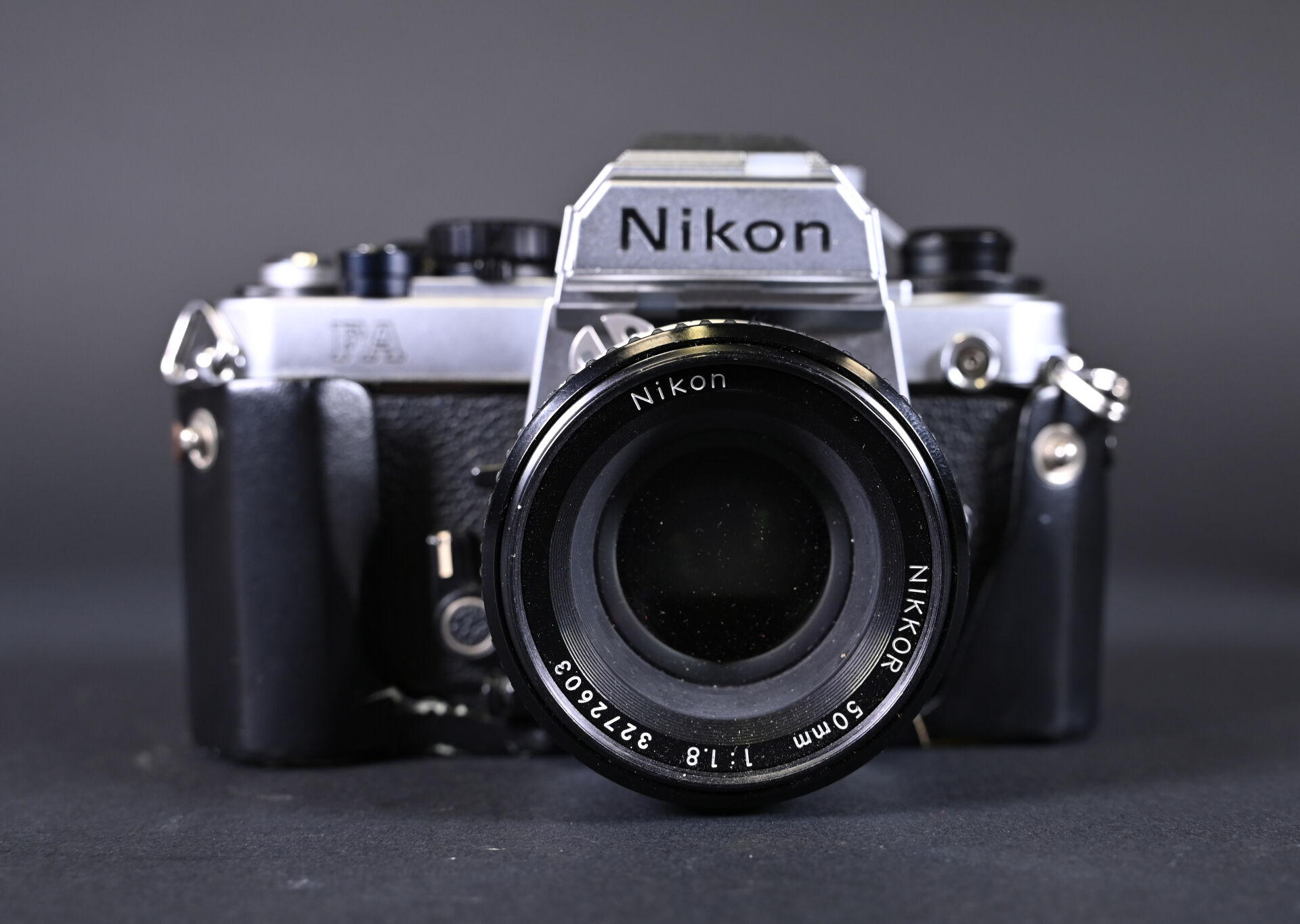 NIKON. Appareil photo argentique FA avec objectif NIKKOR 50mm 1:1.8. Avec étui, bandoulière et notice.