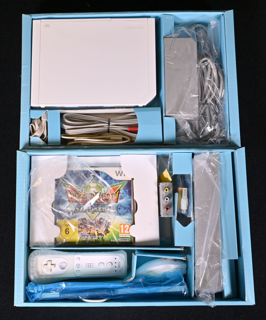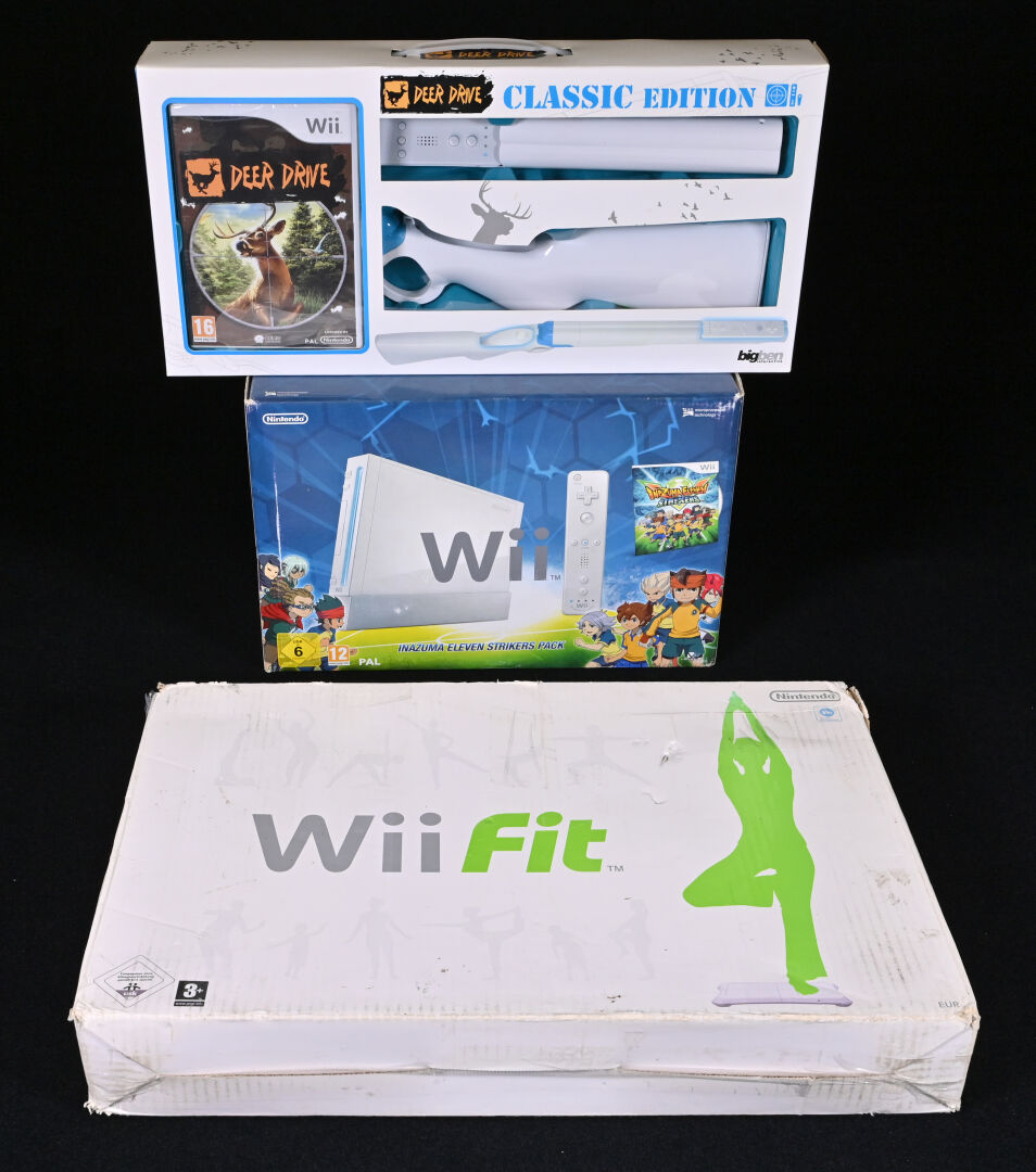 NINTENDO. Ensemble comprenant un coffret WII INAZUMA ELEVEN STRIKERS (console, manette et jeu compris), un coffret DEER DRIVE CLASSIC EDITION (jeu compris) et un coffret WII FIT.