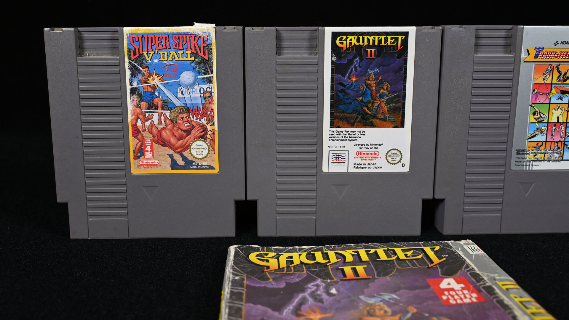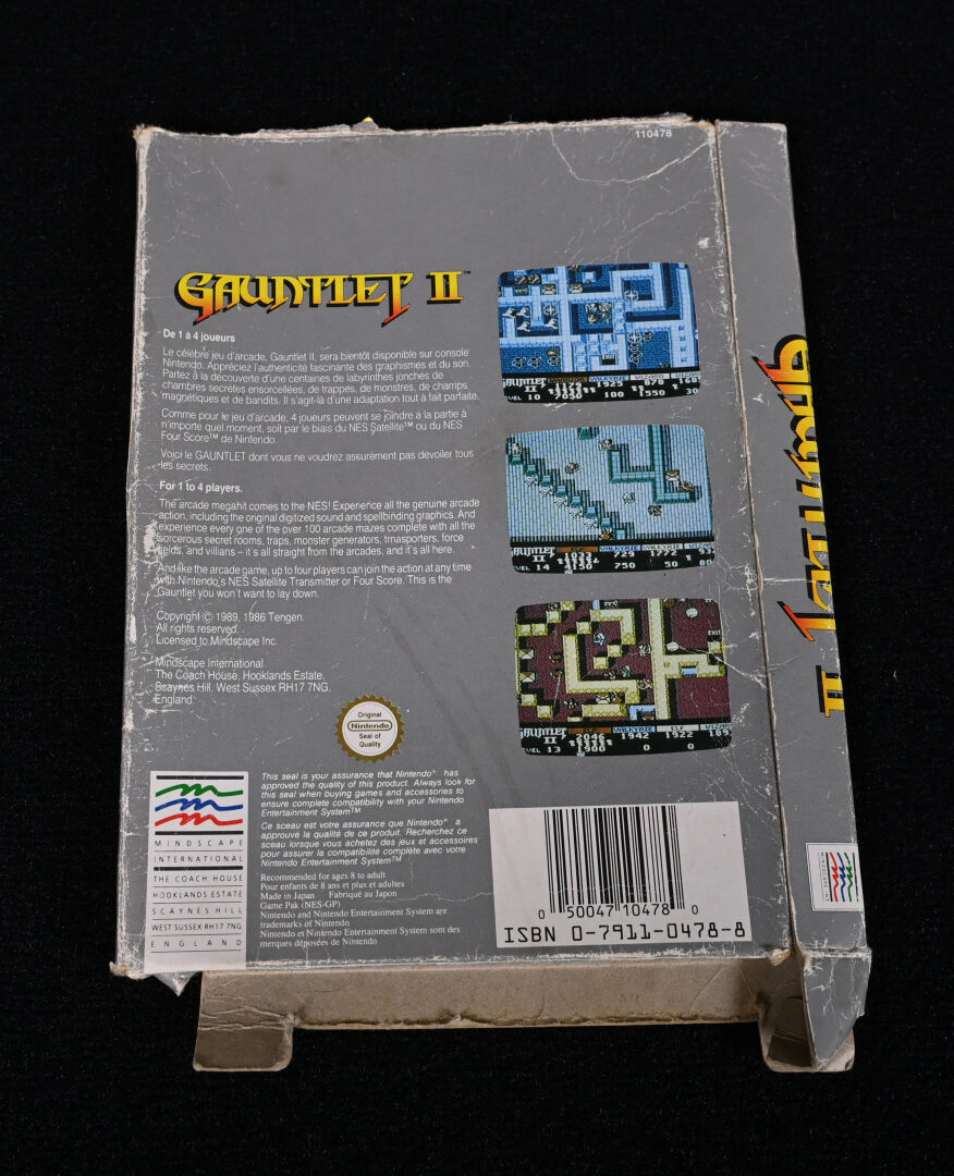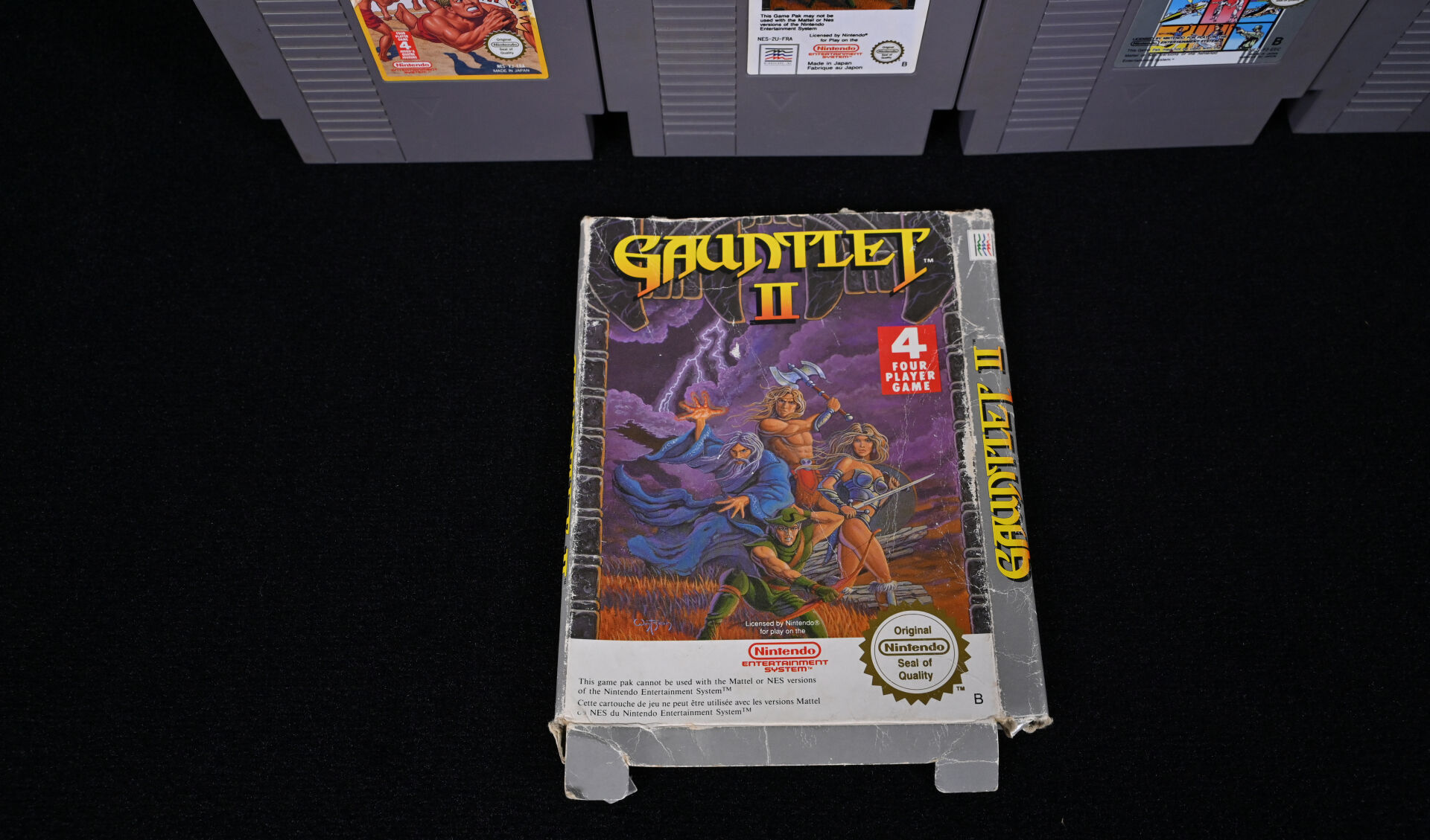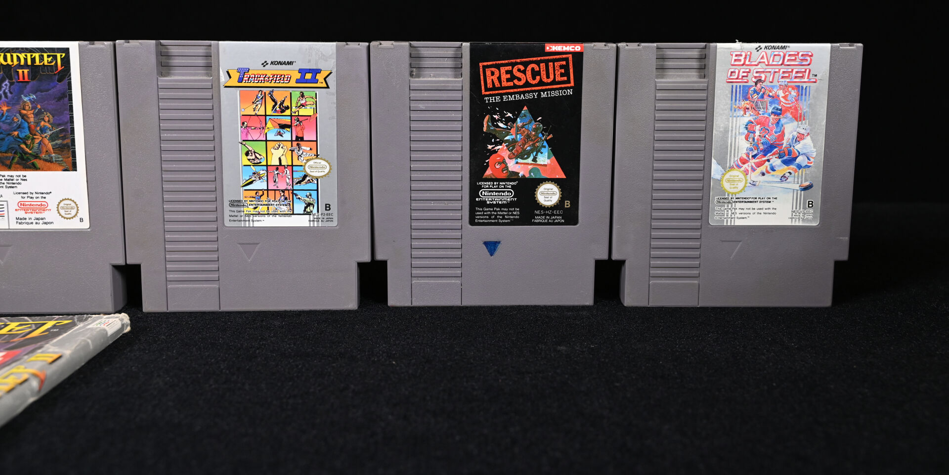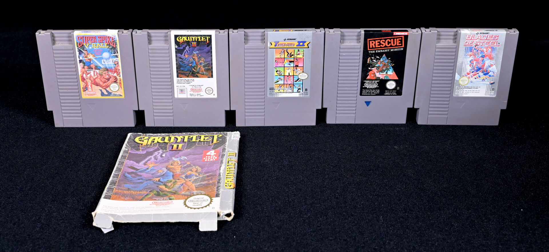 NINTENDO. Ensemble de 5 jeux NES soit GAUNTLET II et sa boite (abimée), RESCUE THE EMBASSY MISSION, TRACK & FIELD II, BLADES OF STEEL et SUPER SRIKE V’BALL.