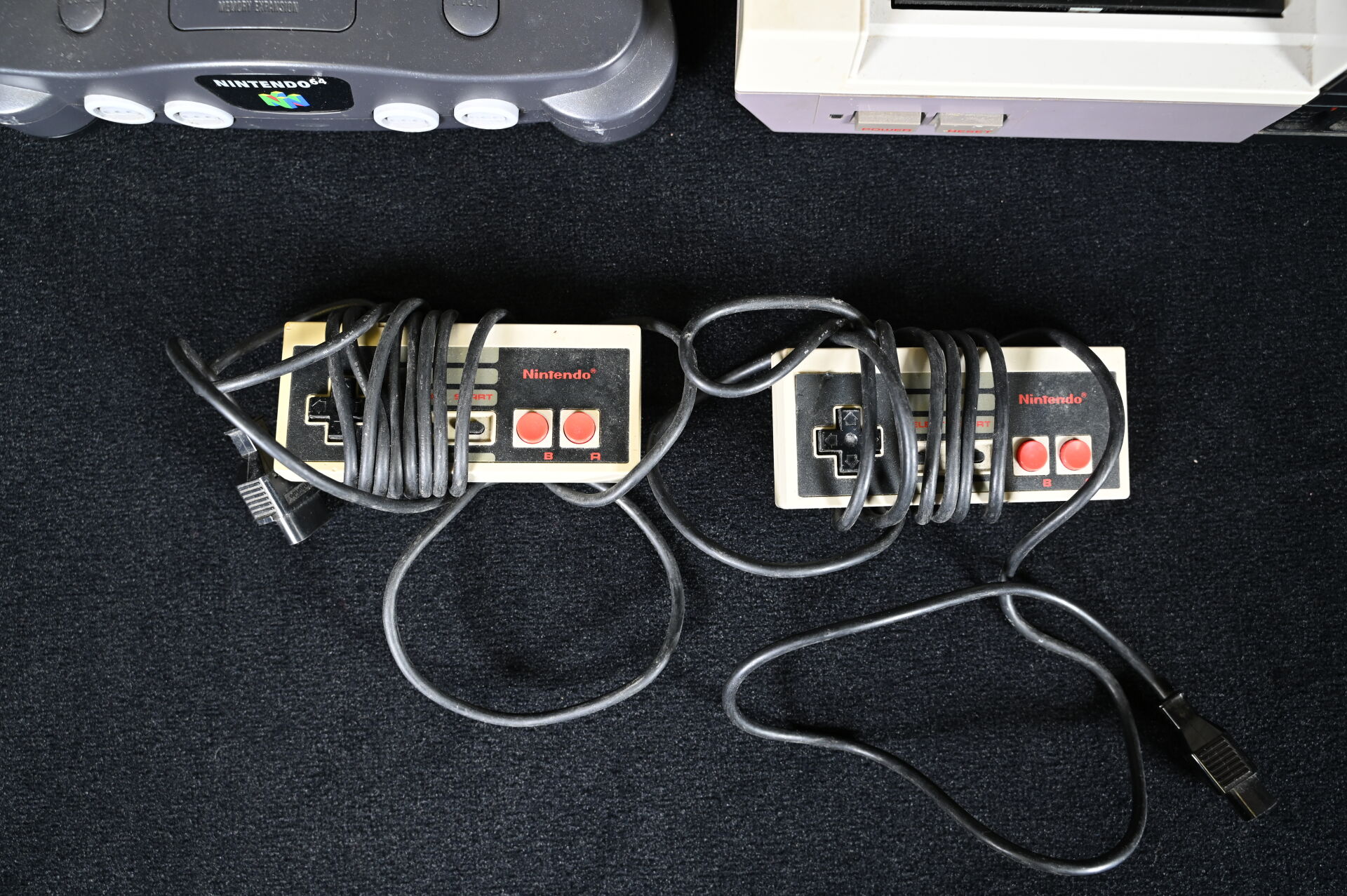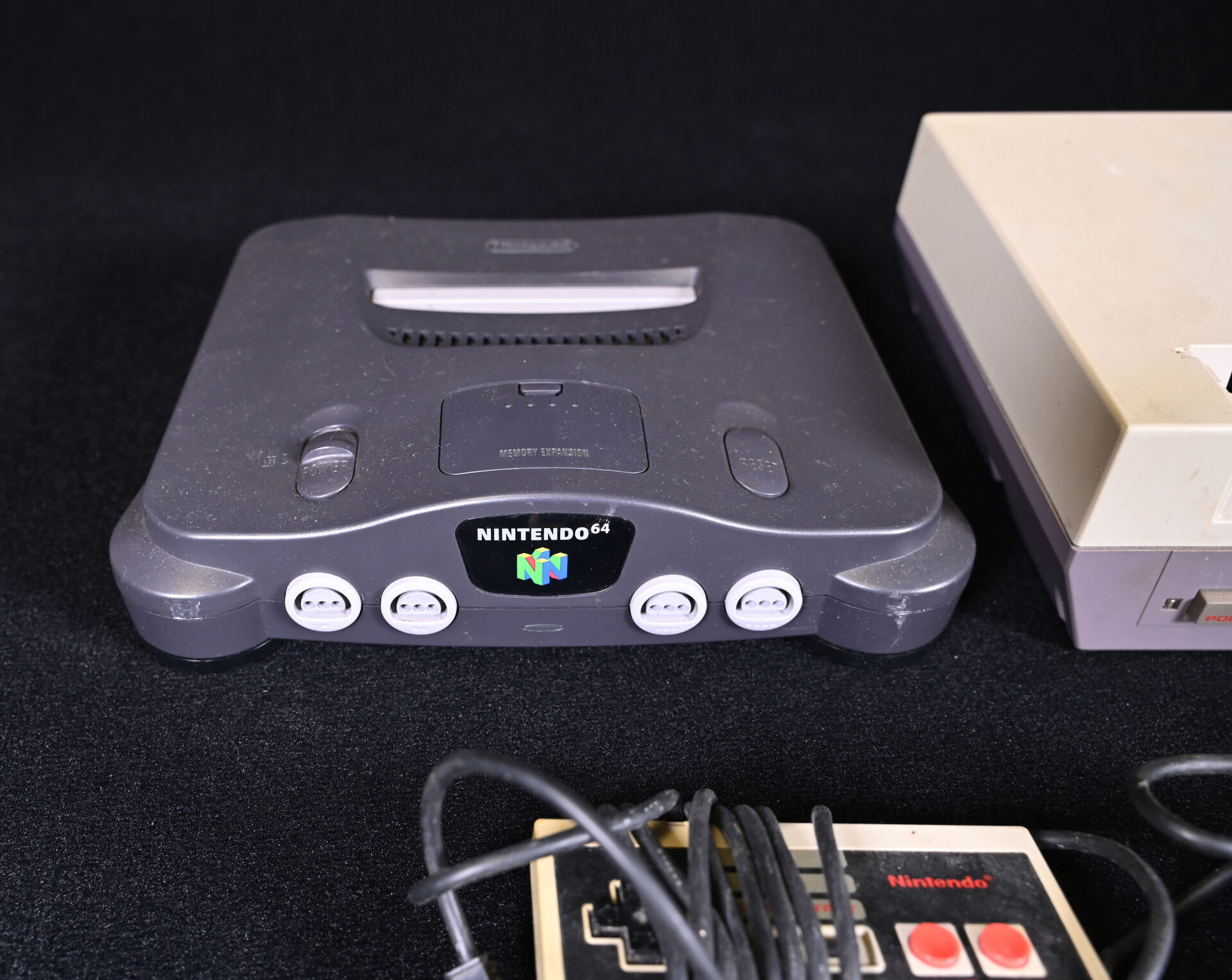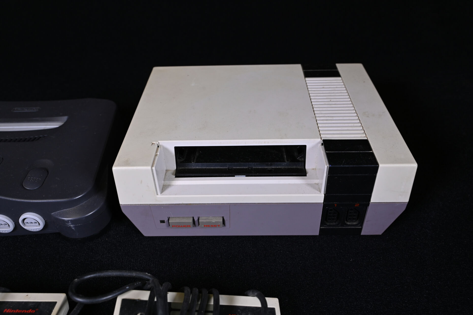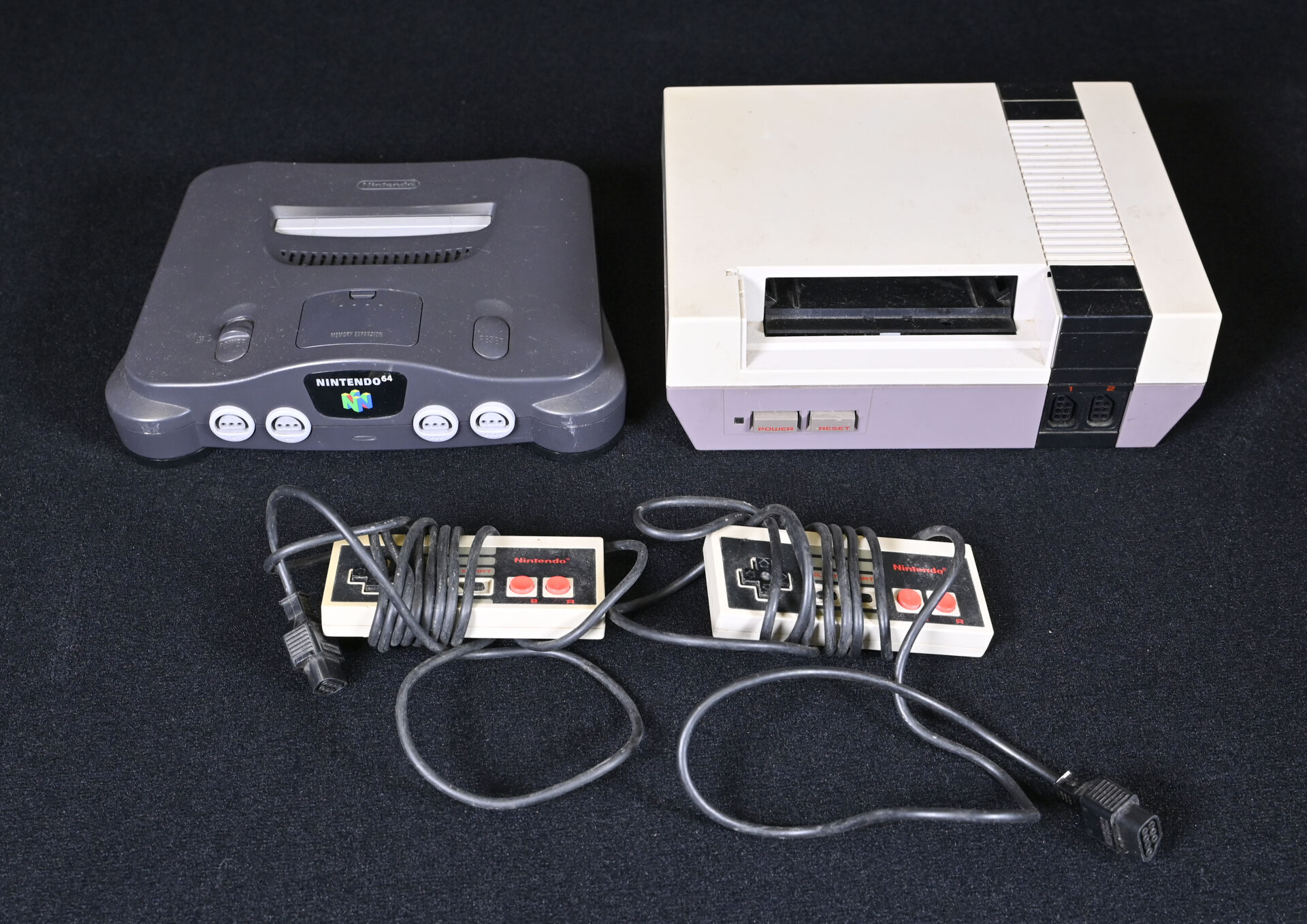 NINTENDO. Une console NINTENDO 64, une console NES et deux manettes (usures d’usage, manque).