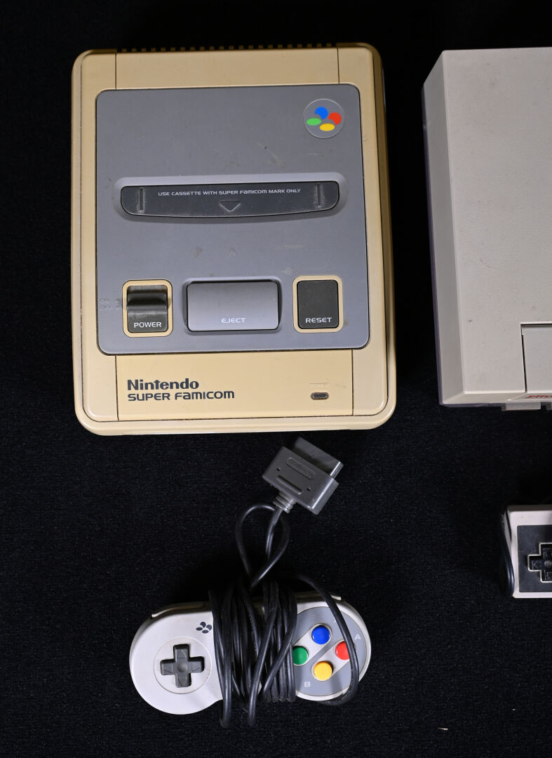 NINTENDO. Une console NINTENDO SUPER FAMIMCOM et une manette, une console NES et une manette (usures d’usage).