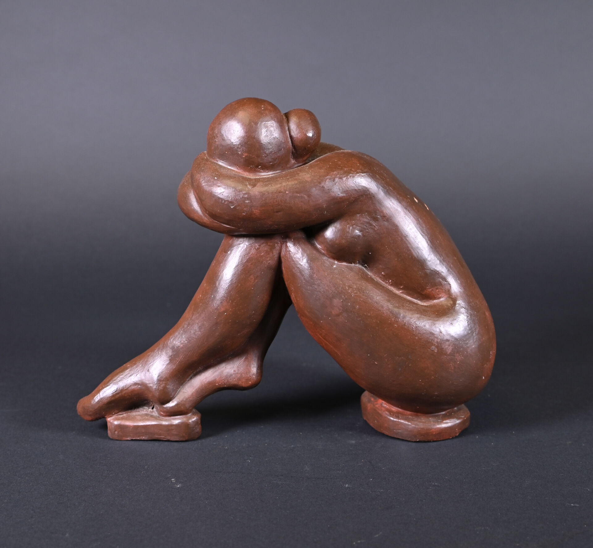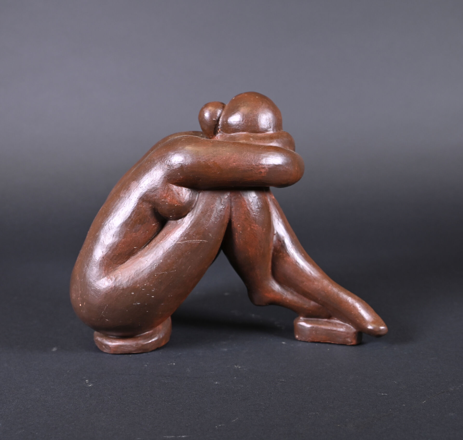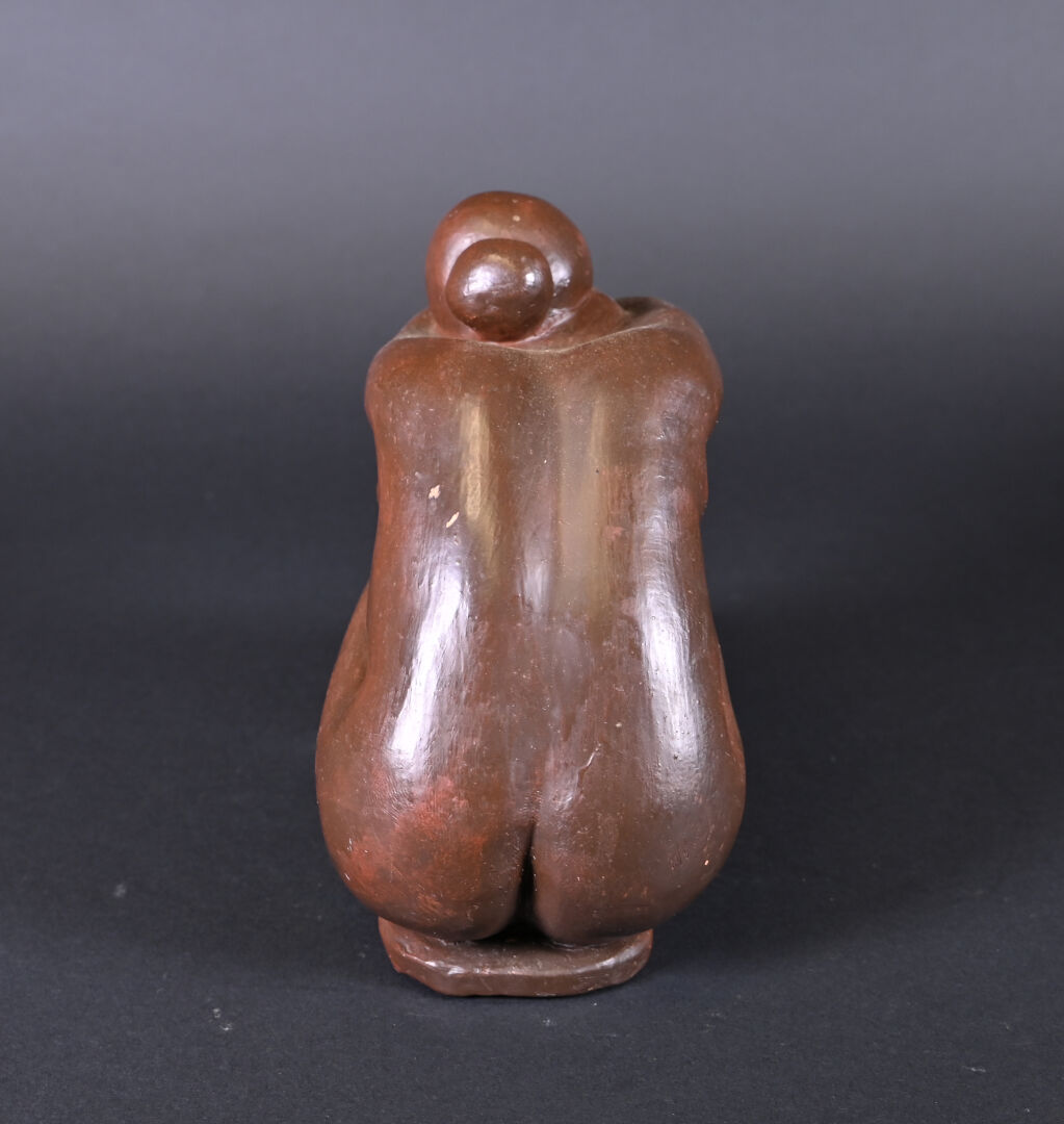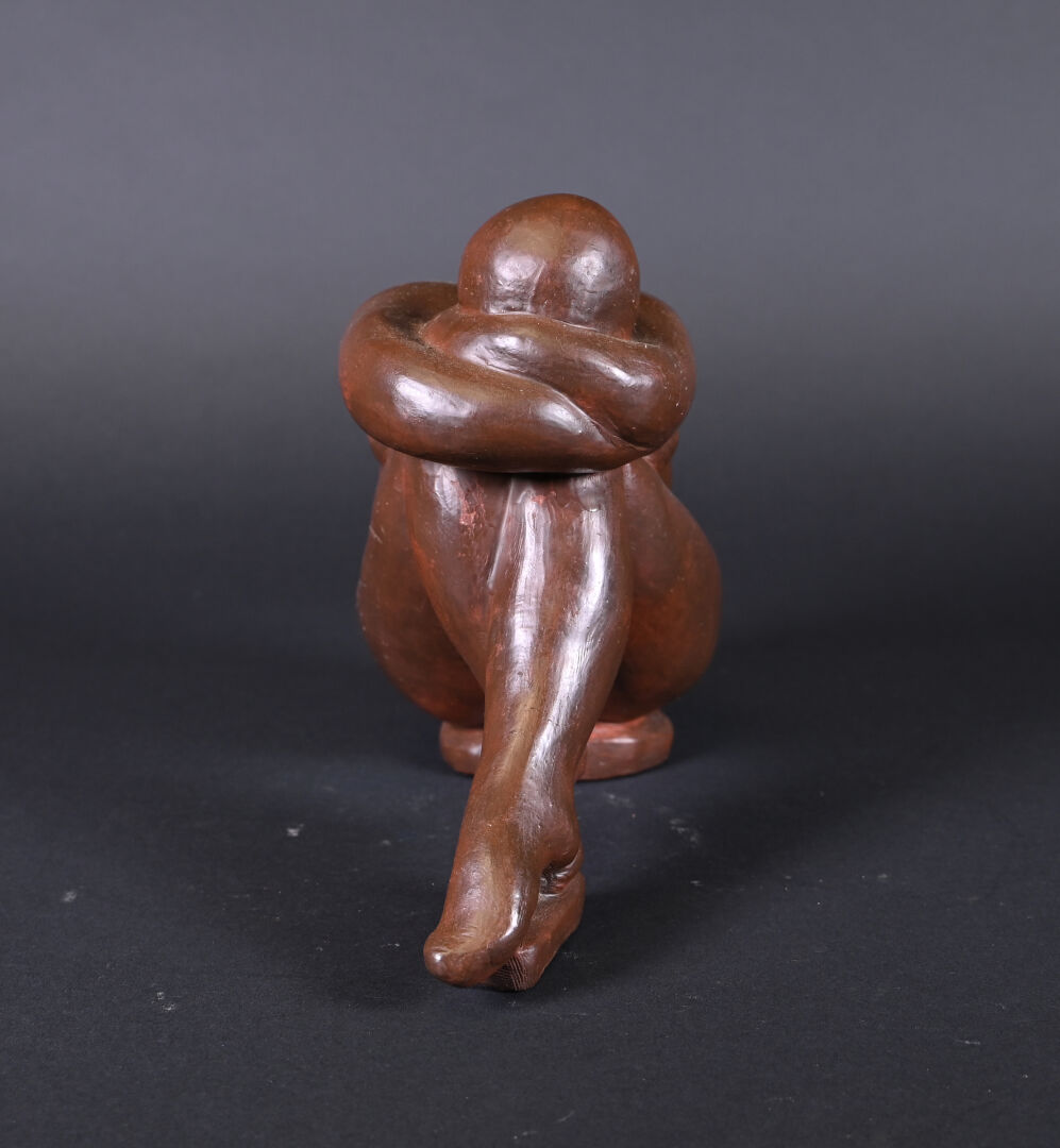 Nu féminin à genoux la tête posée sur les bras croisés en terre cuite peinte chocolat (quelques frottements, un fèle de cuisson). XXe siècle. Haut. : 23 cm.