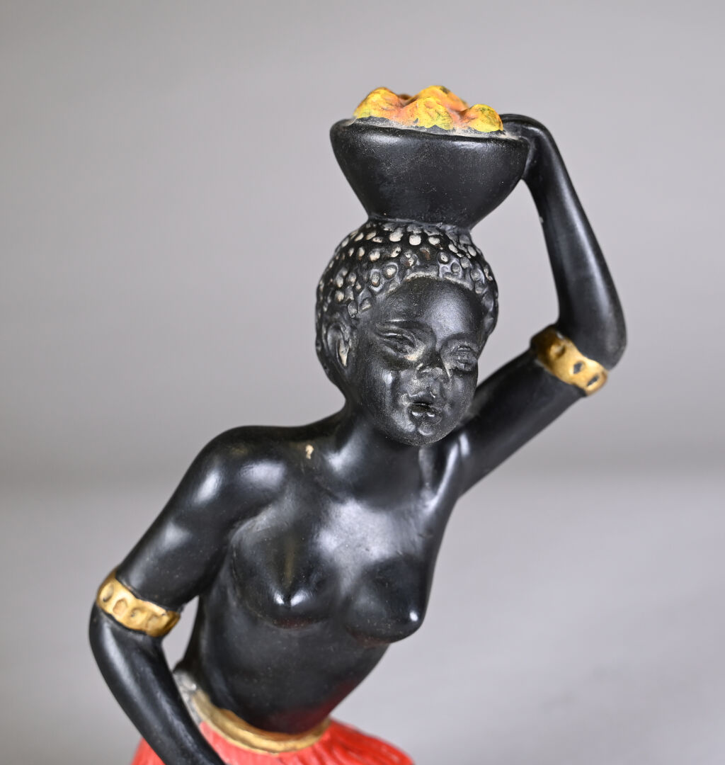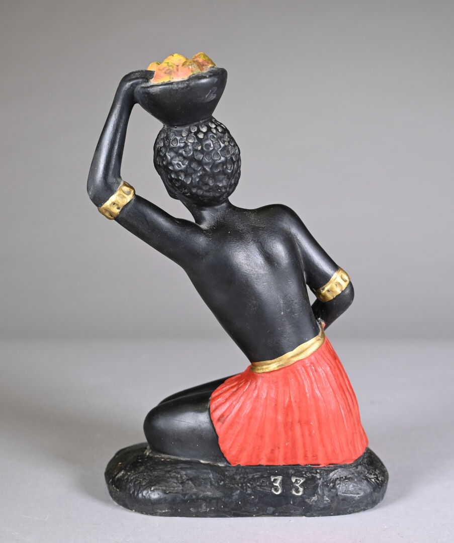 Nubienne à genoux au panier en plâtre polychrome. Vers 1960. Haut. : 28 cm.