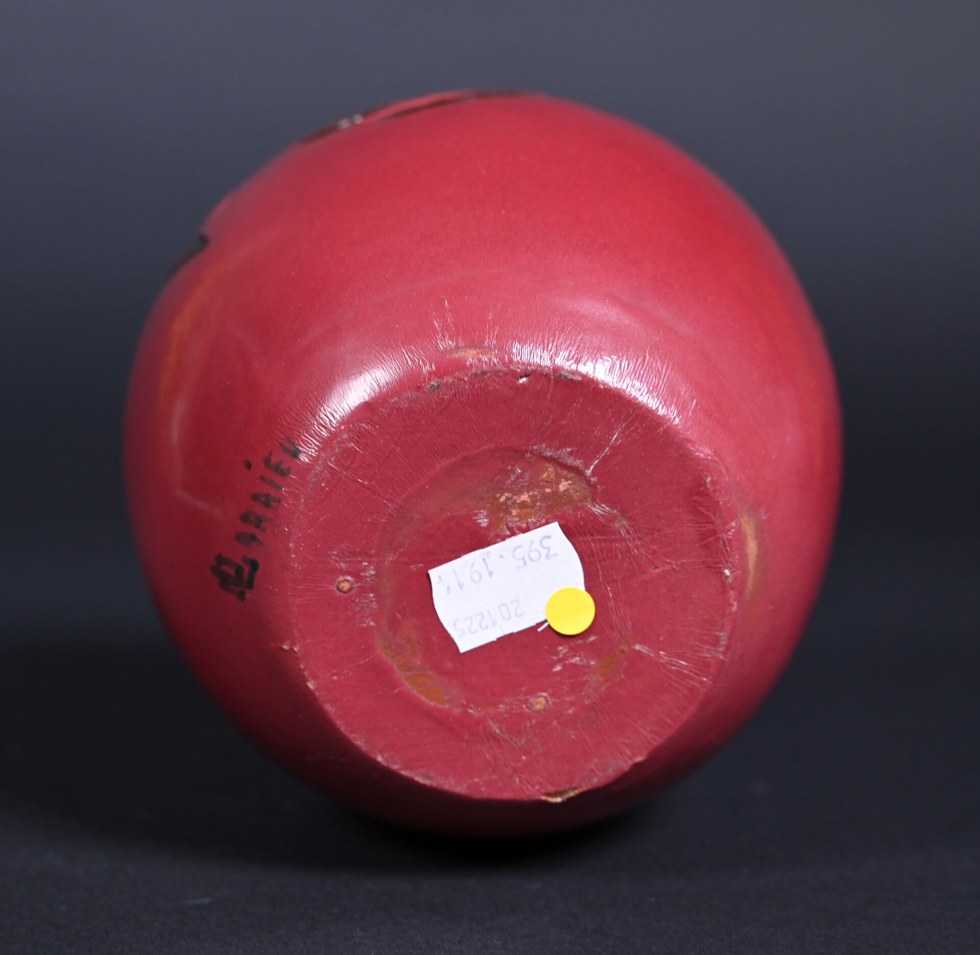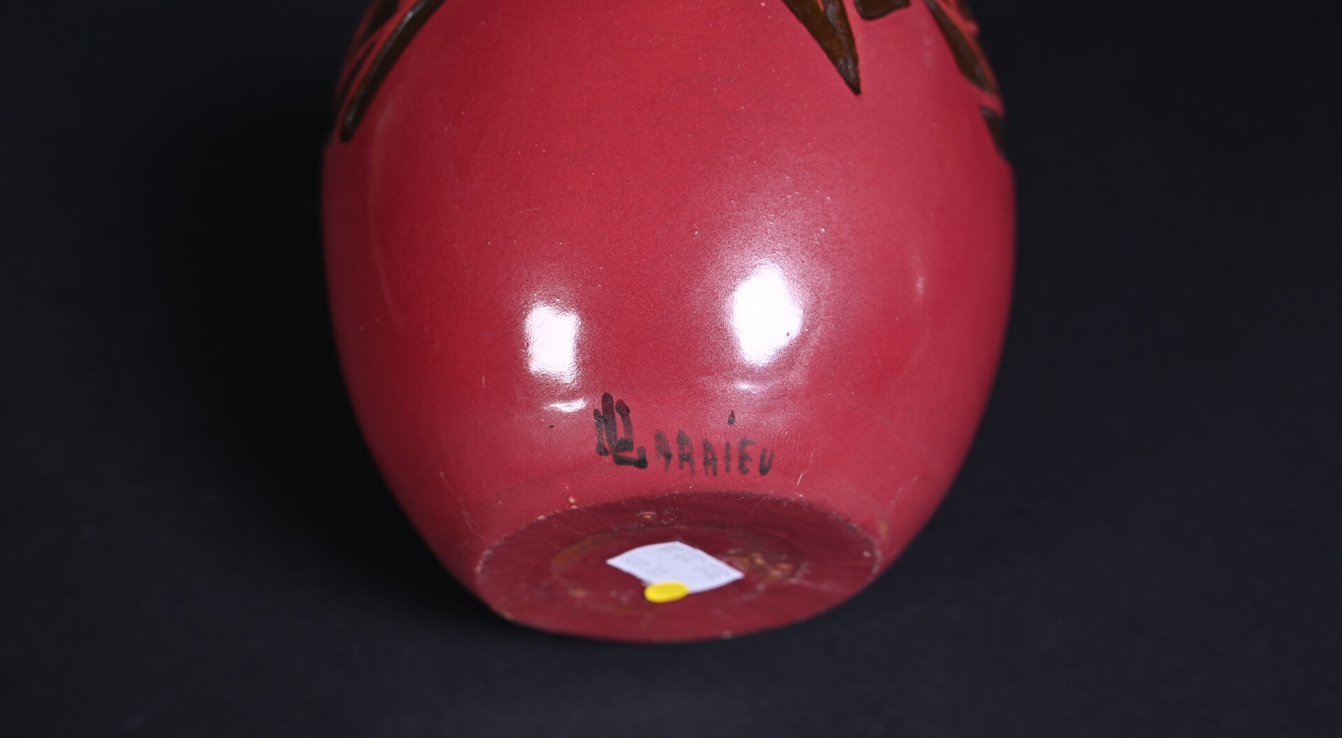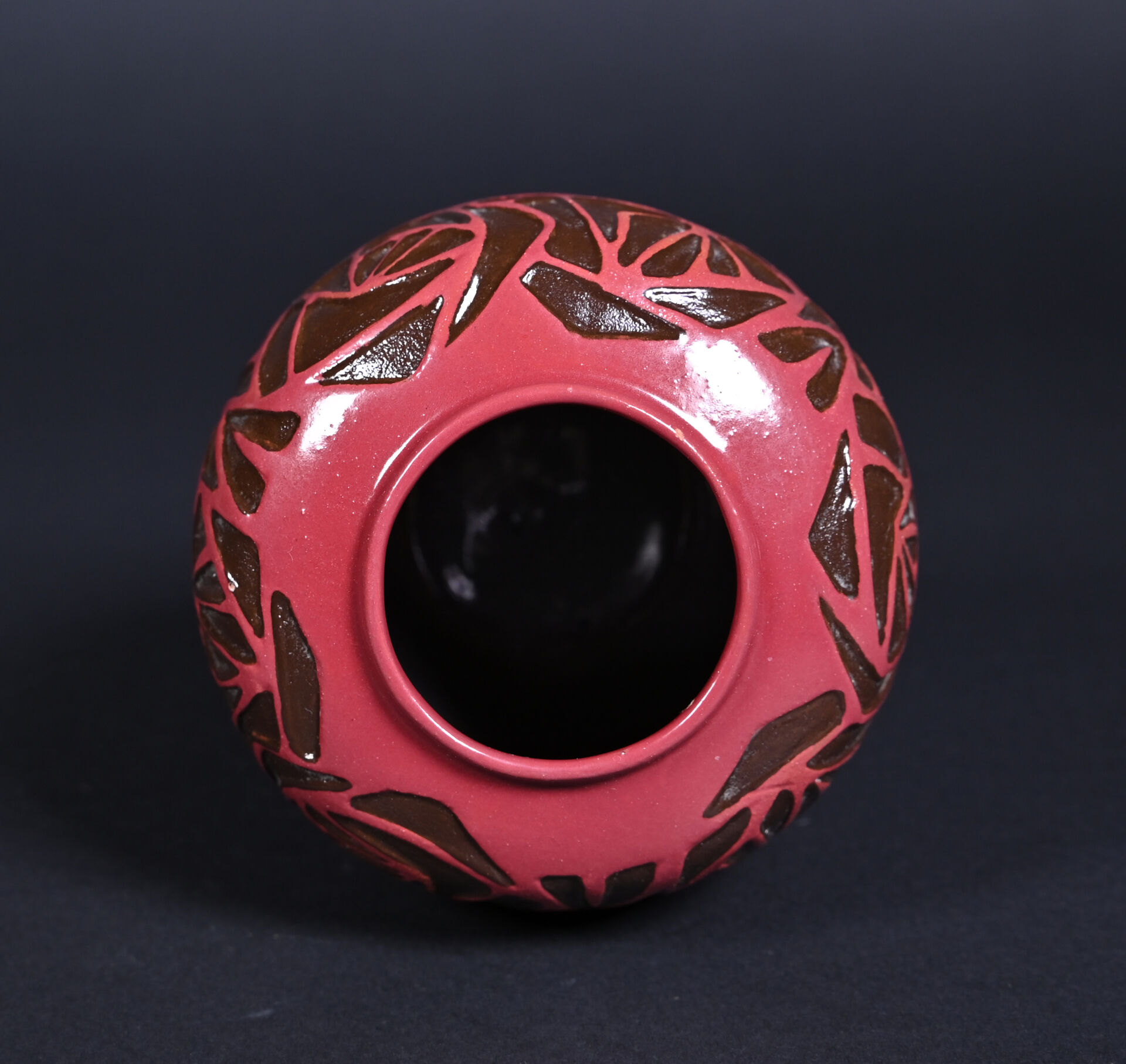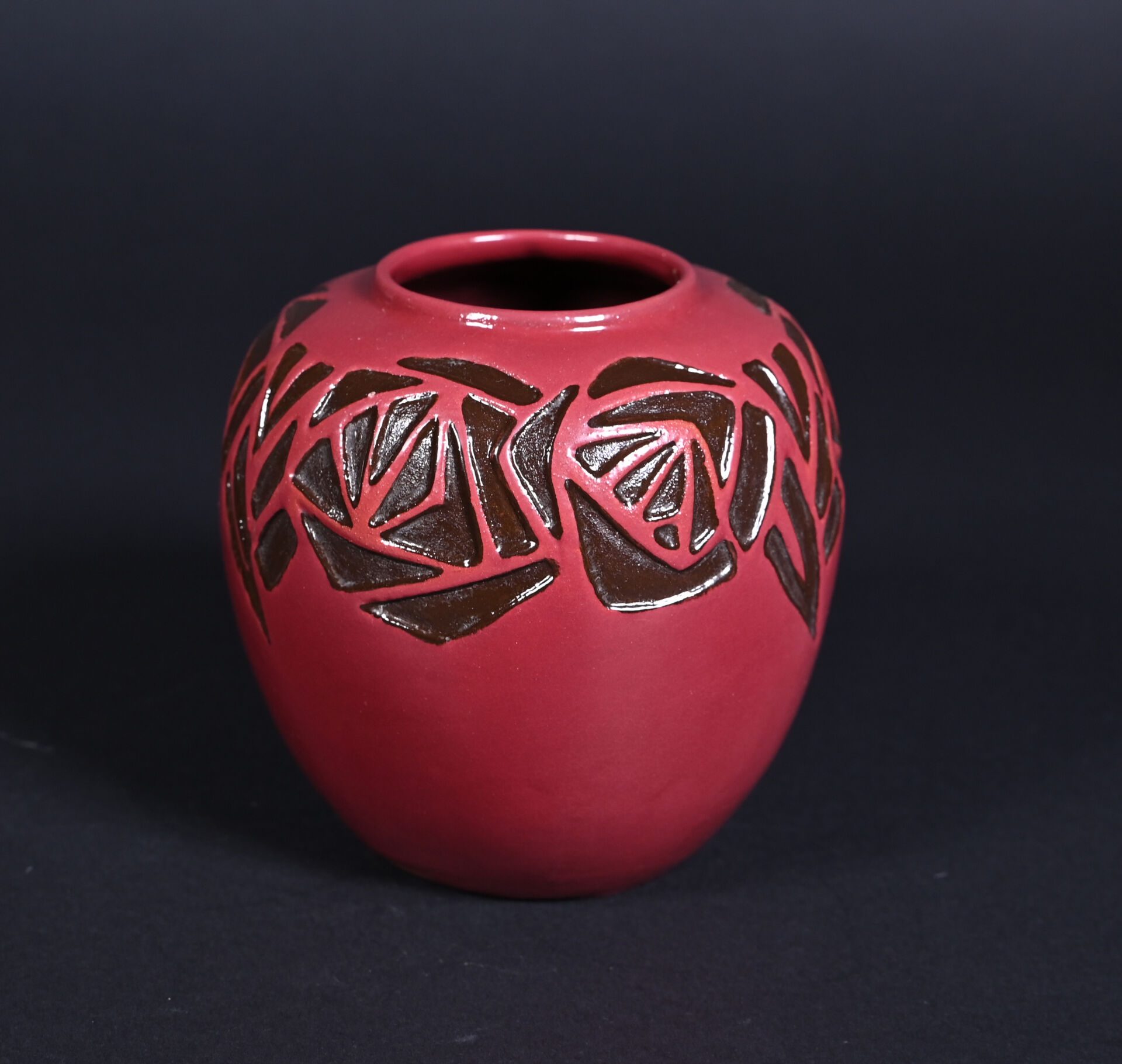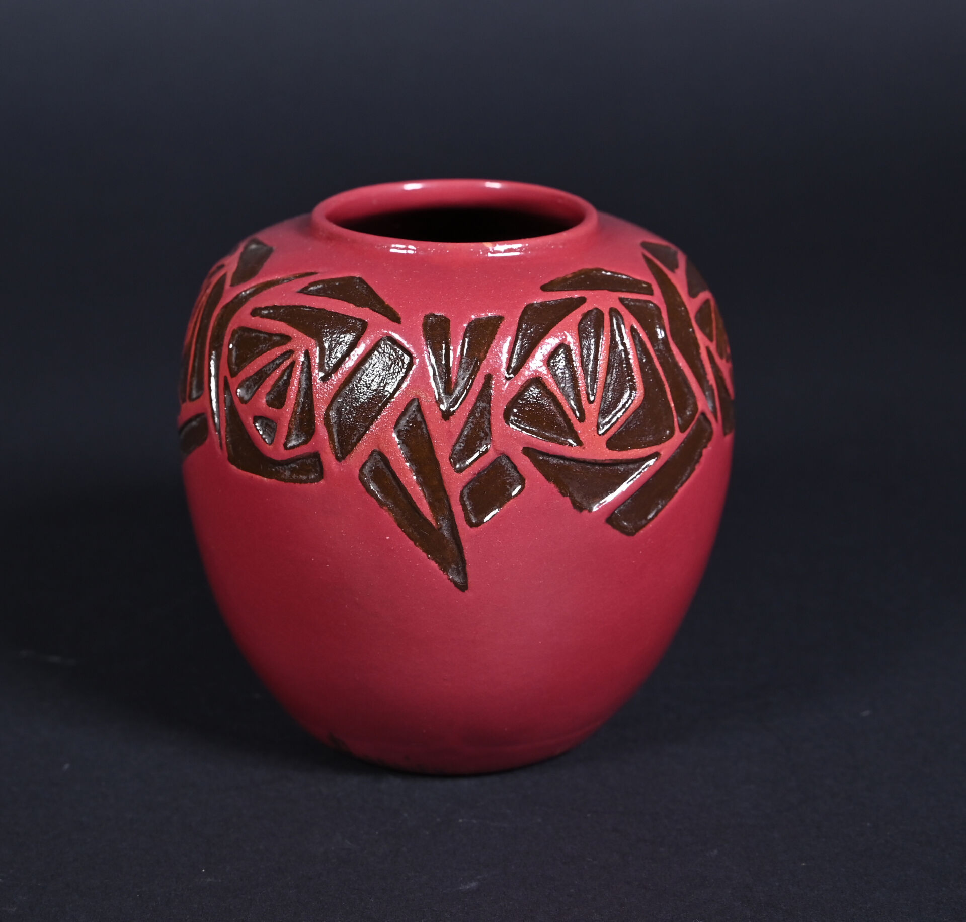 Octave LARRIEU (1881-1965). Vase ovoïde en céramique émaillée rouge orné d’une frise de fleurs stylisées en creux émaillée brun (petit éclat à l’émail à la base). Signé à la base. Haut. : 14,5 cm.