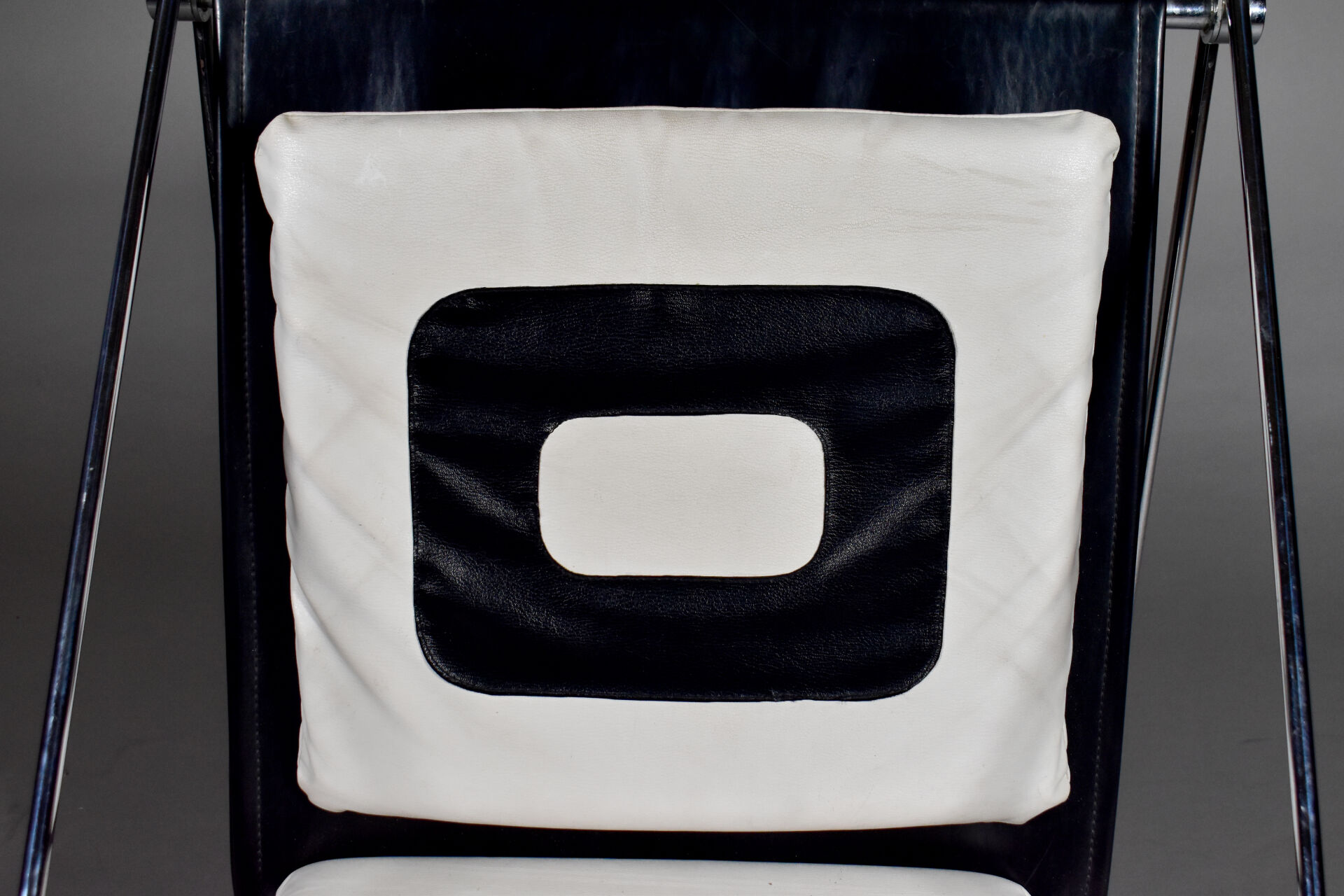 Odile MIR ( Née en 1926) pour PRISUNIC. Chauffeuse « Triangle » en métal chromé tubulaire et garniture de cuir noir et les coussins en simili noir et blanc. (usures d’usage au niveau du cuir, coussin de l’assise sans ses boutons de pression, jonction assise/dossier légèrement décousue). Haut. : 75 cm.