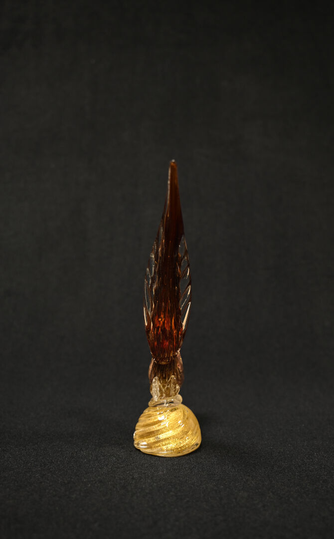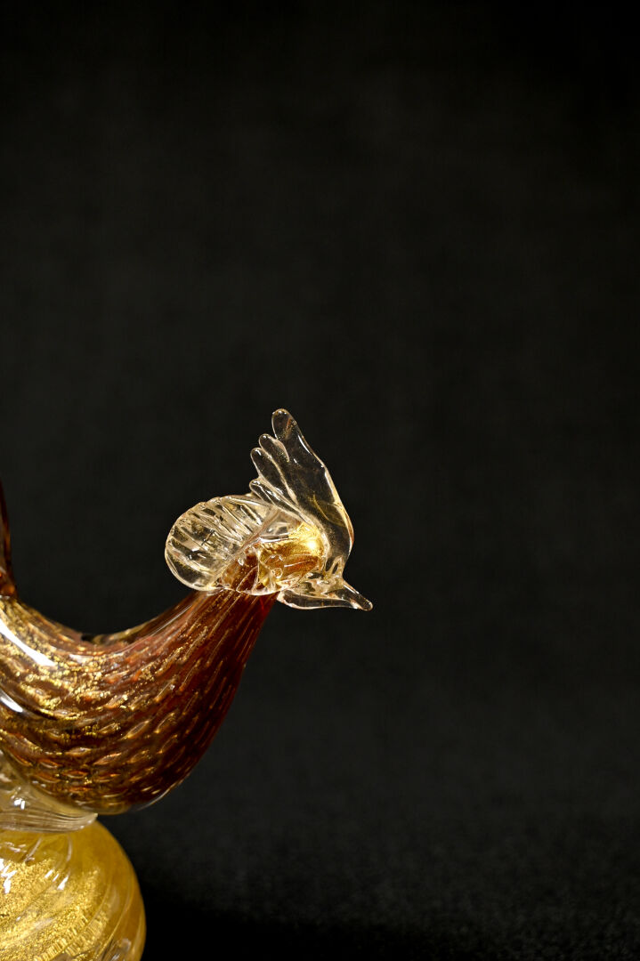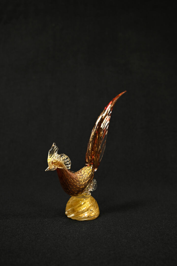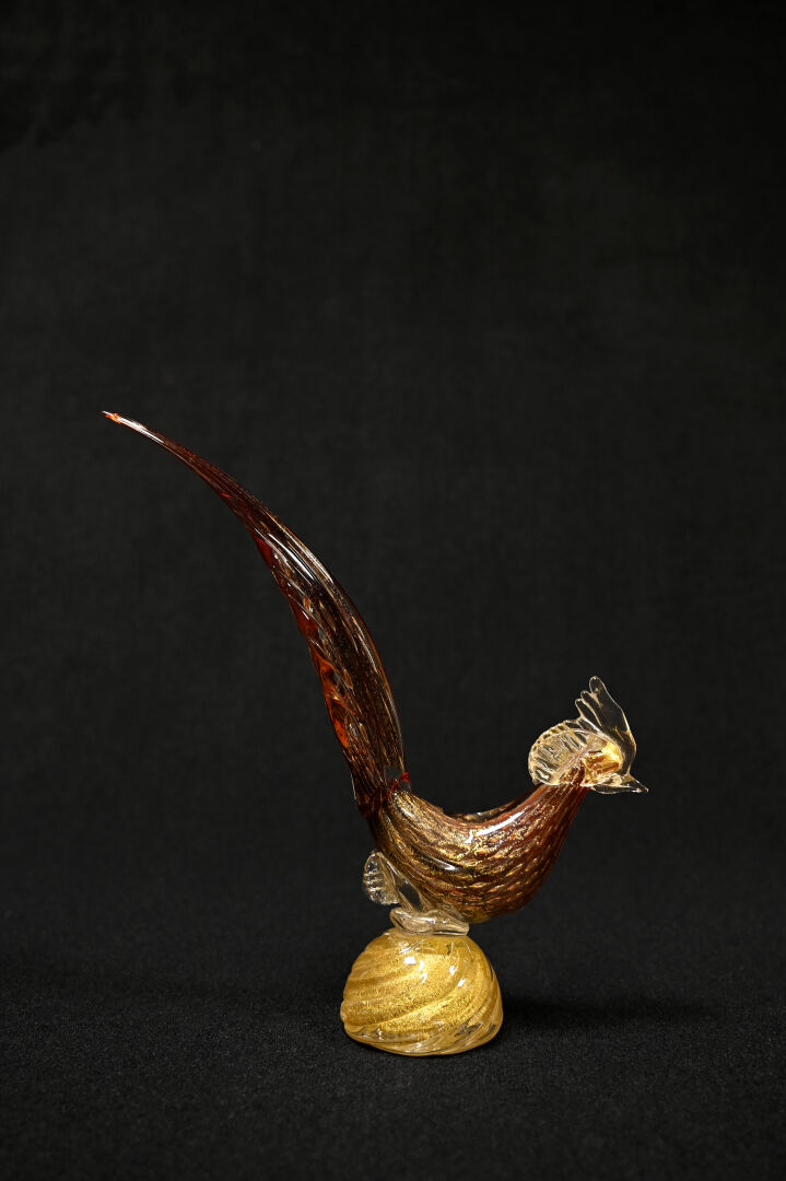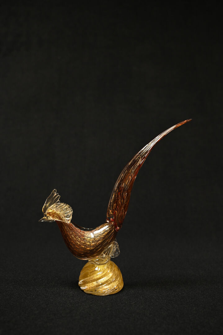 Oiseau en verre bullé, rouge et paillons or. Murano, XXe siècle. Haut. : 34 cm.