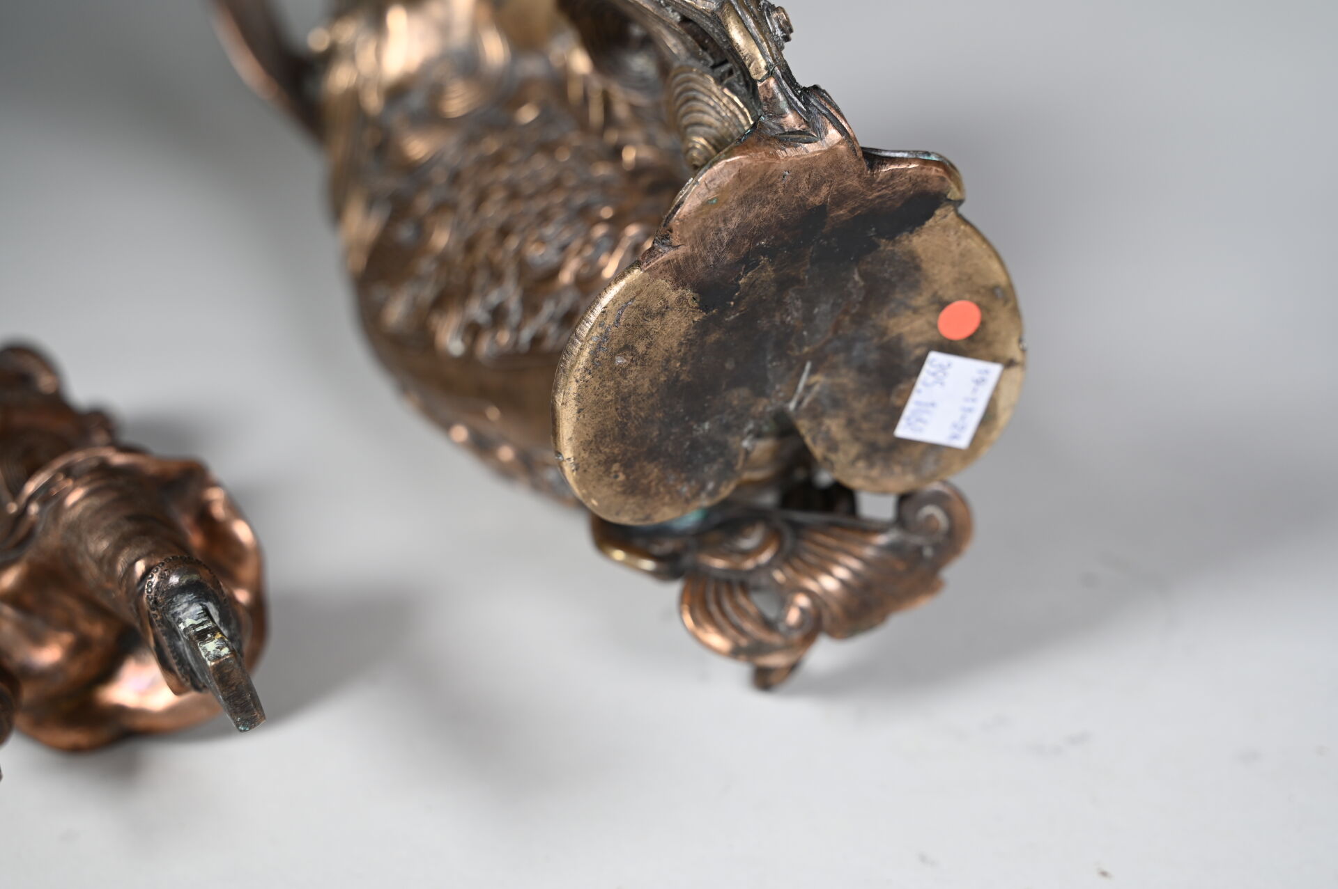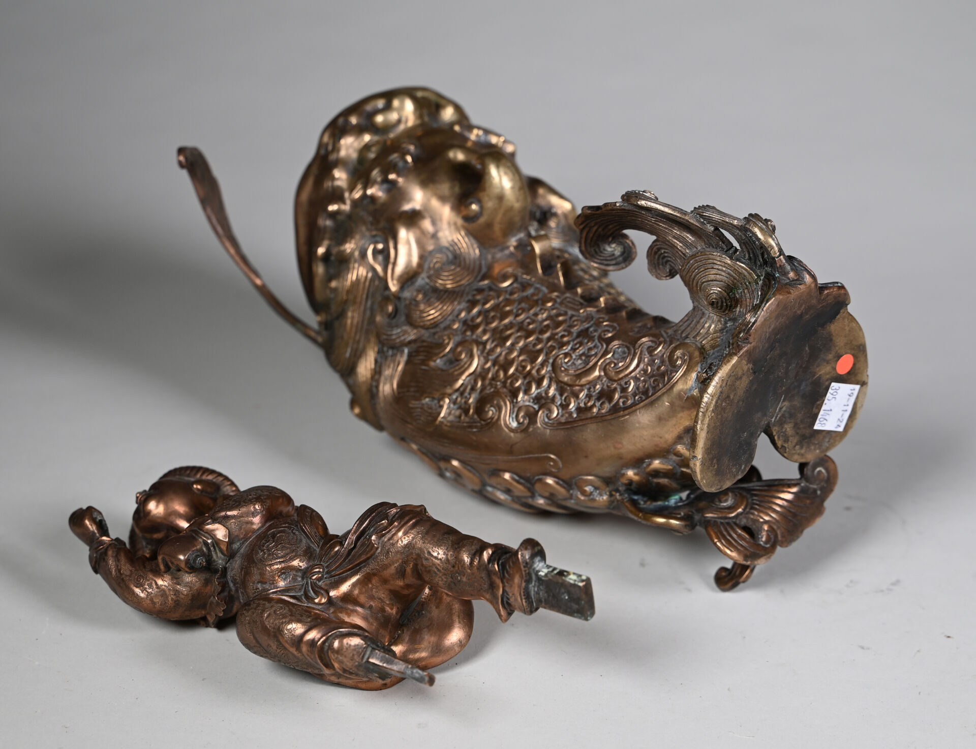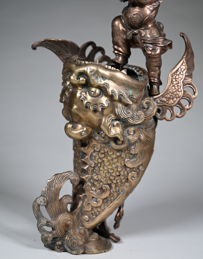 Okimono en bronze légèrement patiné représentant un petit pêcheur sur une carpe à bouche ouverte. Japon, début du XXe siècle. Haut. : 45 cm.