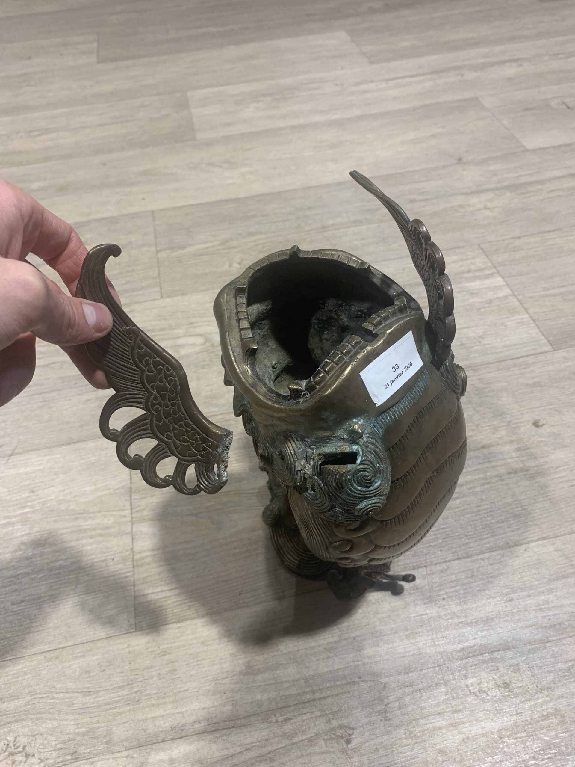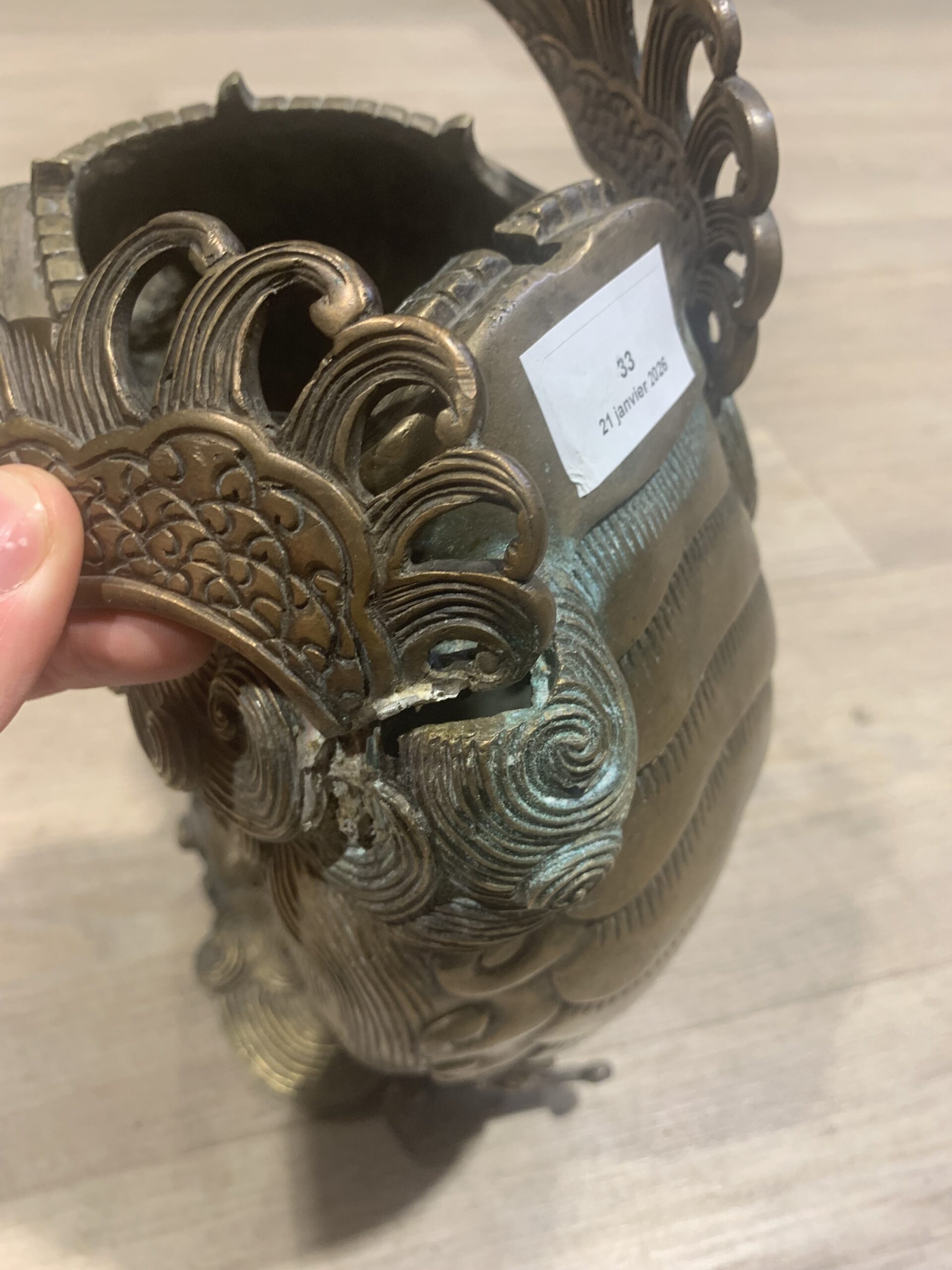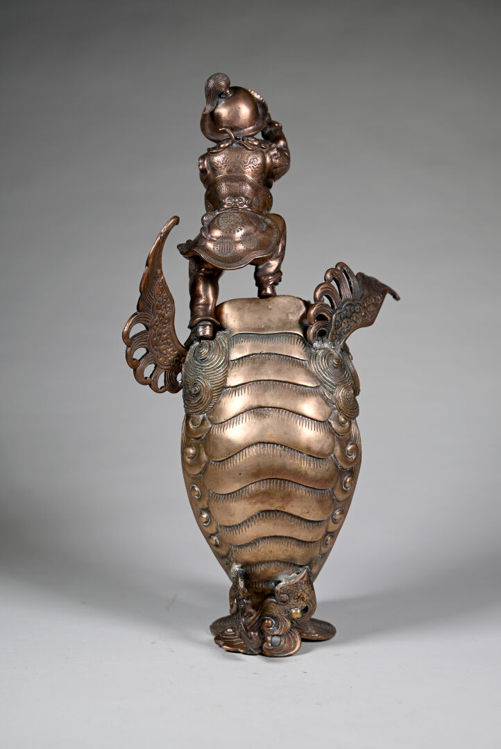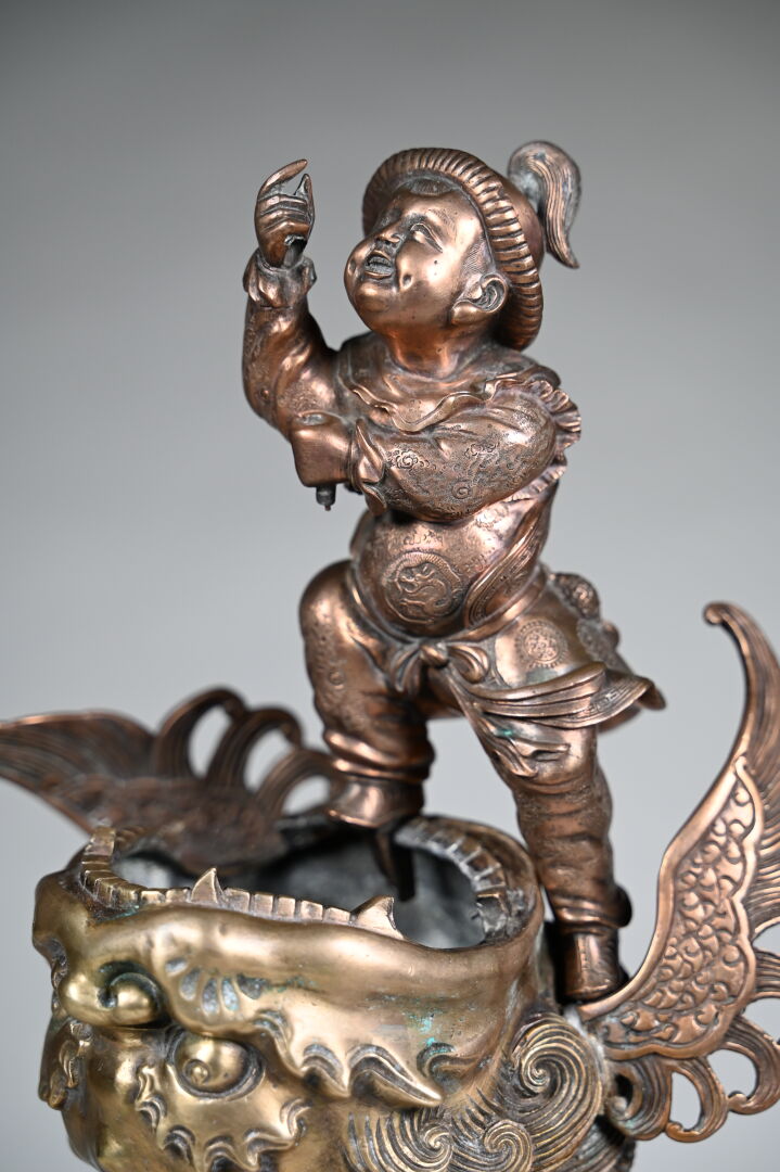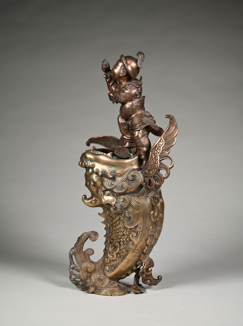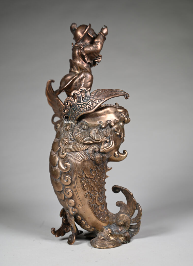 Okimono en bronze légèrement patiné représentant un petit pêcheur sur une carpe à bouche ouverte (accident juste avant la vente : une nageoire à ressouder, voir deuxième photo). Japon, début du XXe siècle. Haut. : 45 cm.